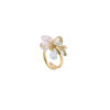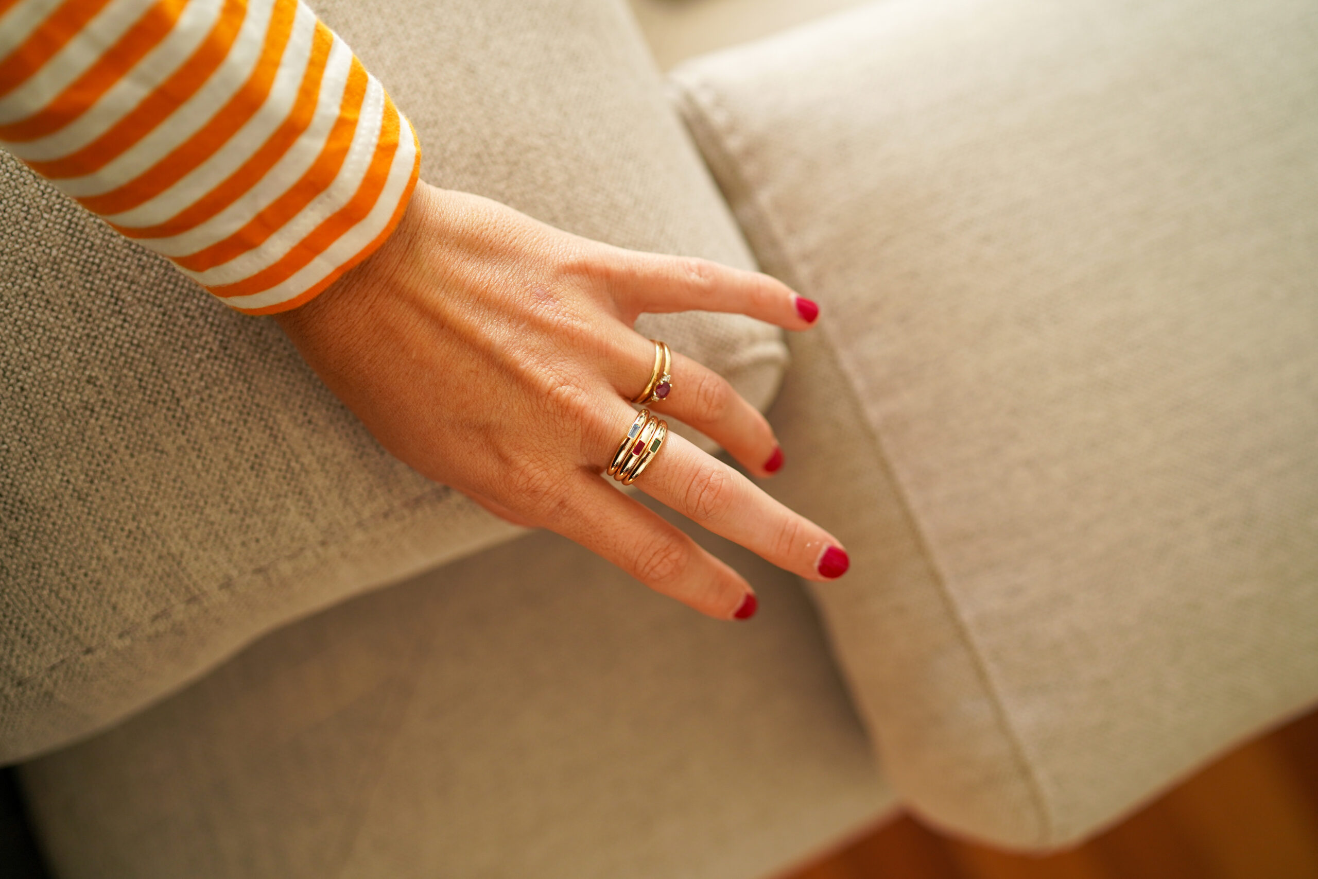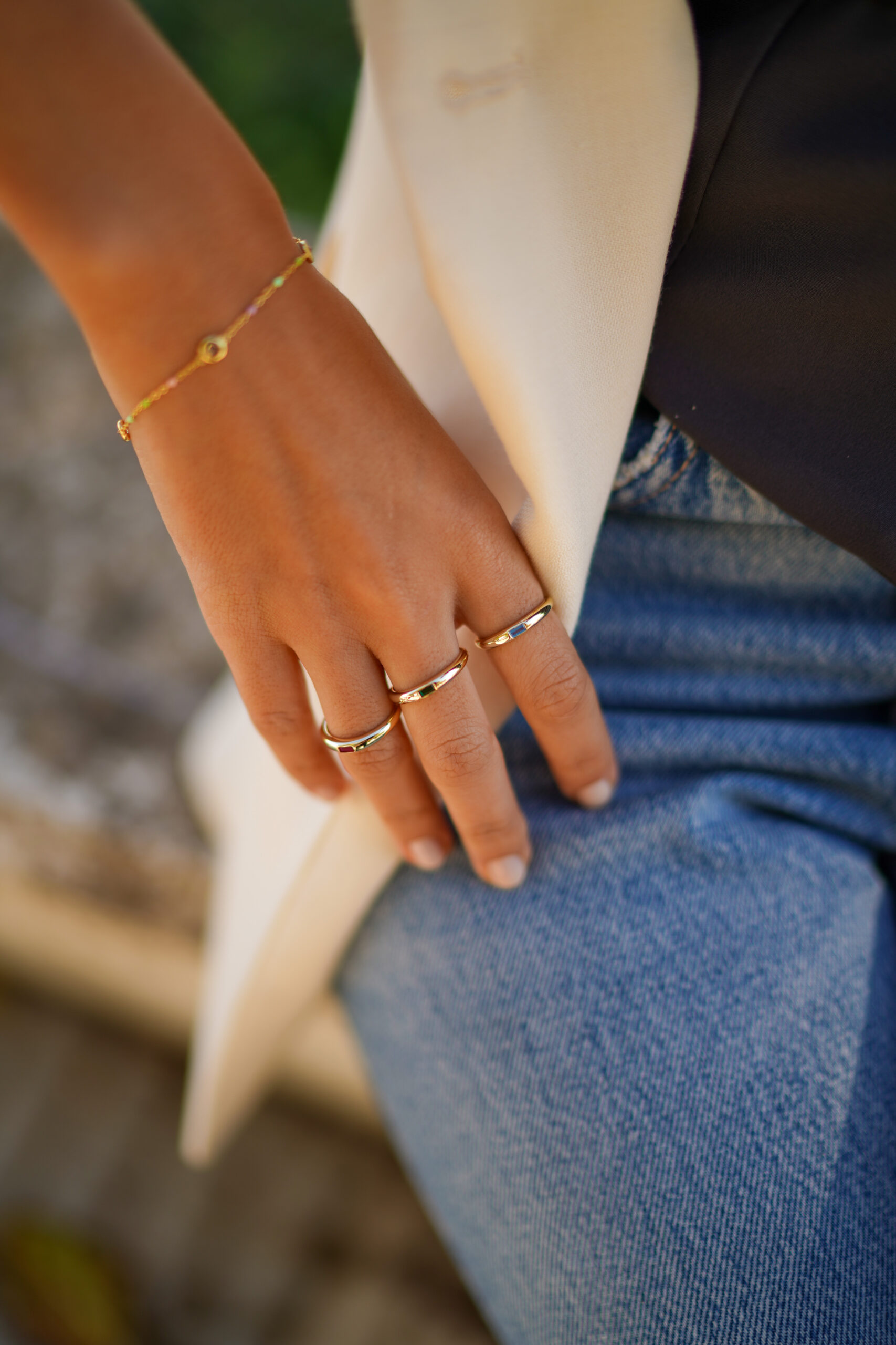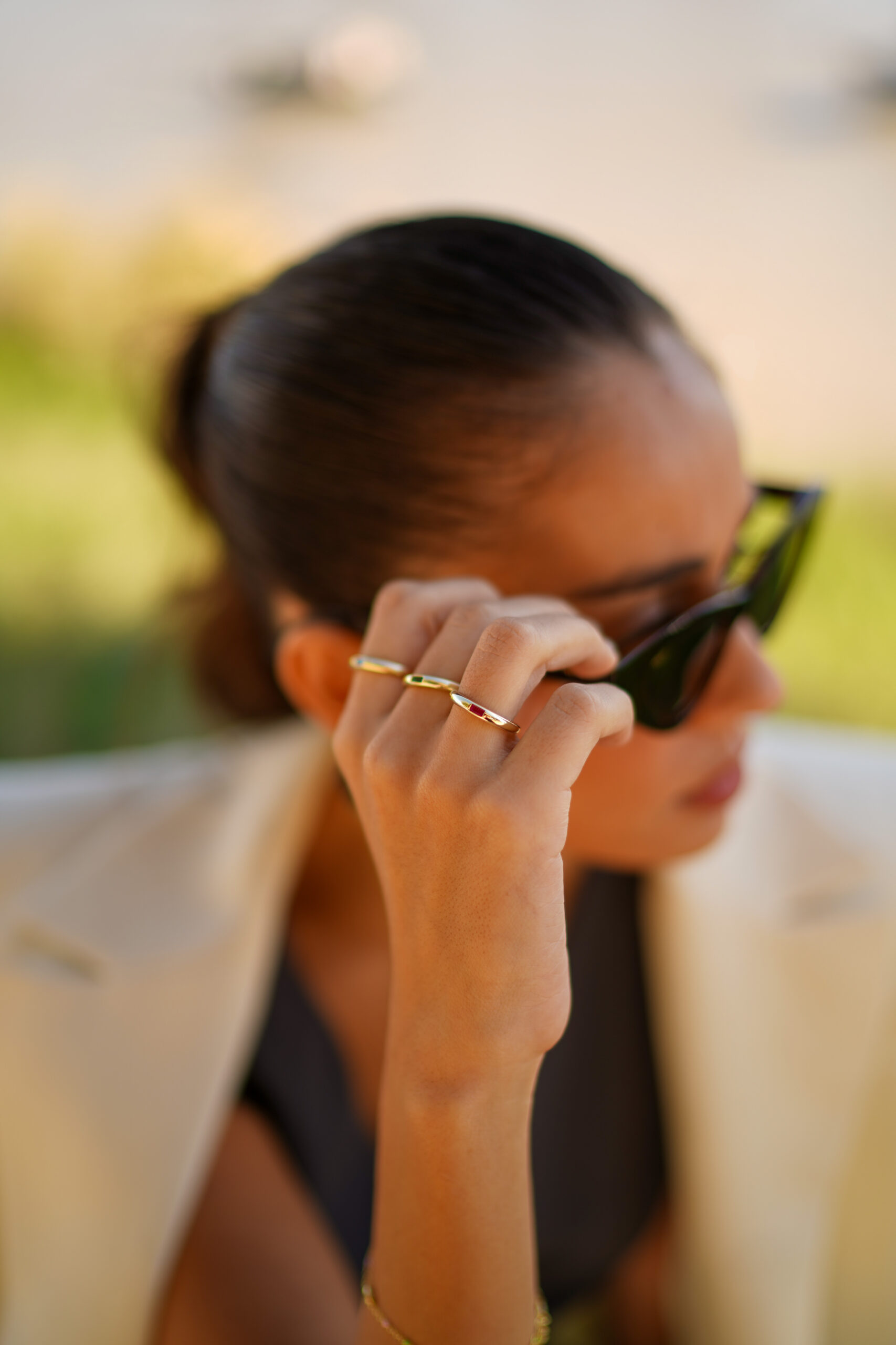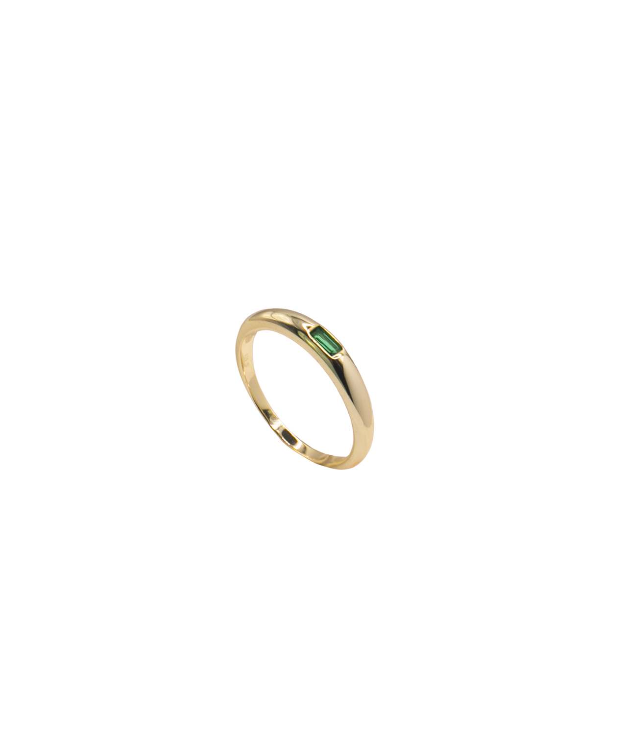 Anillo en plata de ley chapado en oro con circonita central en talla baguette de color verde.