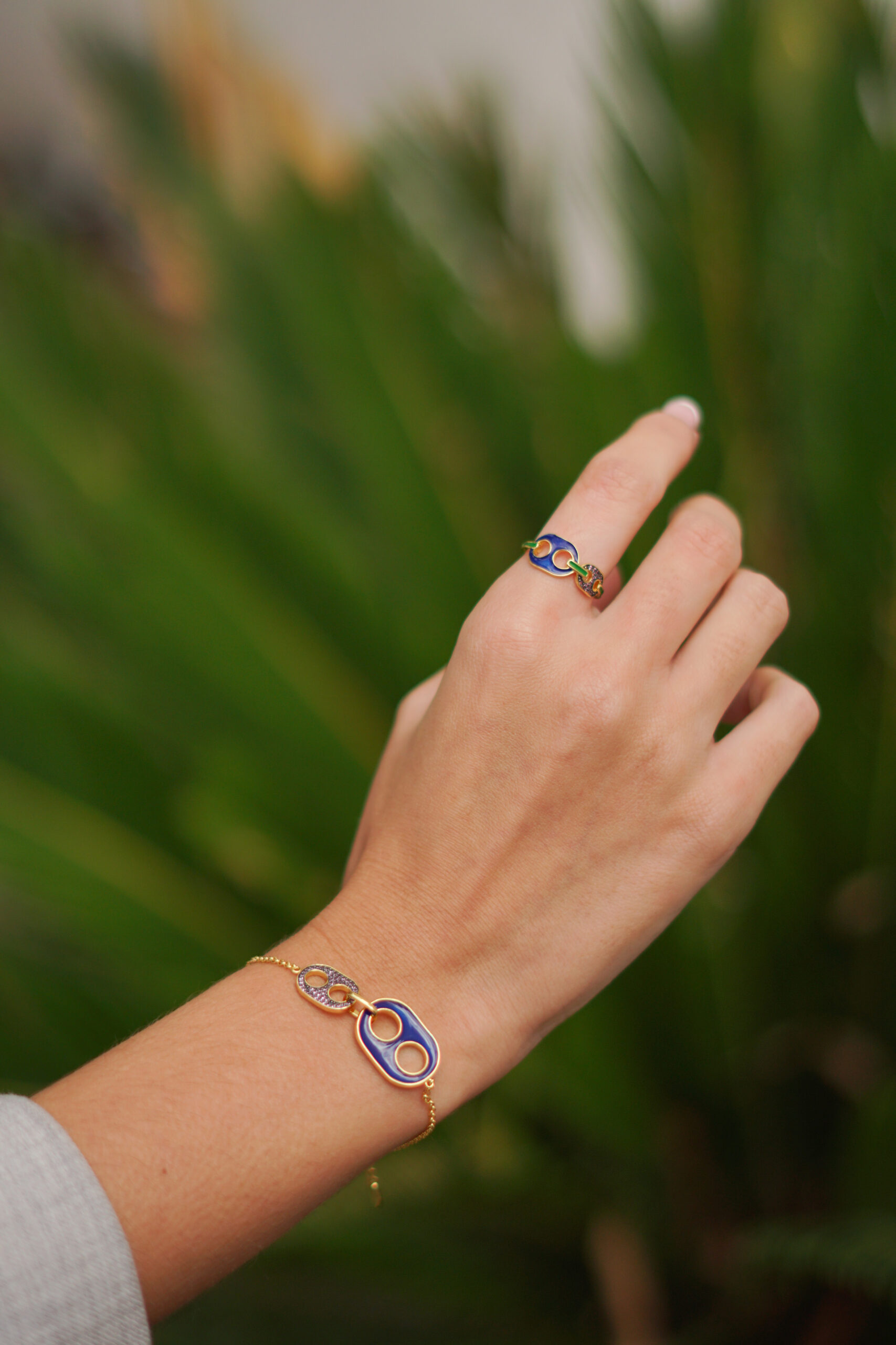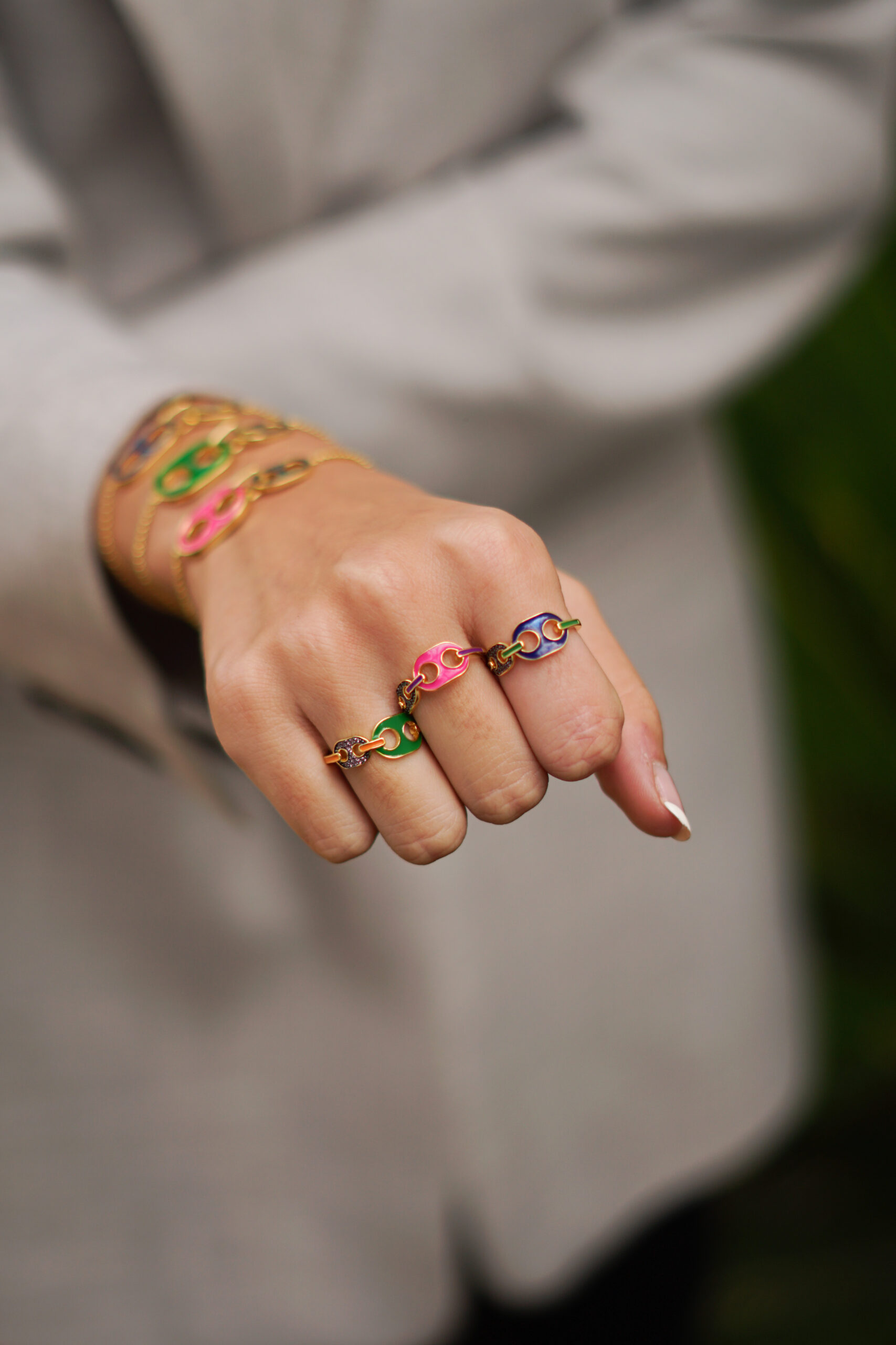 Anillo en plata de ley chapado en oro con dos motivos enlazados en la parte superior, uno de esmalte azul y el segundo de circonitas rosas y esmalte verde en las uniones.