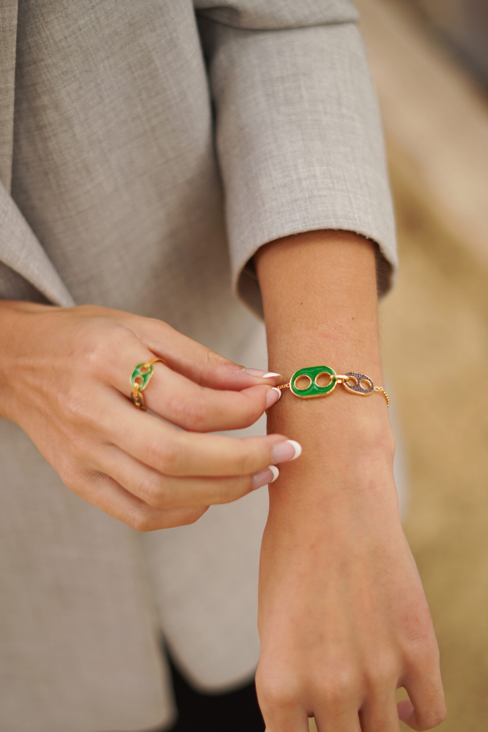 Anillo en plata de ley chapado en oro con dos motivos enlazados en la parte superior, uno de esmalte verde y el segundo de circonitas rosas y esmalte naranja en las uniones.