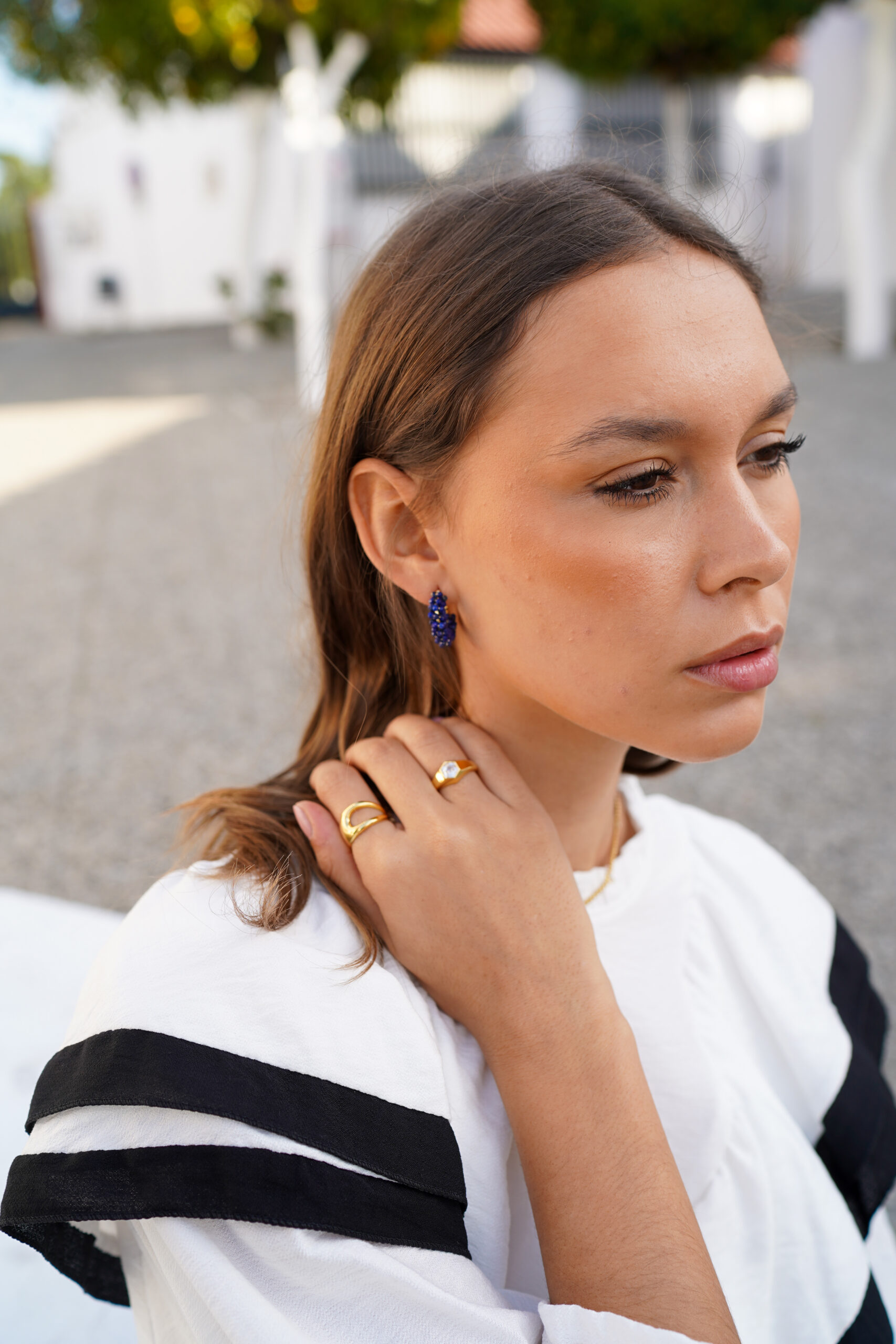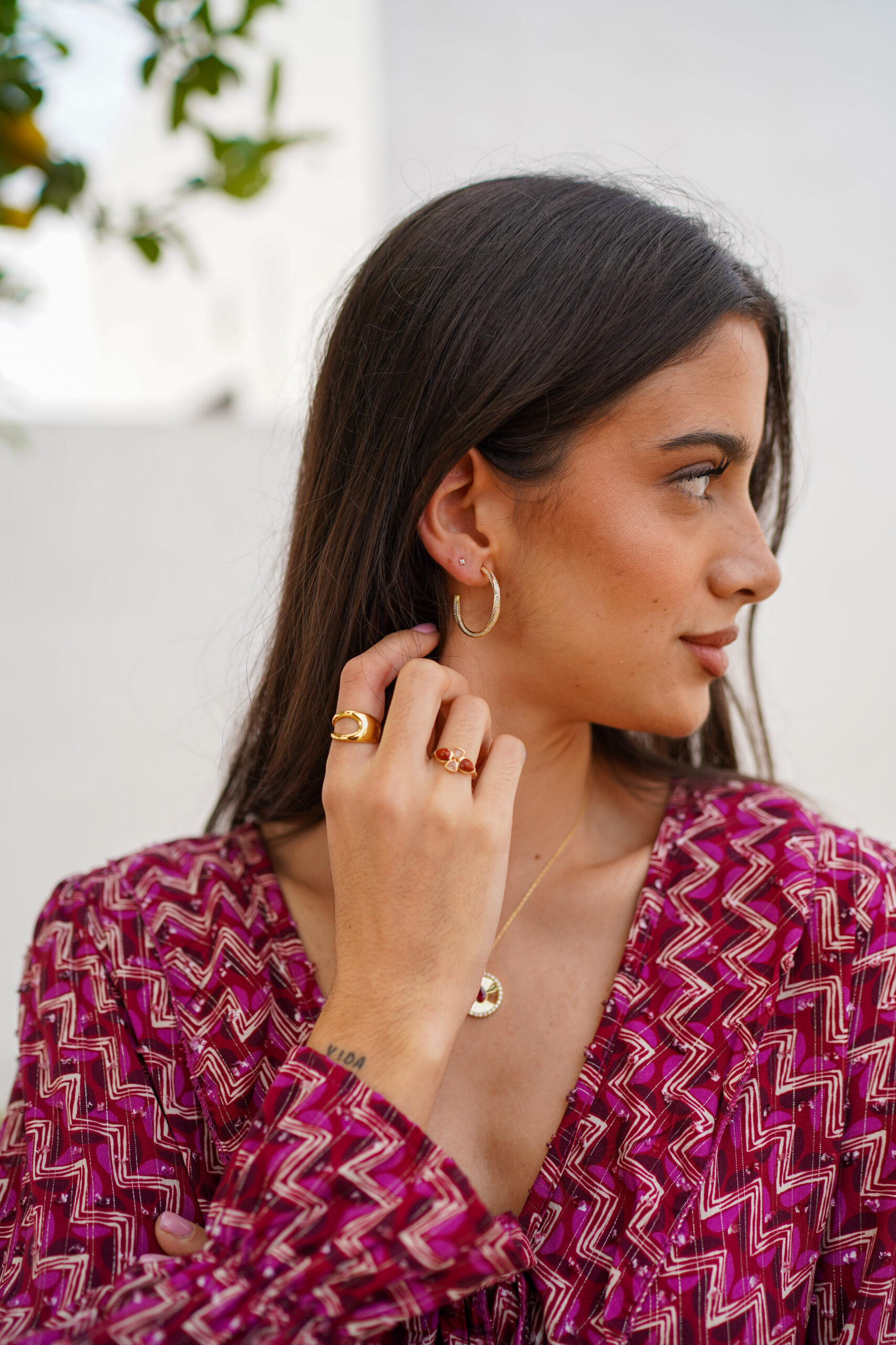 Anillo de plata de ley chapada en oro con un diseño minimalista y contemporáneo. Su estructura abierta y curva crea una apariencia moderna que combina líneas fluidas y elegancia. Este anillo es el complemento ideal para un look sofisticado y versátil, perfecto para el día a día o para ocasiones especiales.