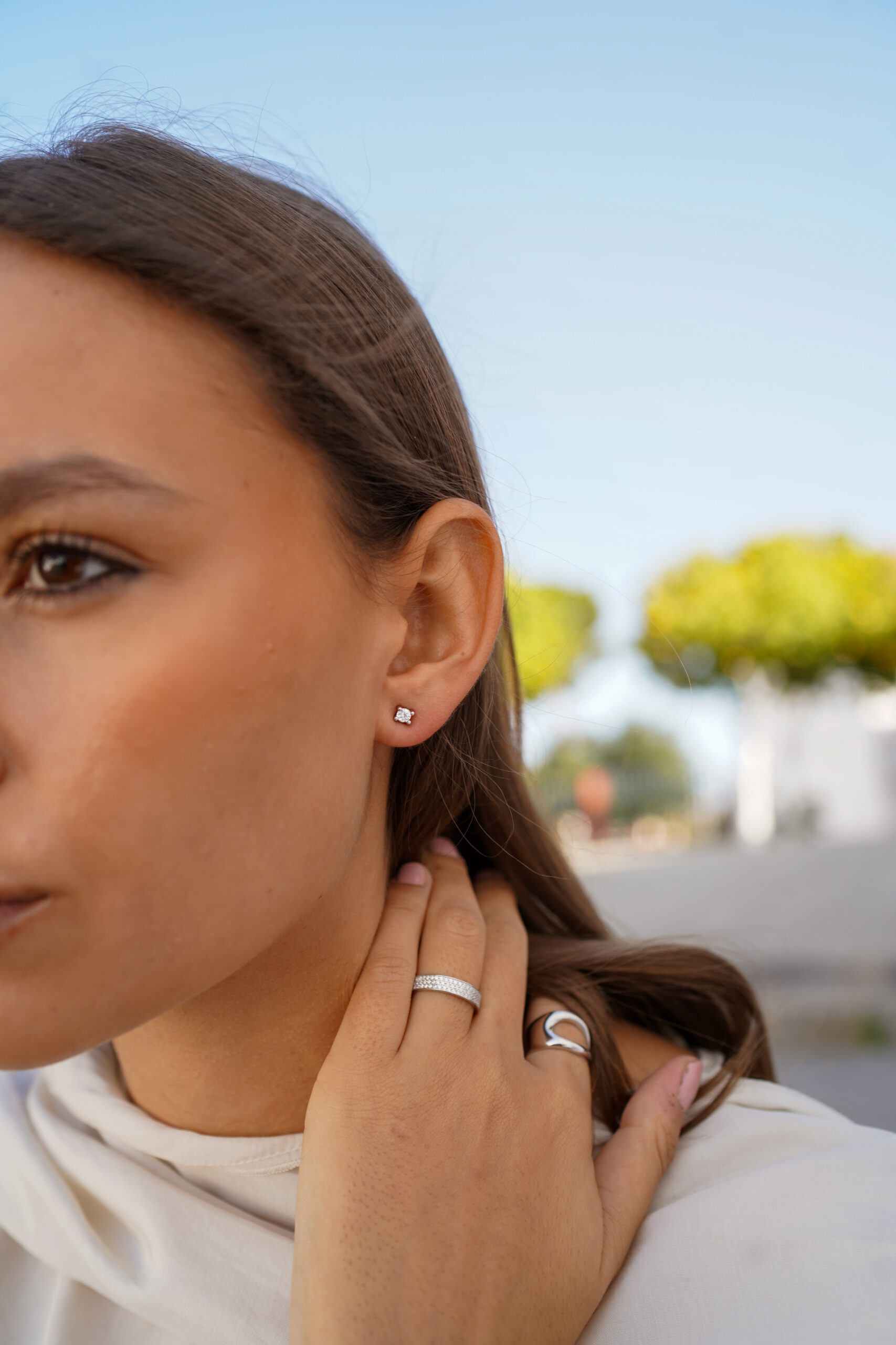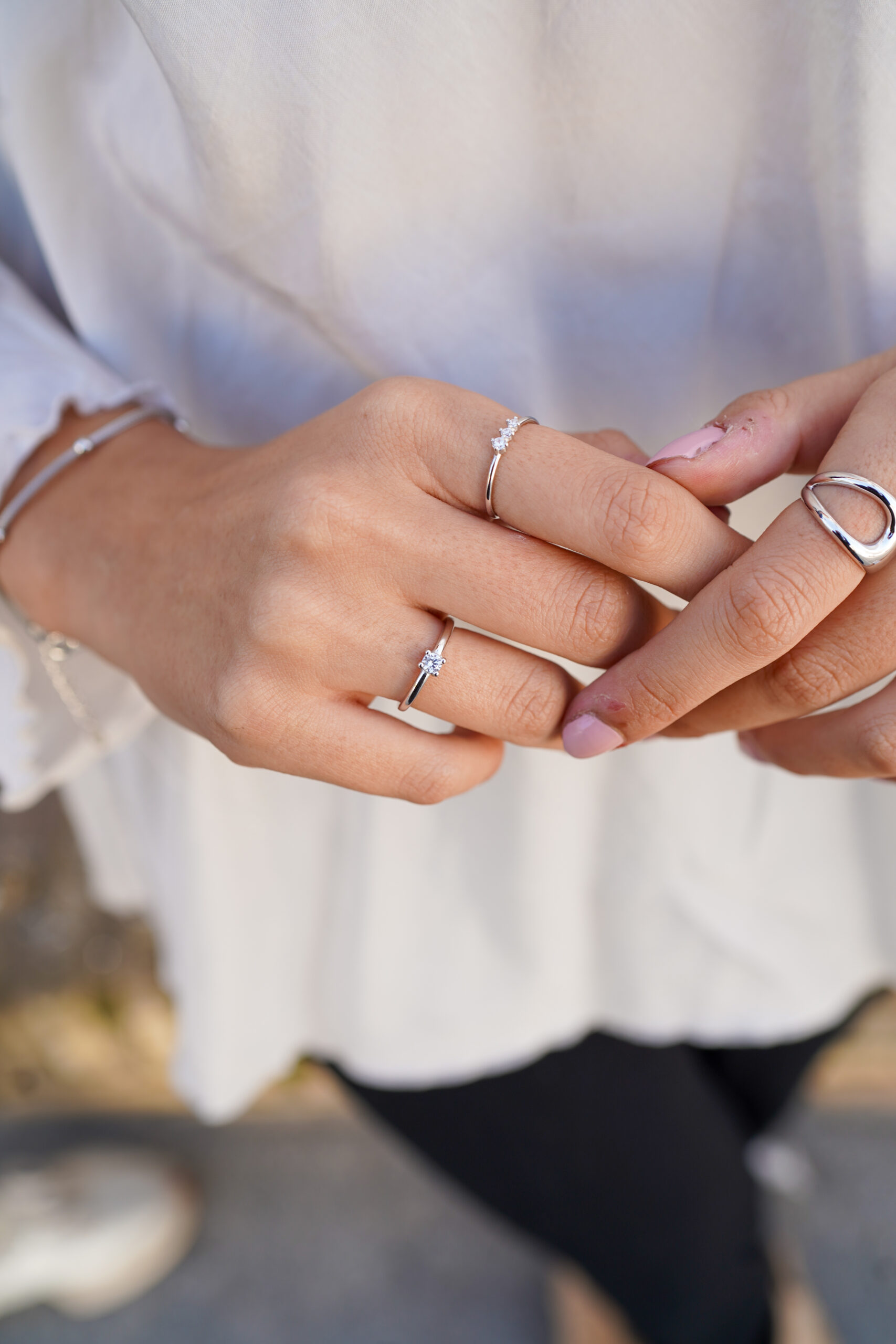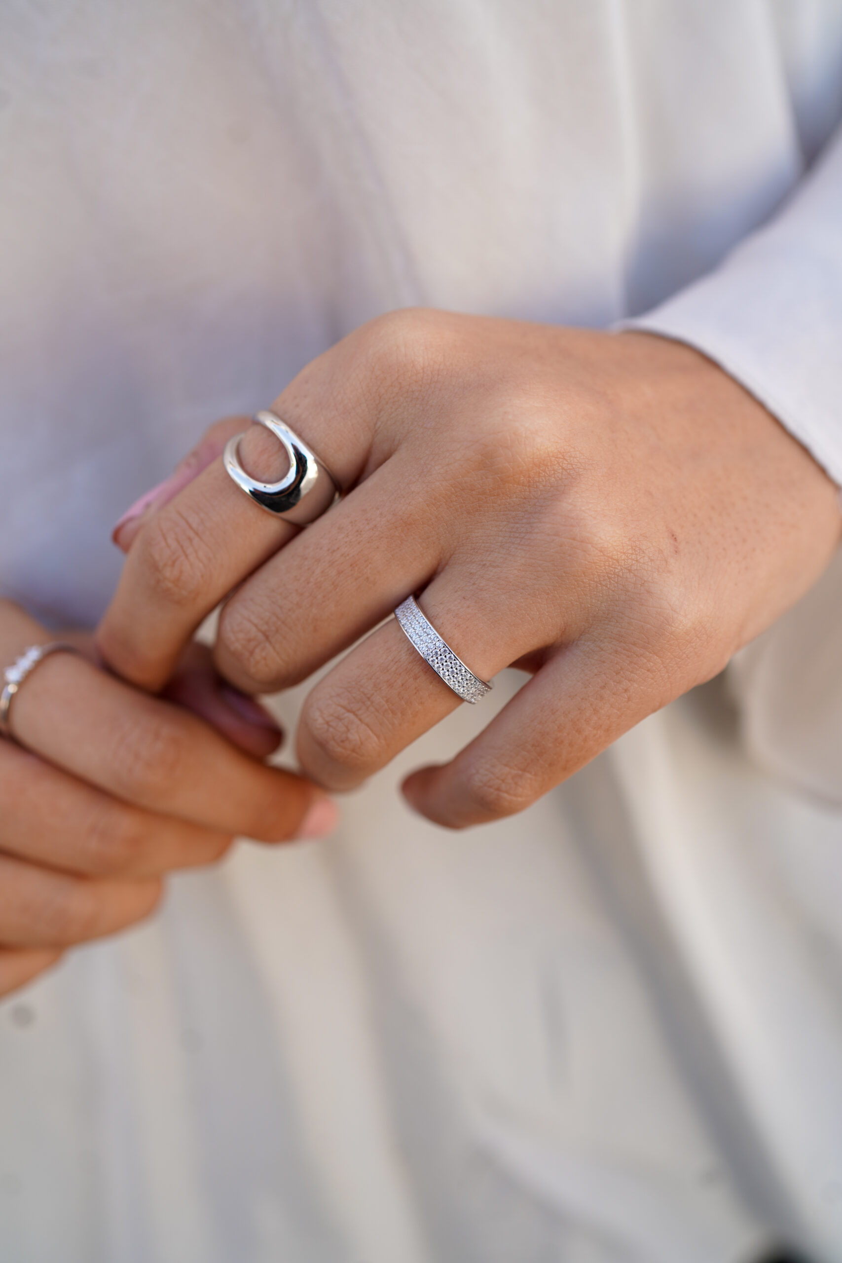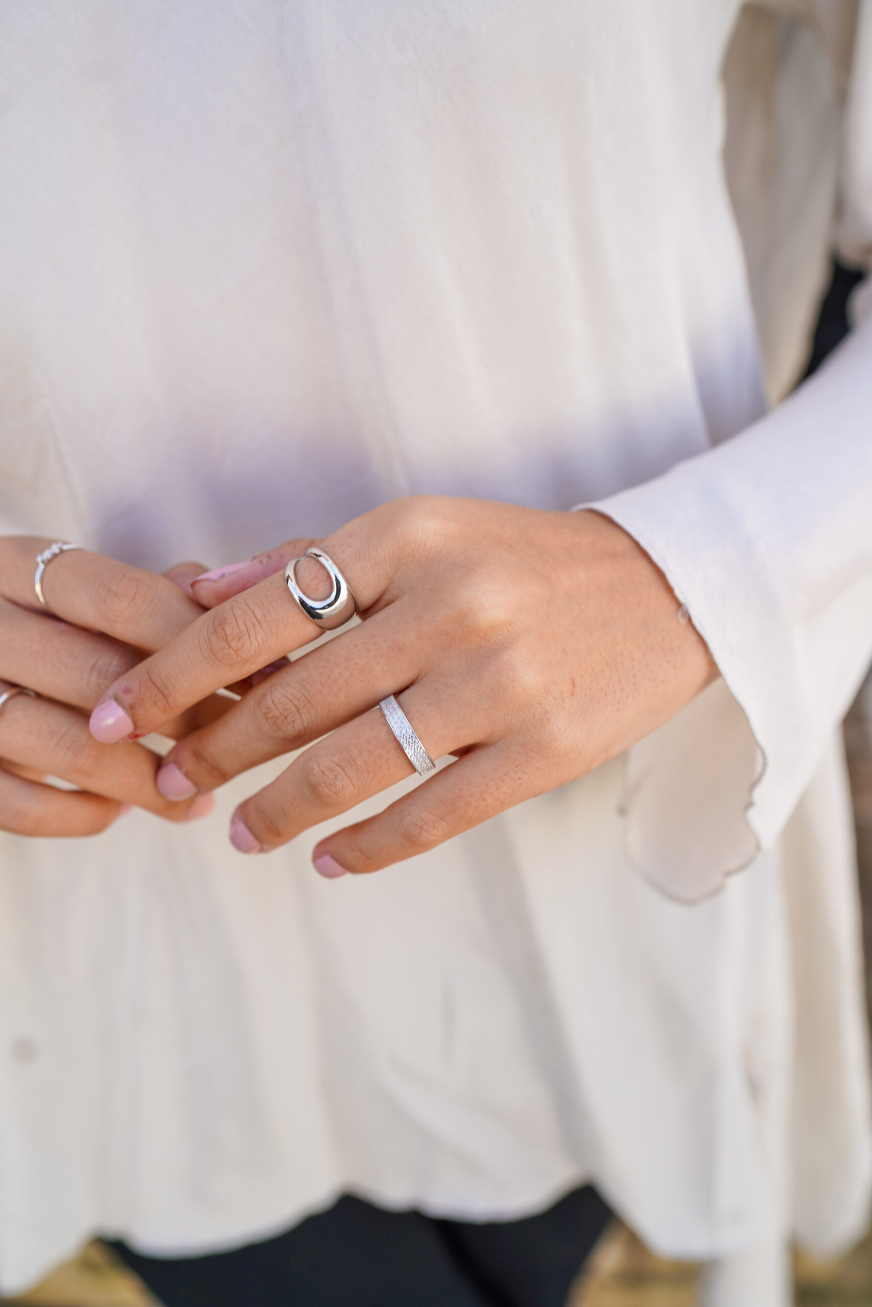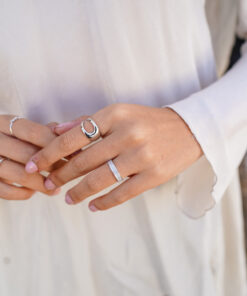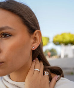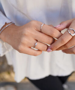 Anillo de plata de ley con un diseño minimalista y contemporáneo. Su estructura abierta y curva crea una apariencia moderna que combina líneas fluidas y elegancia. Este anillo es el complemento ideal para un look sofisticado y versátil, perfecto para el día a día o para ocasiones especiales.