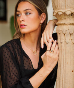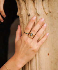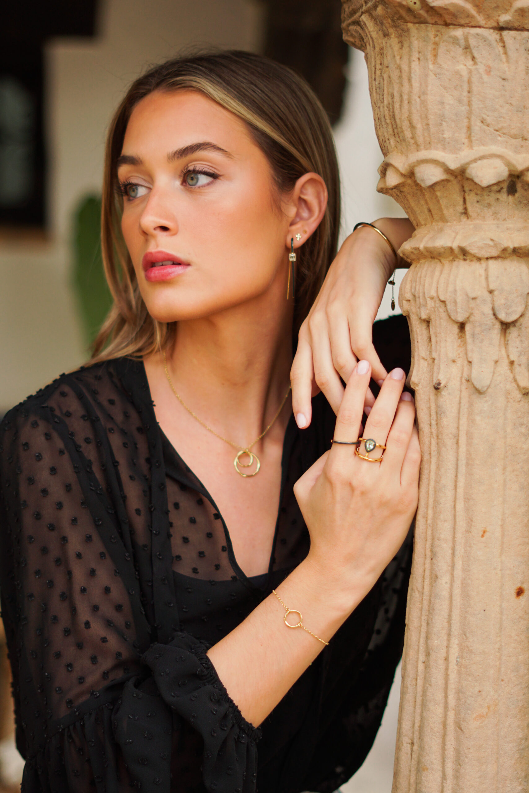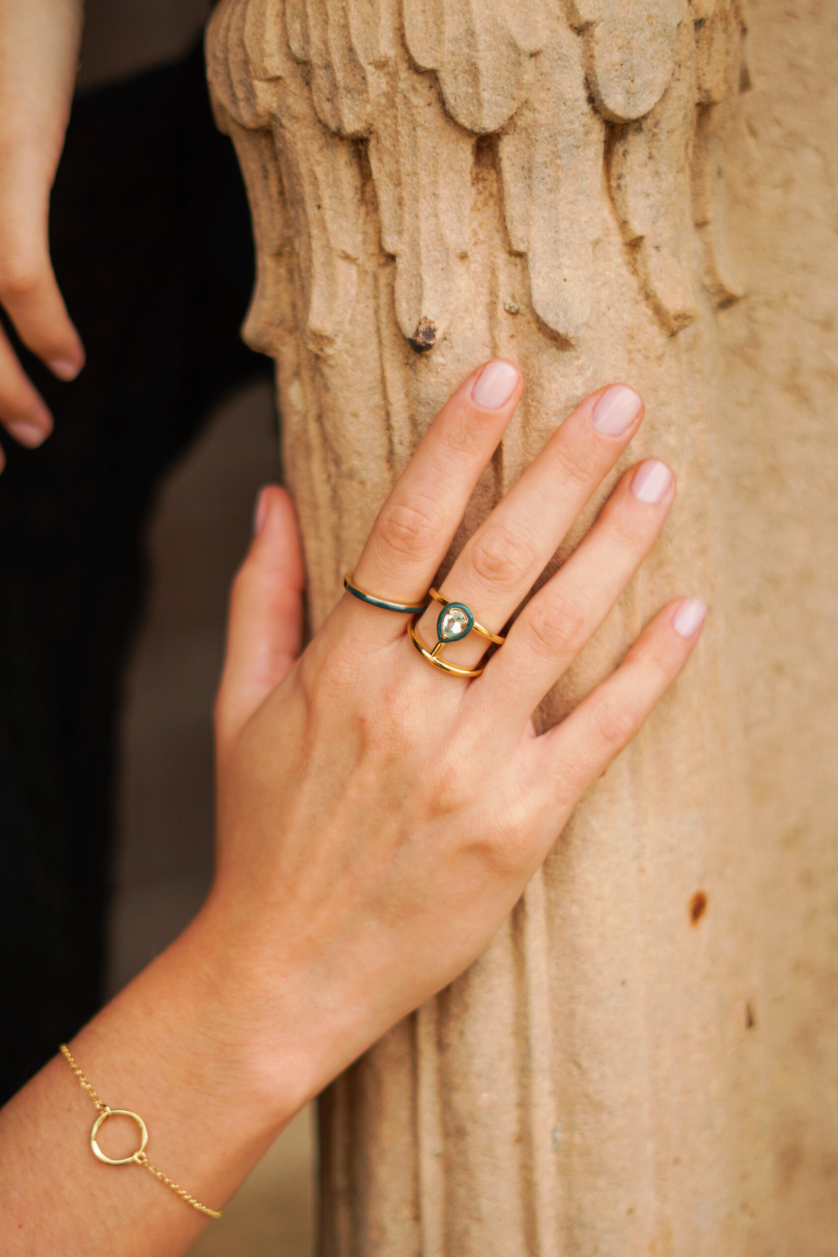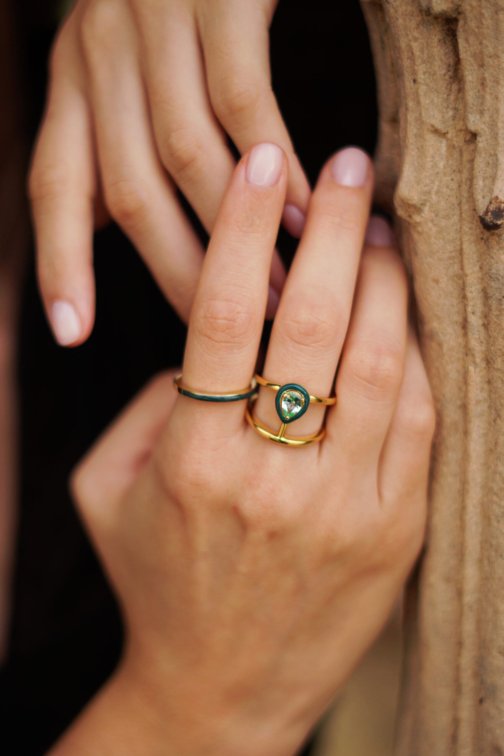 Anillo en plata de ley chapado en oro de doble aro con motivo en forma de gota de esmalte verde y espinel natural.