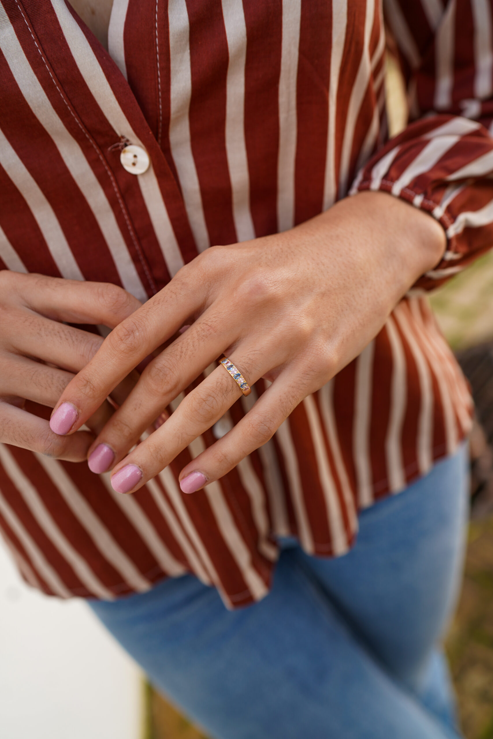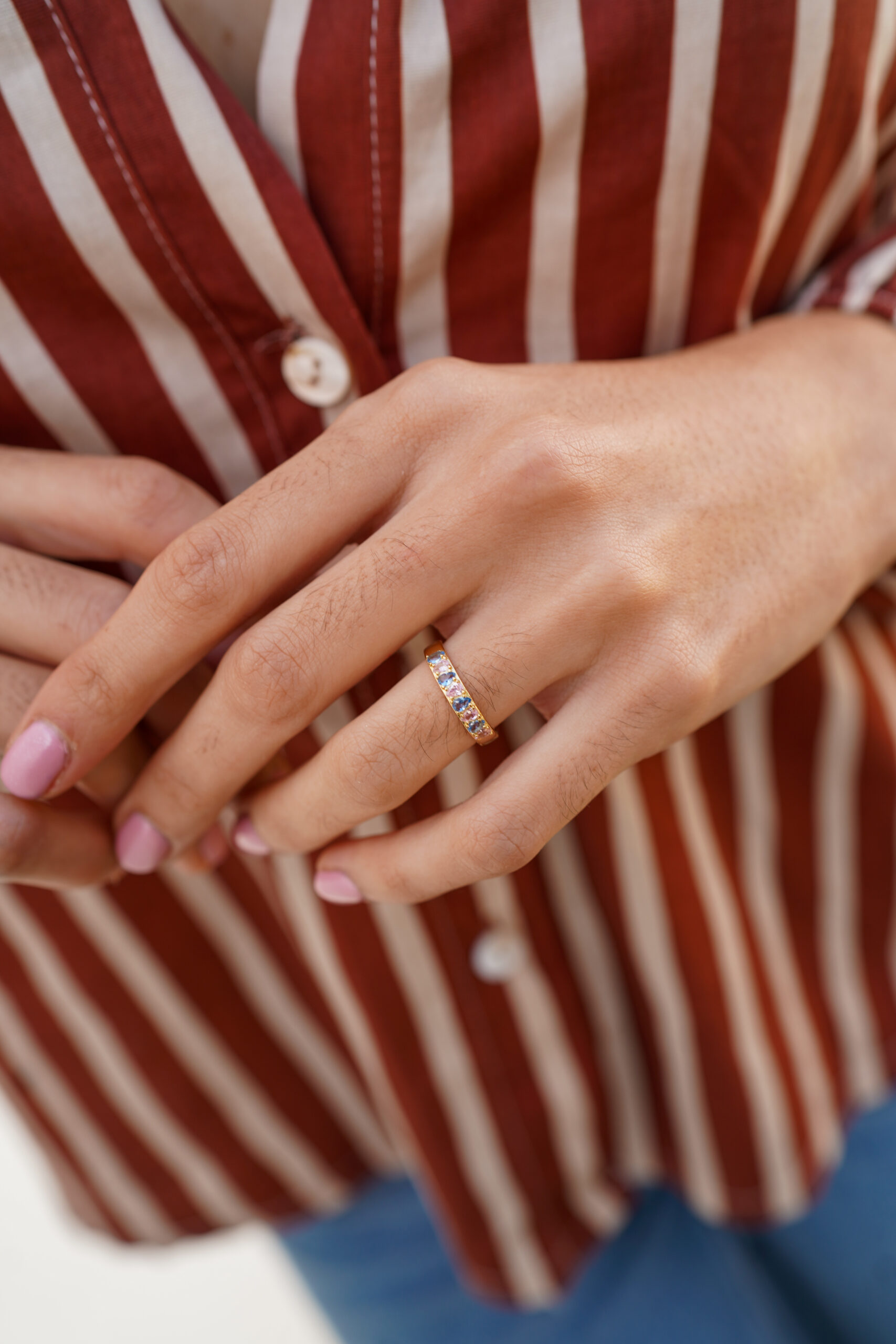 Anillo de plata de ley chapada en oro, decorado con una elegante hilera de circonitas rosas y azules que aportan un toque vibrante y sofisticado. Esta pieza combina la calidez del chapado en oro con el brillo y los matices coloridos de las gemas, creando un diseño armonioso y alegre.