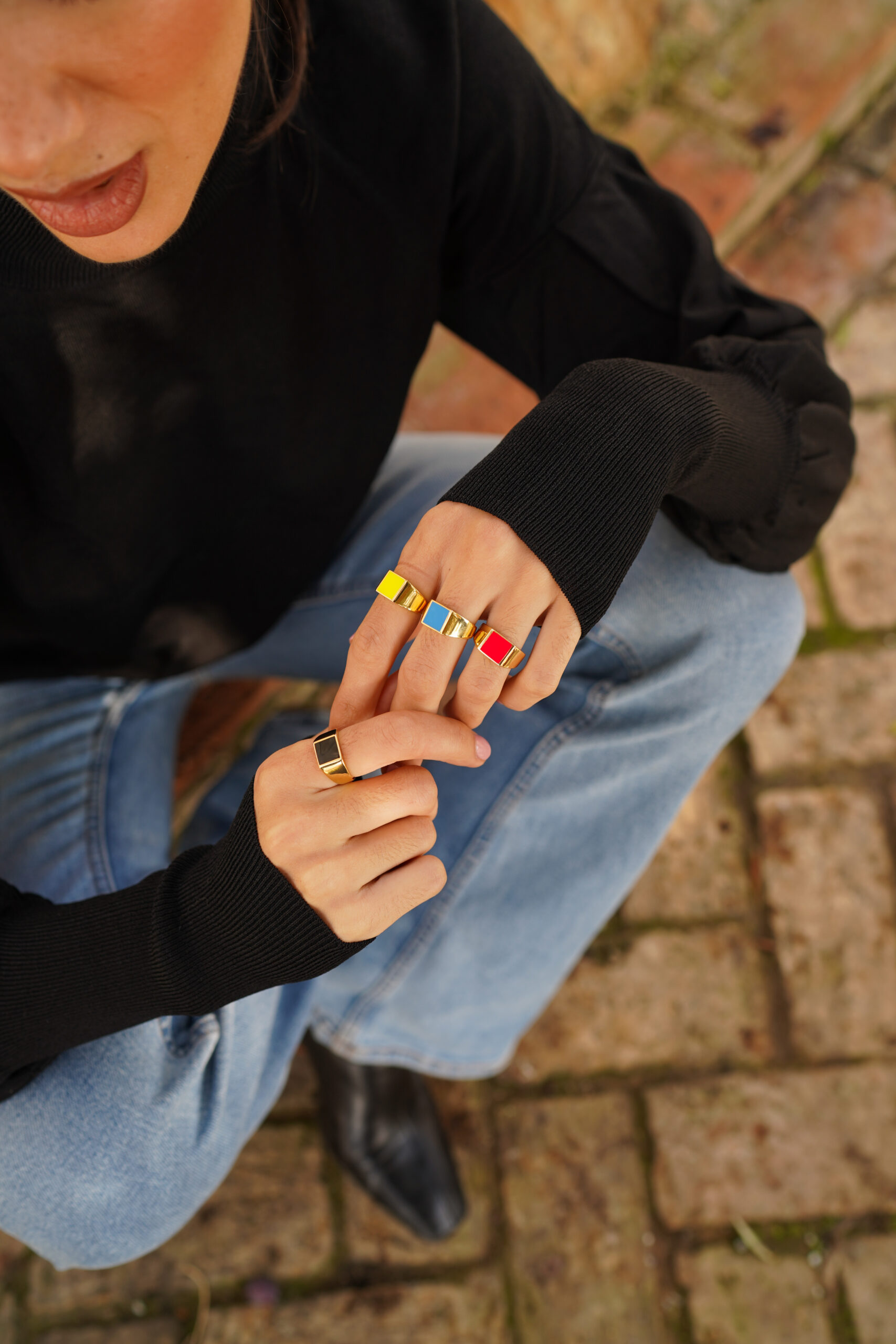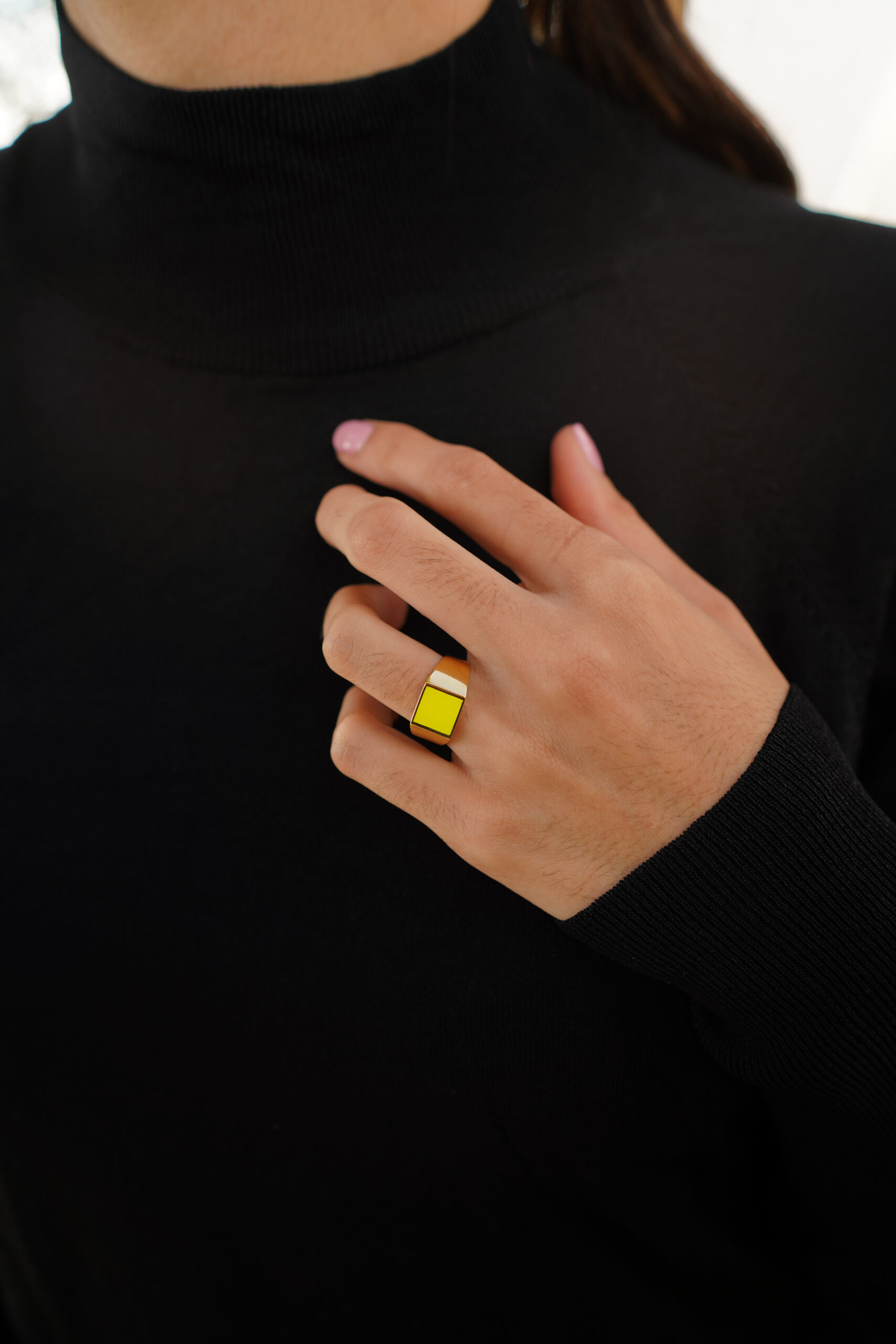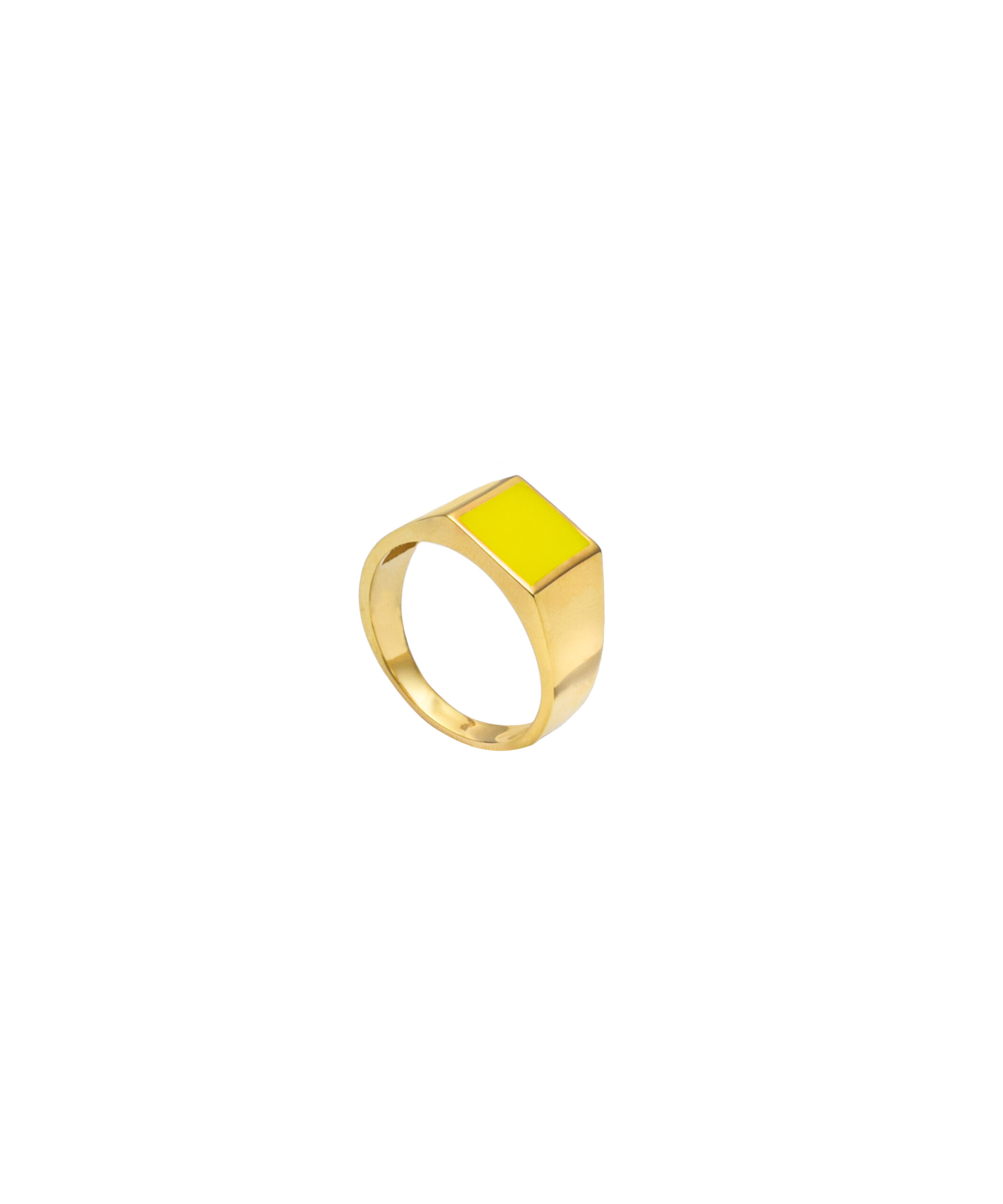 Anillo tipo sello en plata de ley chapada en oro, diseñada para destacar por su estilo clásico y elegante. La pieza presenta un cuadrado central en esmalte amarillo, que contrasta de manera sofisticada con el brillo del acabado dorado. Este diseño atemporal es ideal para quienes buscan un accesorio distintivo y versátil, perfecto para complementar cualquier estilo.