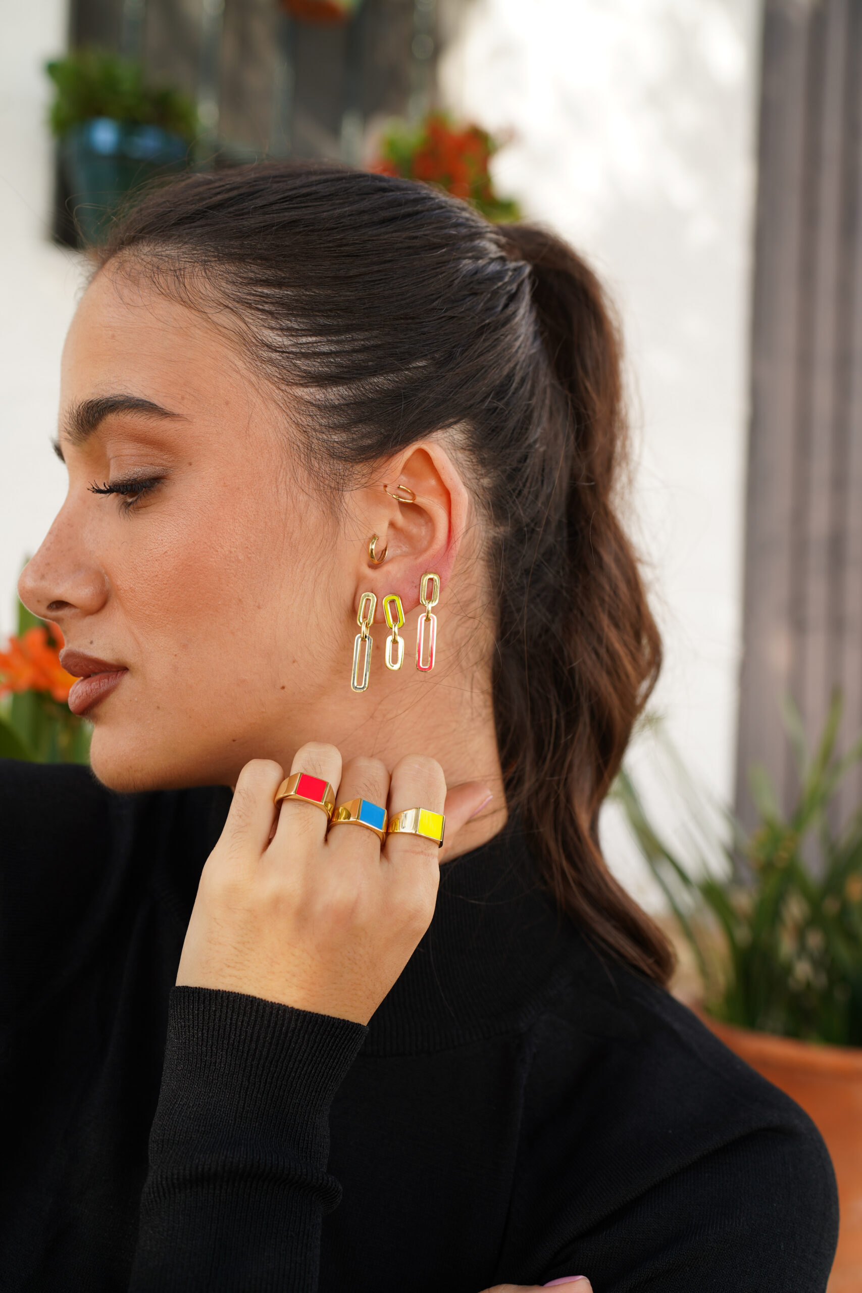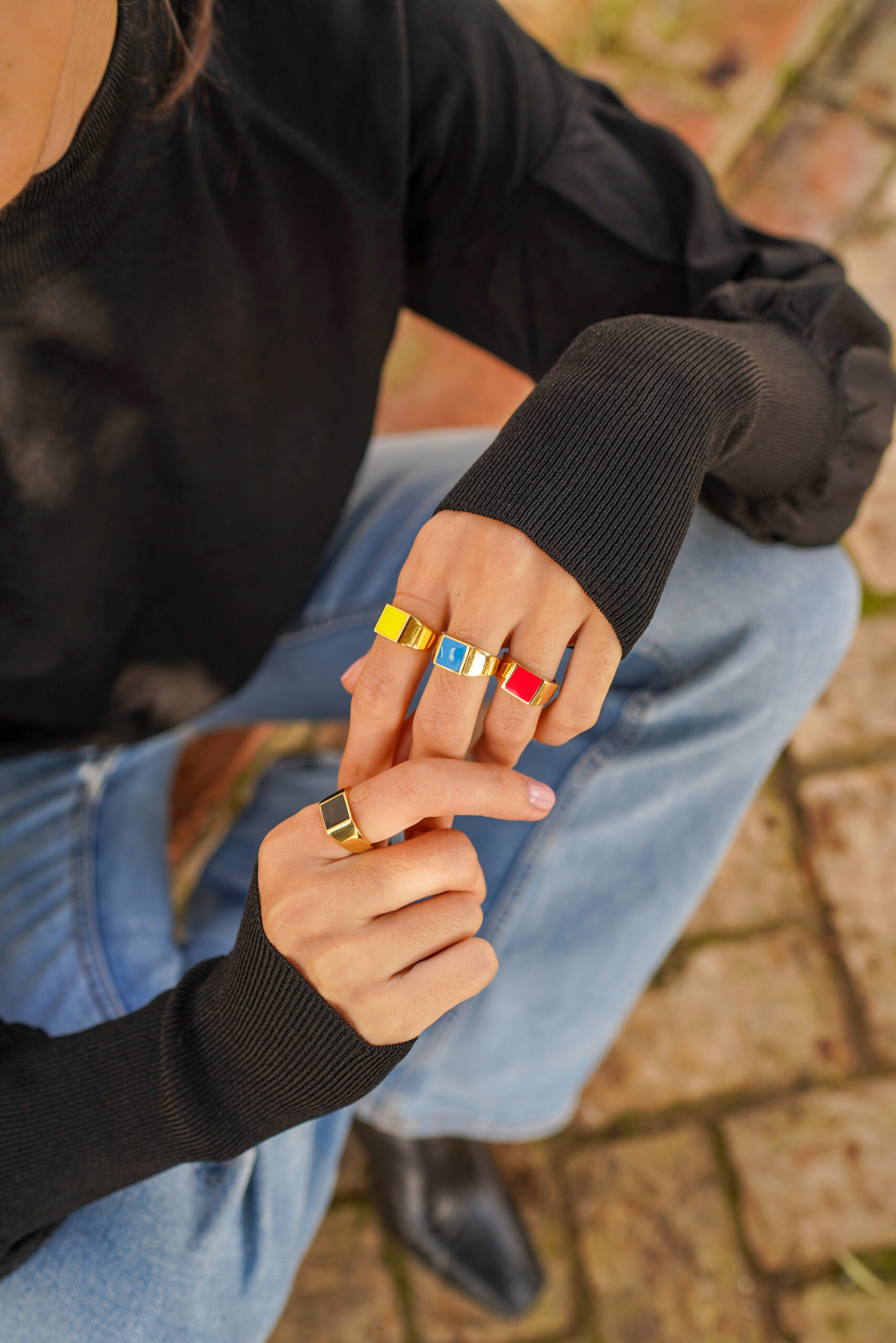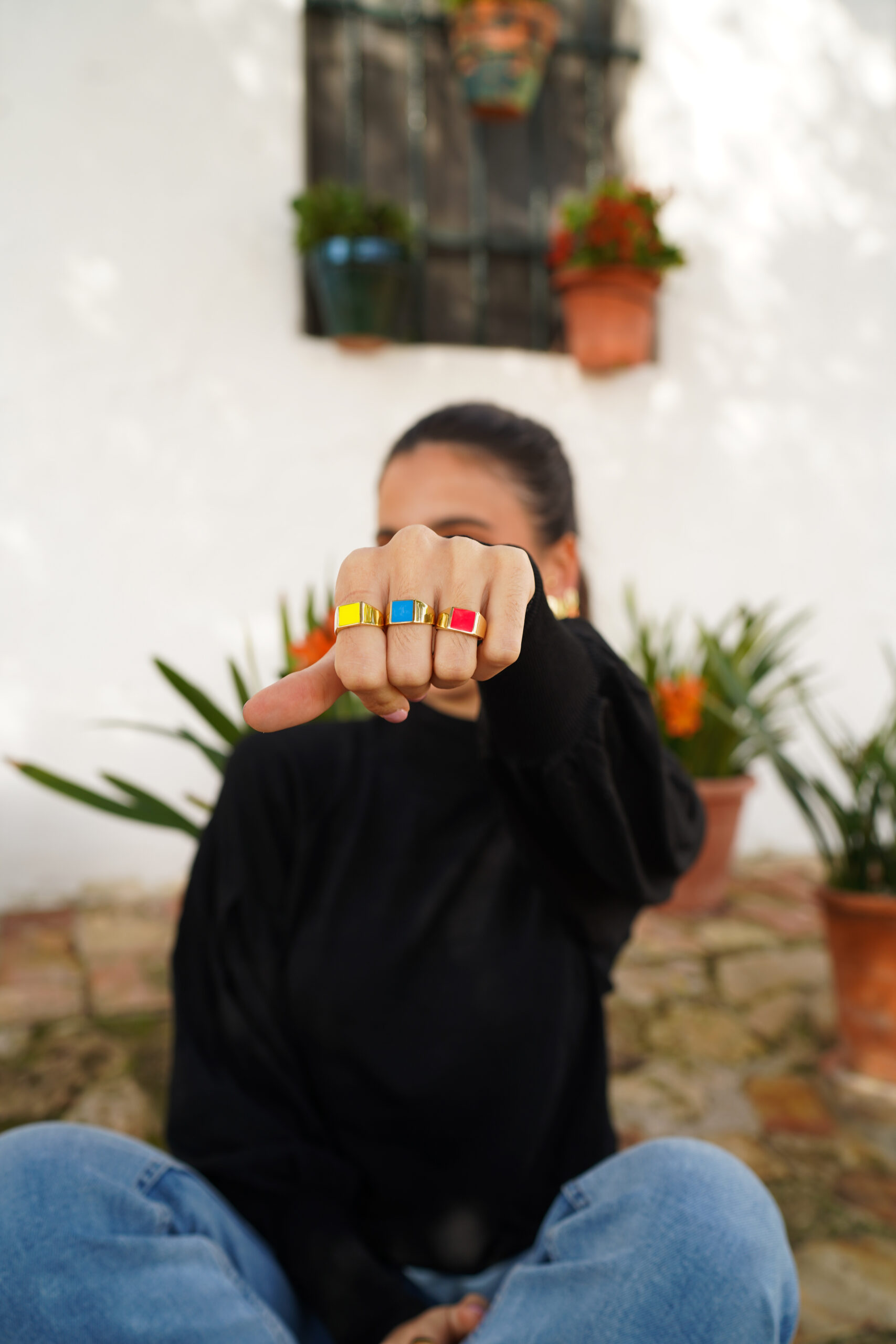Anillo tipo sello en plata de ley chapada en oro, diseñada para destacar por su estilo clásico y elegante. La pieza presenta un cuadrado central en esmalte amarillo, que contrasta de manera sofisticada con el brillo del acabado dorado. Este diseño atemporal es ideal para quienes buscan un accesorio distintivo y versátil, perfecto para complementar cualquier estilo.