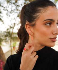 Anillo tipo sello en plata de ley chapada en oro, diseñada para destacar por su estilo clásico y elegante. La pieza presenta un cuadrado central en esmalte rosa, que contrasta de manera sofisticada con el brillo del acabado dorado. Este diseño atemporal es ideal para quienes buscan un accesorio distintivo y versátil, perfecto para complementar cualquier estilo.