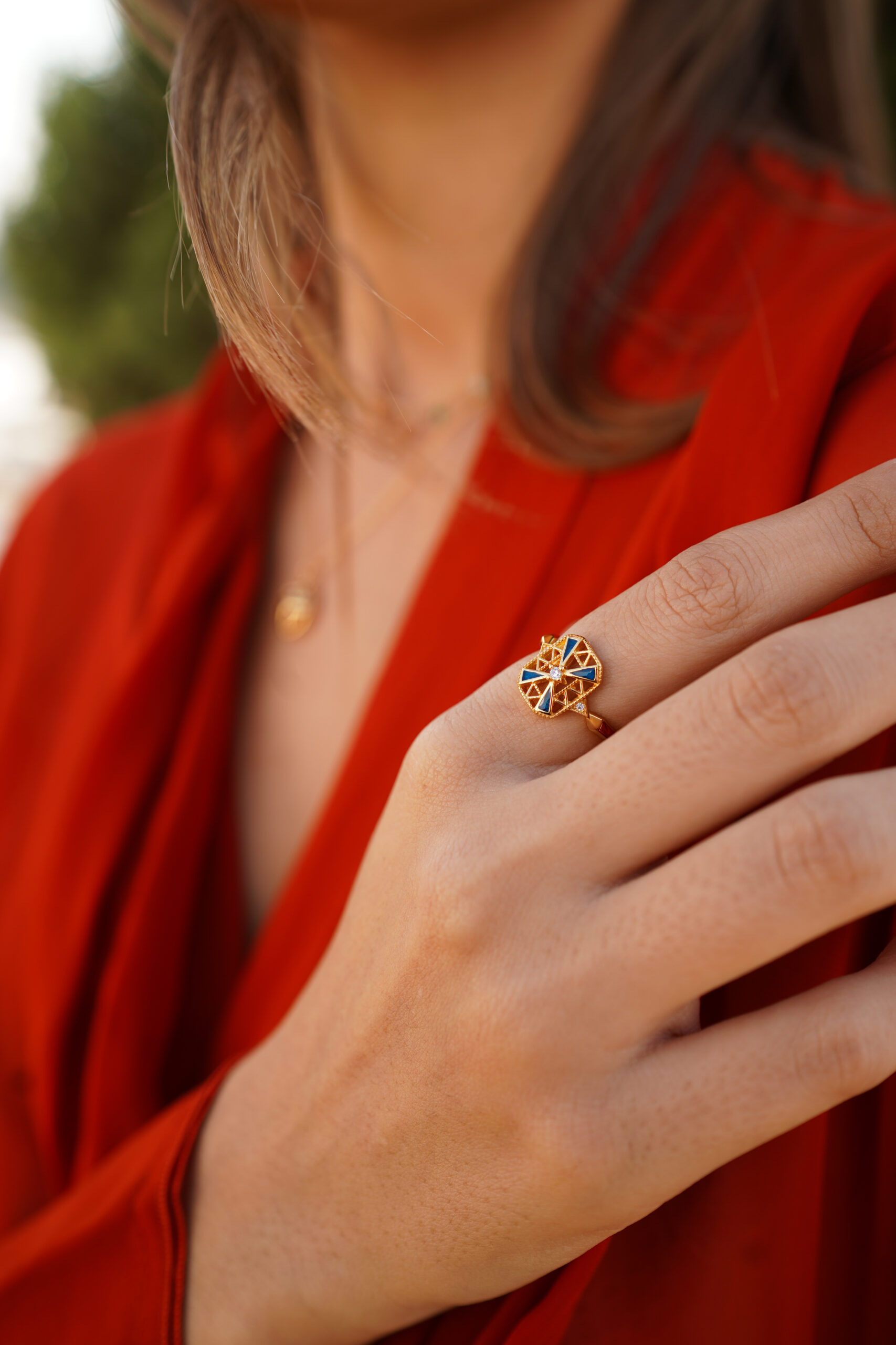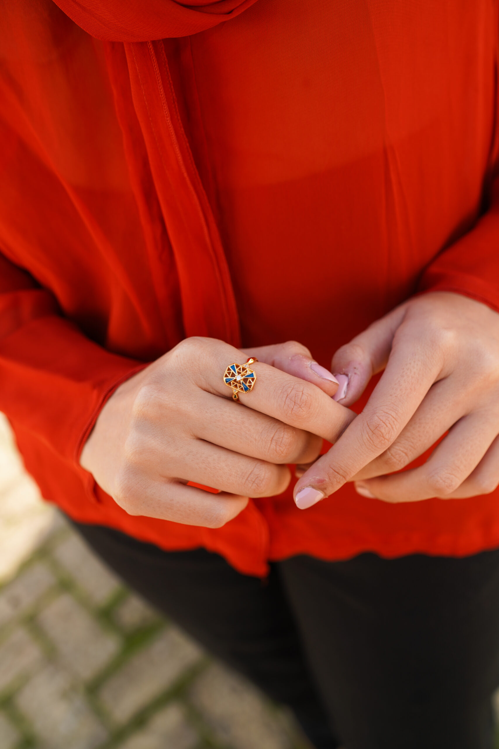 Anillo de plata de ley chapada en oro con un diseño de inspiración geométrica que resalta por su forma octagonal y detalles en esmalte azul. La estructura calada añade un toque ligero y sofisticado, mientras que pequeños destellos de circonitas estratégicamente colocadas aportan brillo y elegancia. Este anillo combina modernidad con un estilo atemporal, perfecto para destacar en cualquier ocasión.