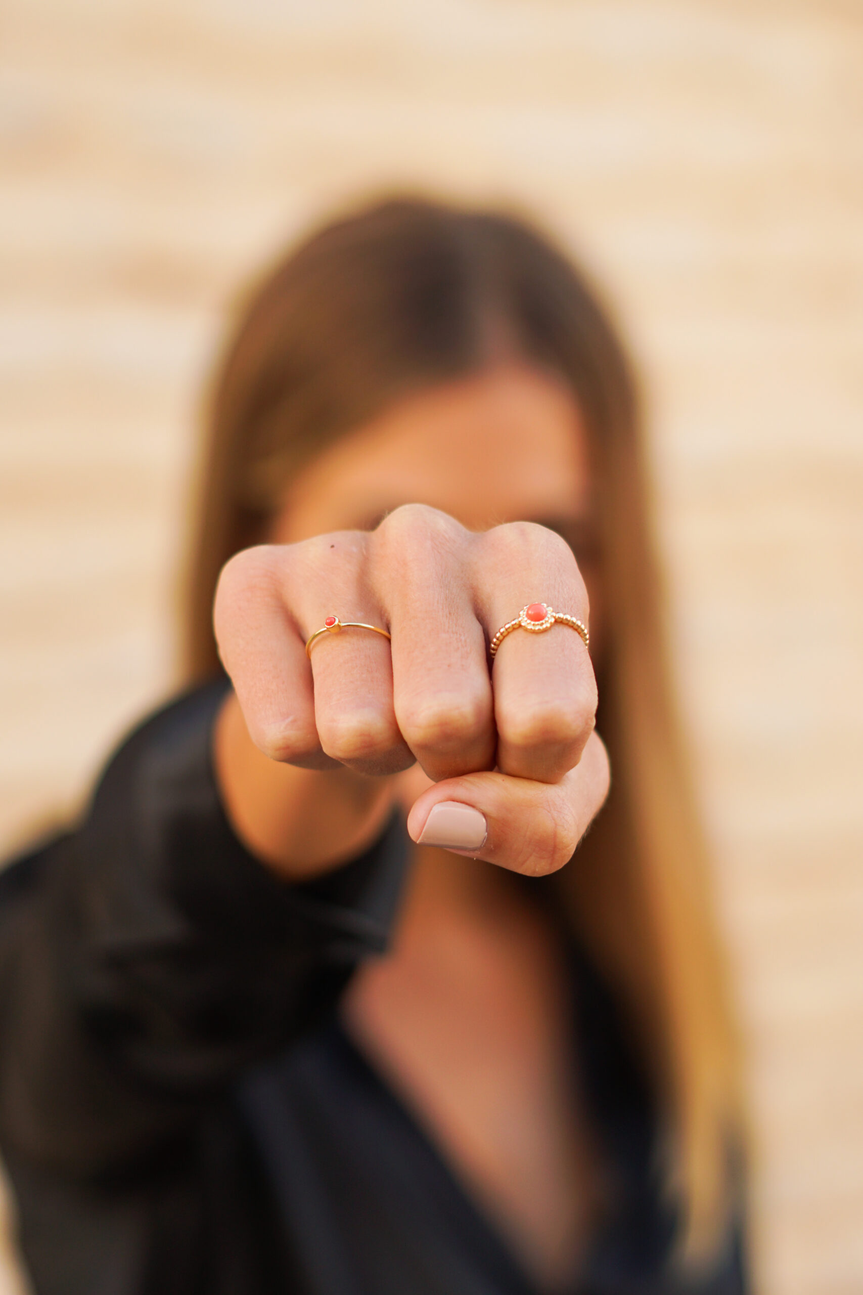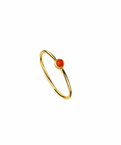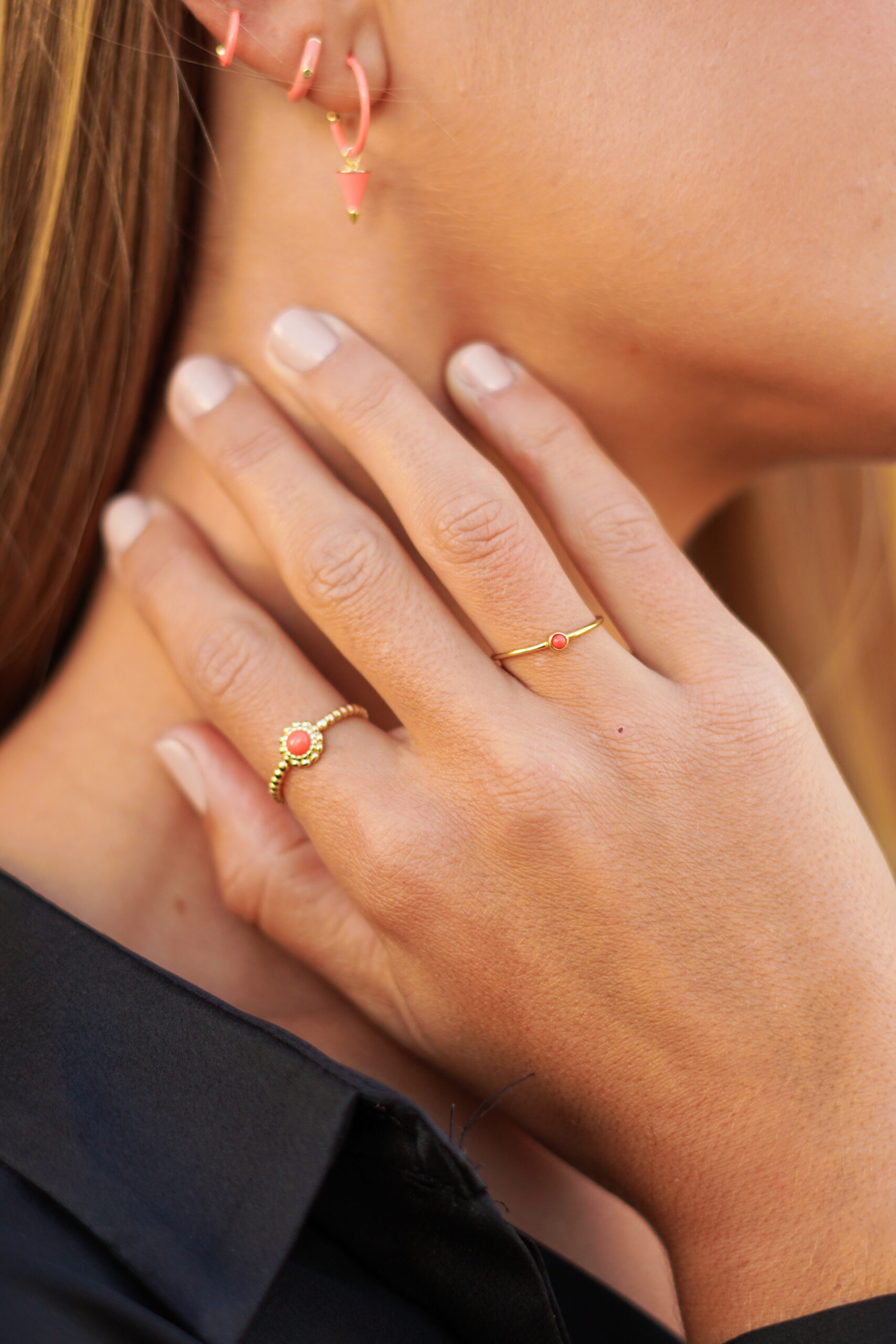 Anillo en plata de ley chapado en oro con forma de aro liso y piedra coral central en forma de chatón.