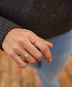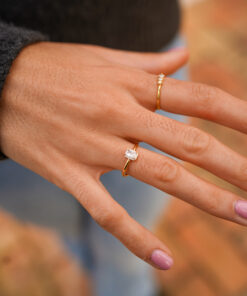 Anillo de plata de ley chapada en oro con un diseño minimalista que destaca por su piedra circonita central en talla rectangular envuelta por esmalte blanco. La calidez del chapado en oro se fusiona con el tono vibrante de la amatista, creando una pieza sofisticada y atemporal.