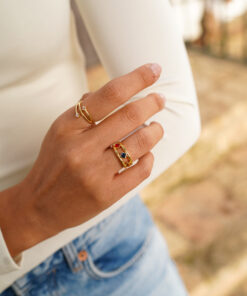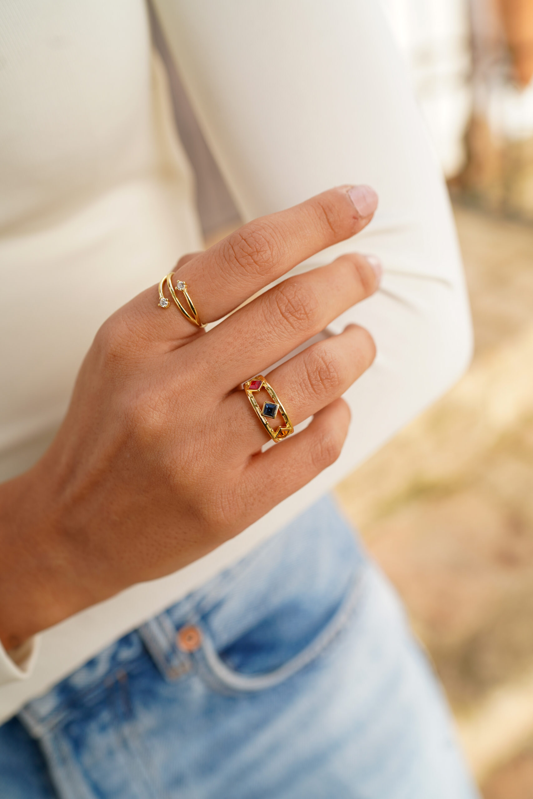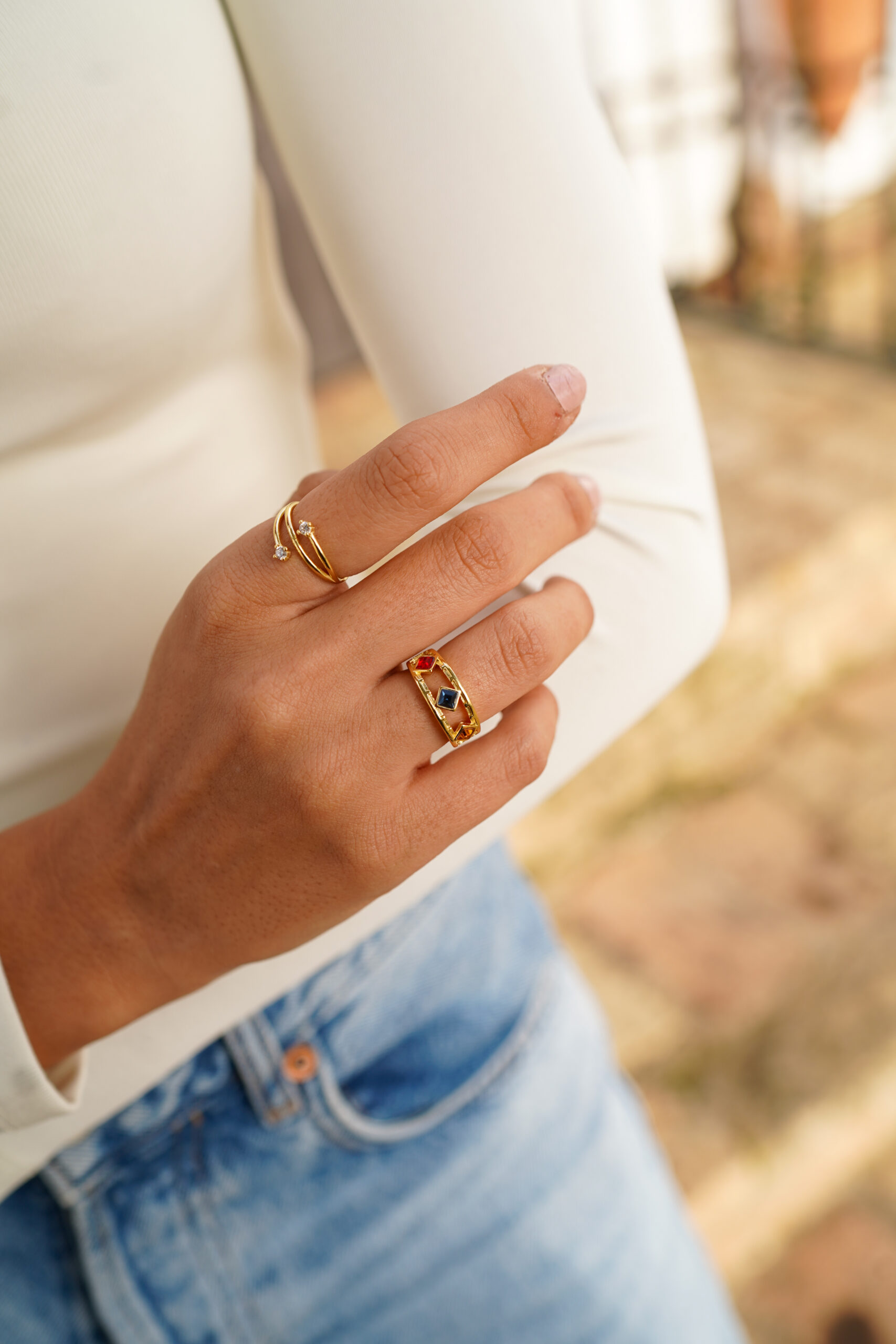 Anillo de plata de ley chapada en oro con un diseño geométrico moderno y vibrante. Esta pieza presenta una estructura abierta adornada con pequeñas gemas de colores rojo, azul y ámbar en cortes cuadrados que destacan por su brillo y contraste. Las piedras, cuidadosamente engastadas, añaden un toque de dinamismo y sofisticación al diseño.