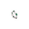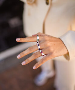 Anillo en plata de ley con esmalte blanco y cinco circonitas en forma de cabujón de varios colores.