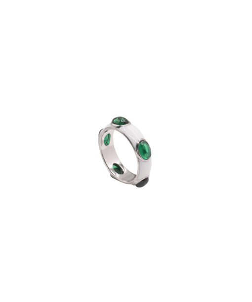 Anillo en plata de ley con esmalte blanco y cinco circonitas en forma de cabujón de color verde.
