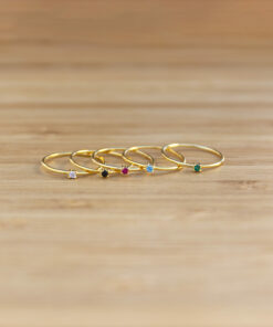 Anillo en plata de ley chapado en oro con forma de aro liso y circonita color verde central en forma de garra.