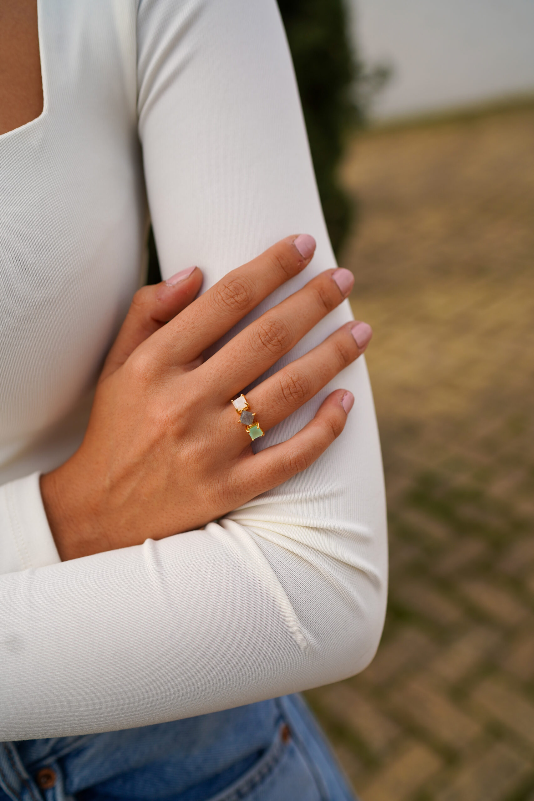Anillo de plata de ley chapada en oro, diseñado con tres piedras semipreciosas de corte cuadrado que crean un fascinante contraste cromático. Cada piedra refleja una tonalidad única: calcedonia en verde sereno, labradorita en gris profundo y piedra luna en blanco perlado, evocando equilibrio y sofisticación en una pieza versátil y moderna. Su estructura estilizada y elegante lo convierte en un complemento ideal para cualquier ocasión.