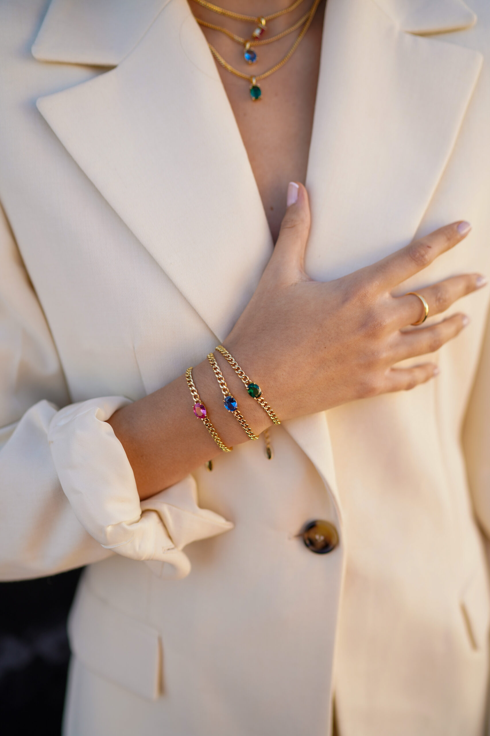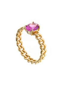 Anillo en plata de ley chapado en oro con con piedra central de color rosa sujeta por cuatro garras y cuerpo de eslabones.