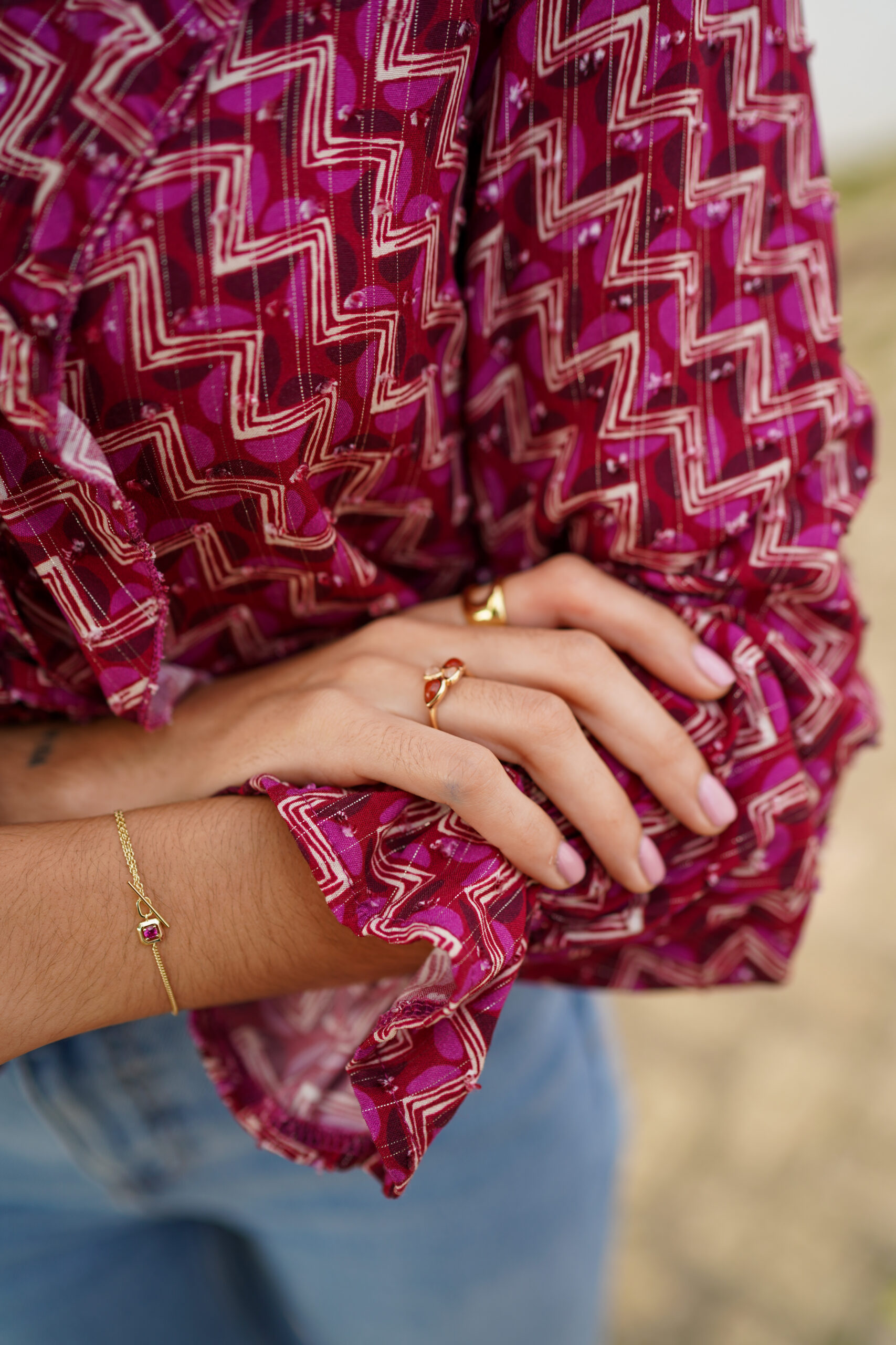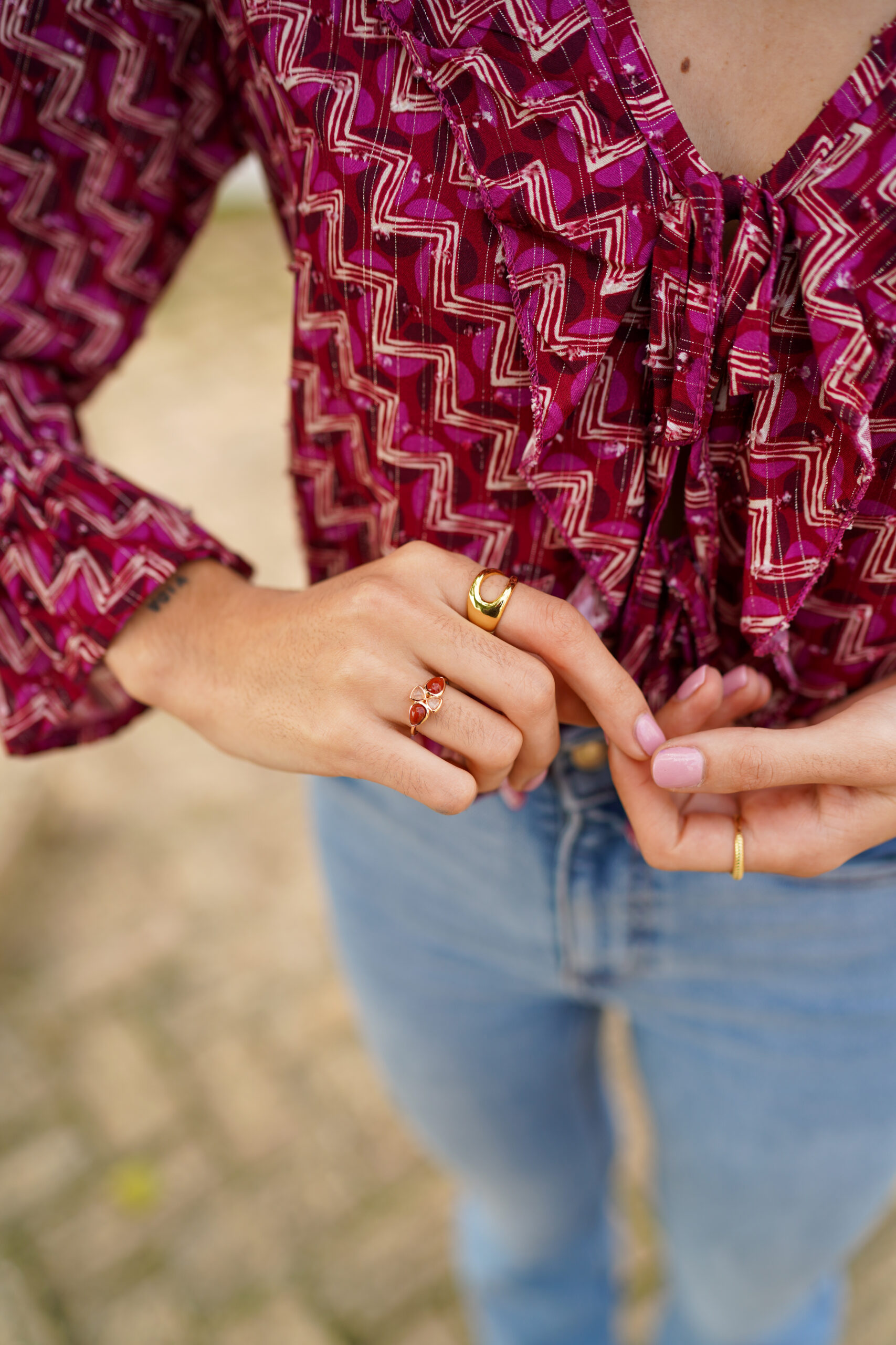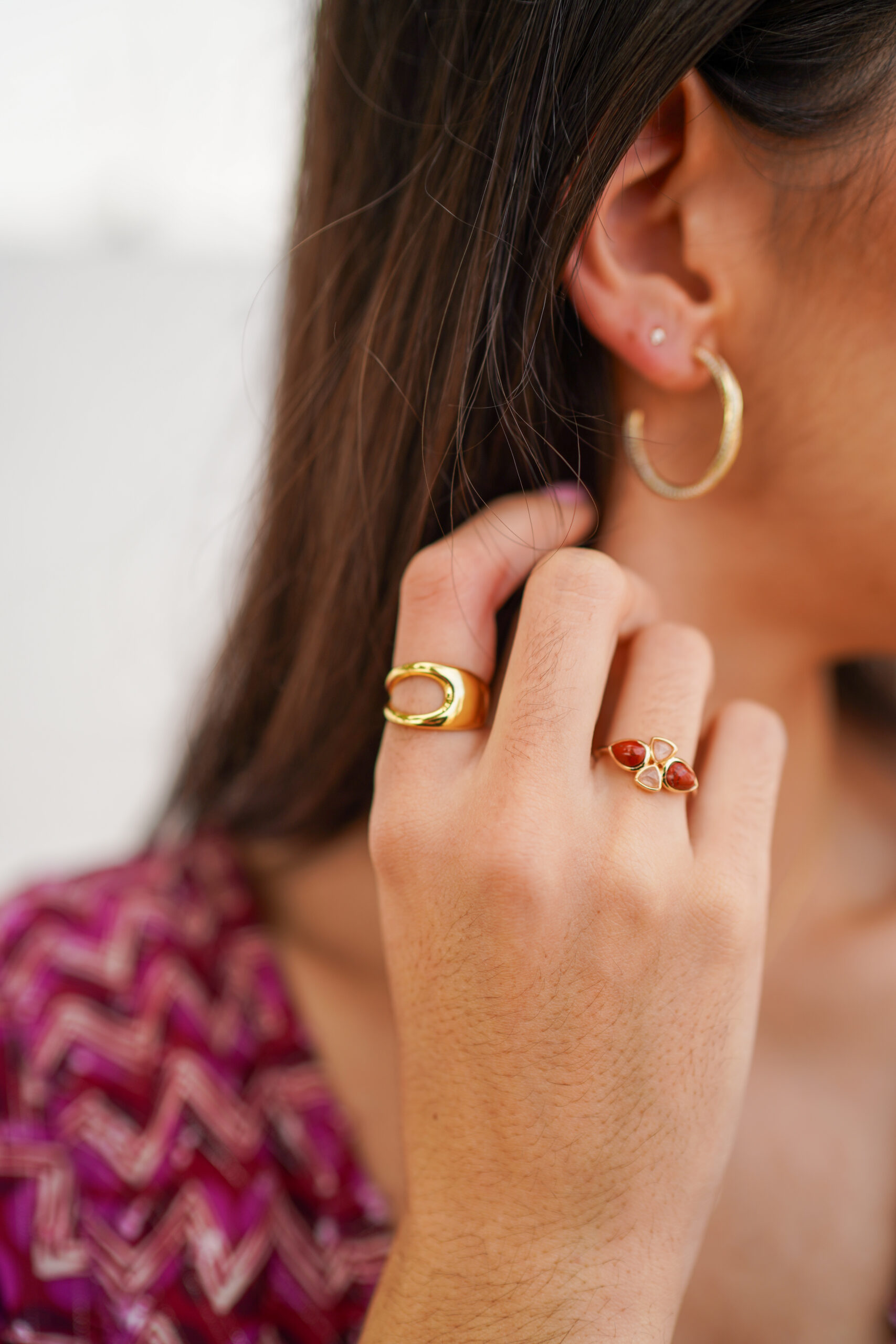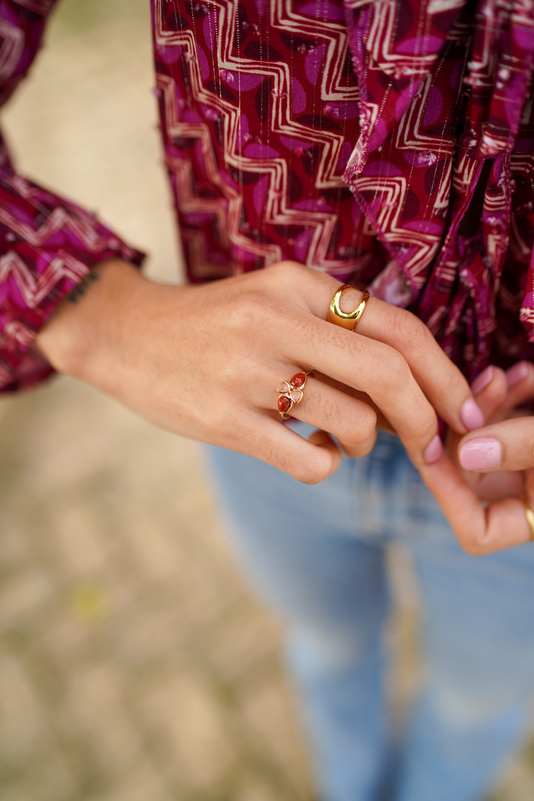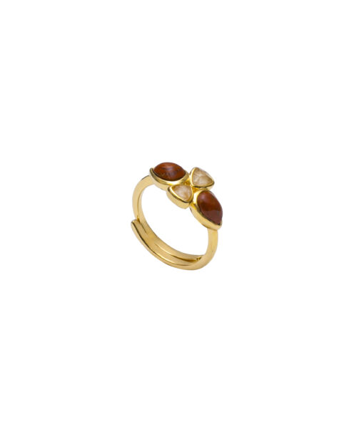 Anillo ajustable en plata de ley chapado en oro con centro formado por dos piedras de jaspe rojo natural y dos piedras de cuarzo rosa.