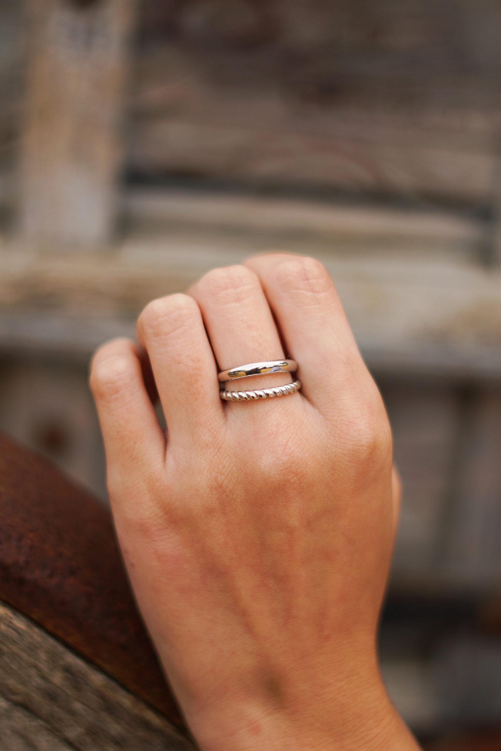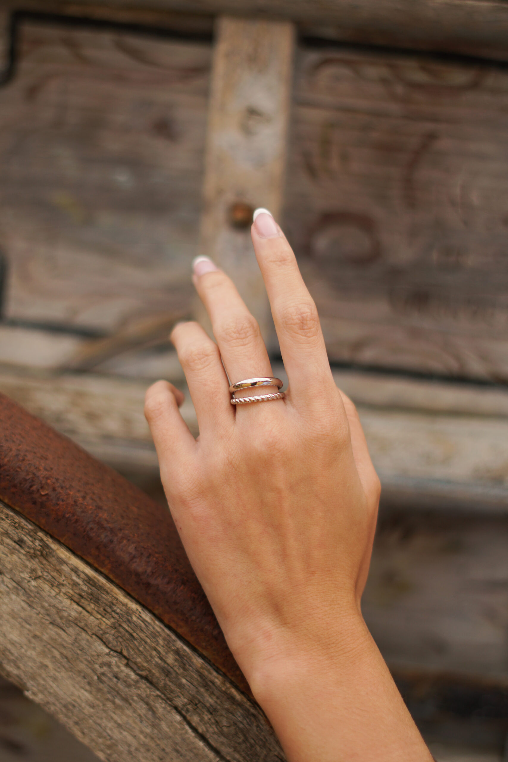 Anillo en plata de ley compuesto por dos aros, uno liso y otro rizado. Este modelo de anillo es abierto, por tanto es ajustable al dedo.