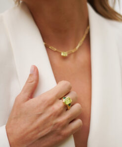 Anillo en plata de ley chapado en oro con cuarzo adamantino verde manzana de forma rectangular en el centro y dos piedras de cuarzo aventurina verde a cada lado.