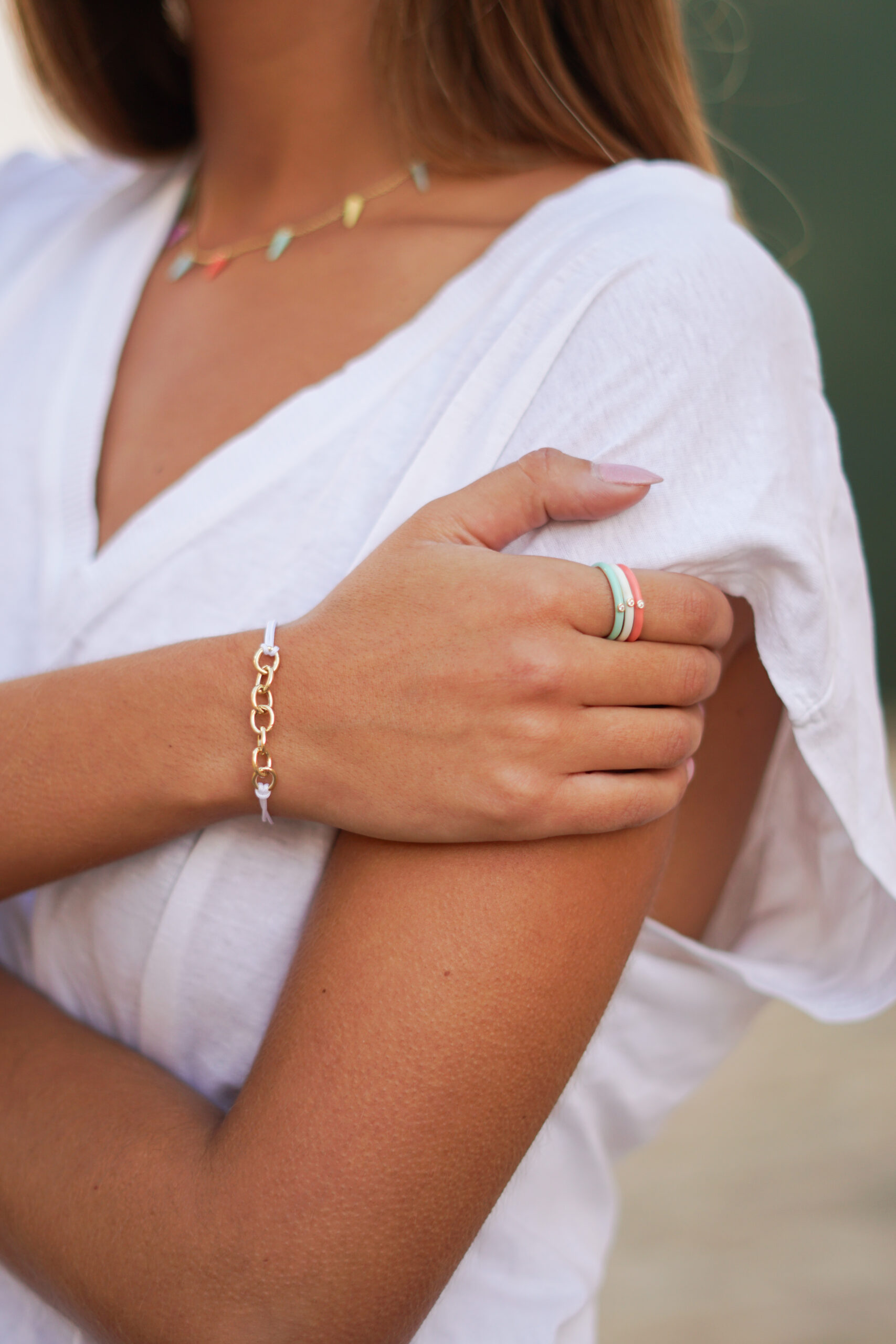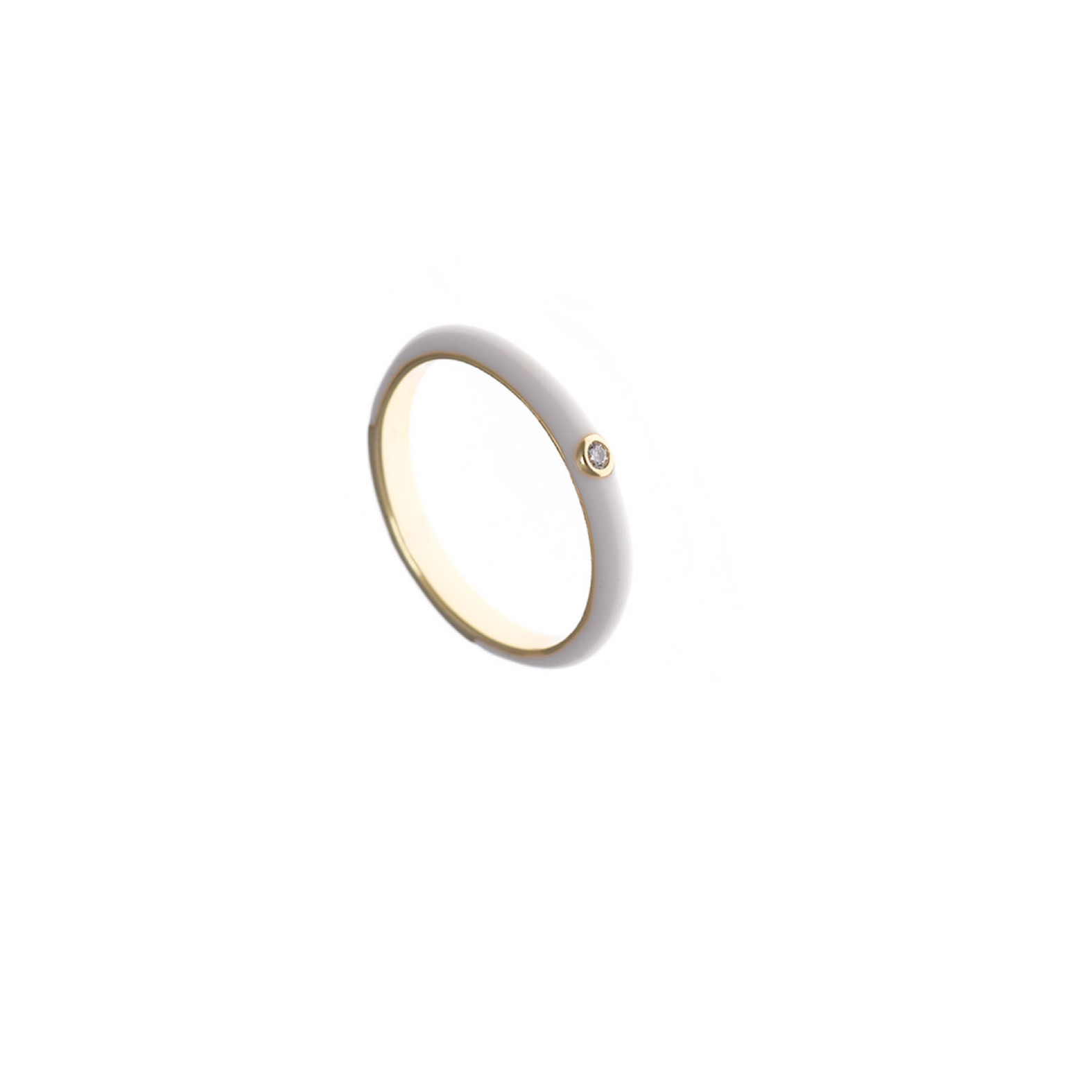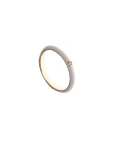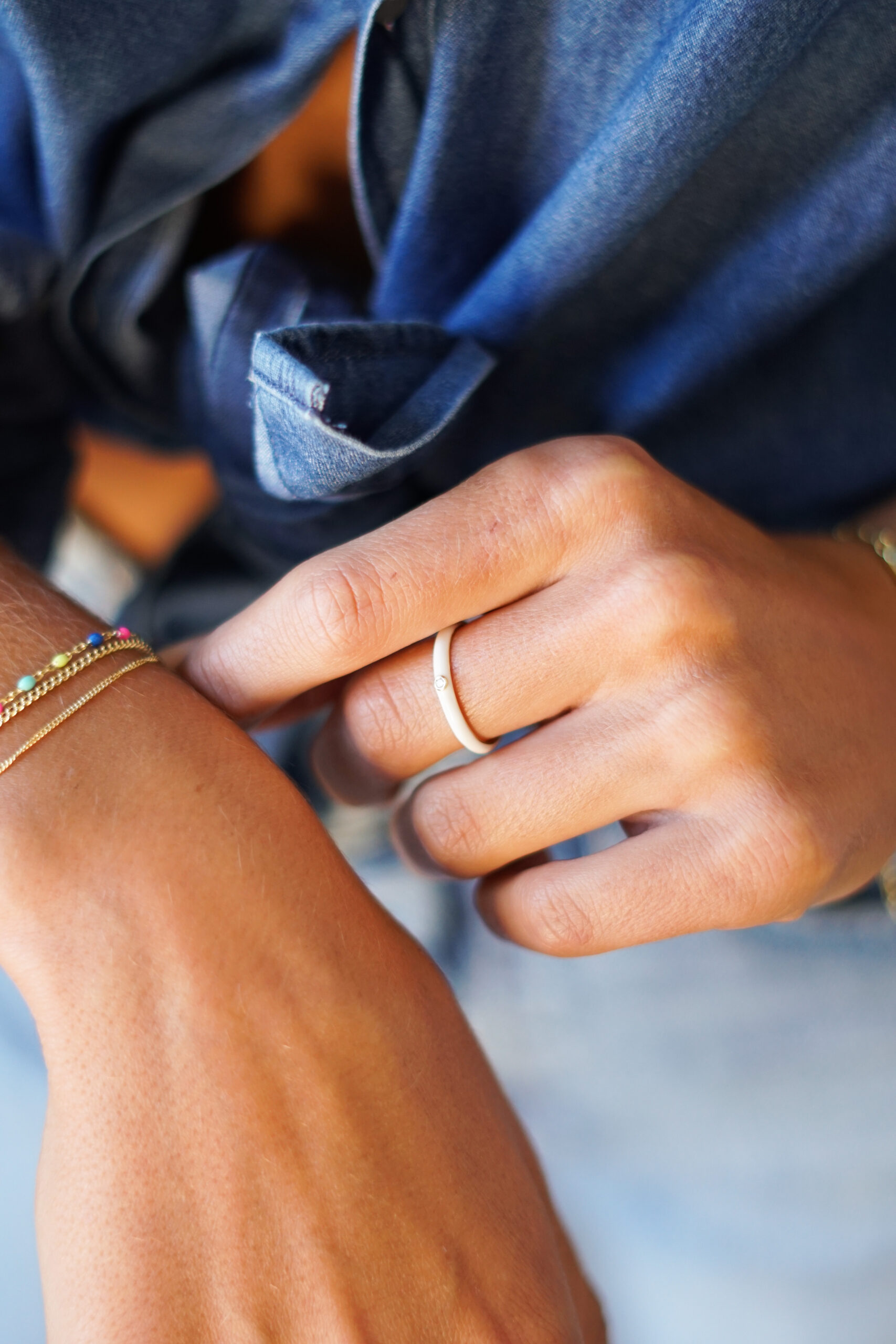 Anillo en plata de ley chapado en oro recubierto por esmalte de color blanco y circonita central.
