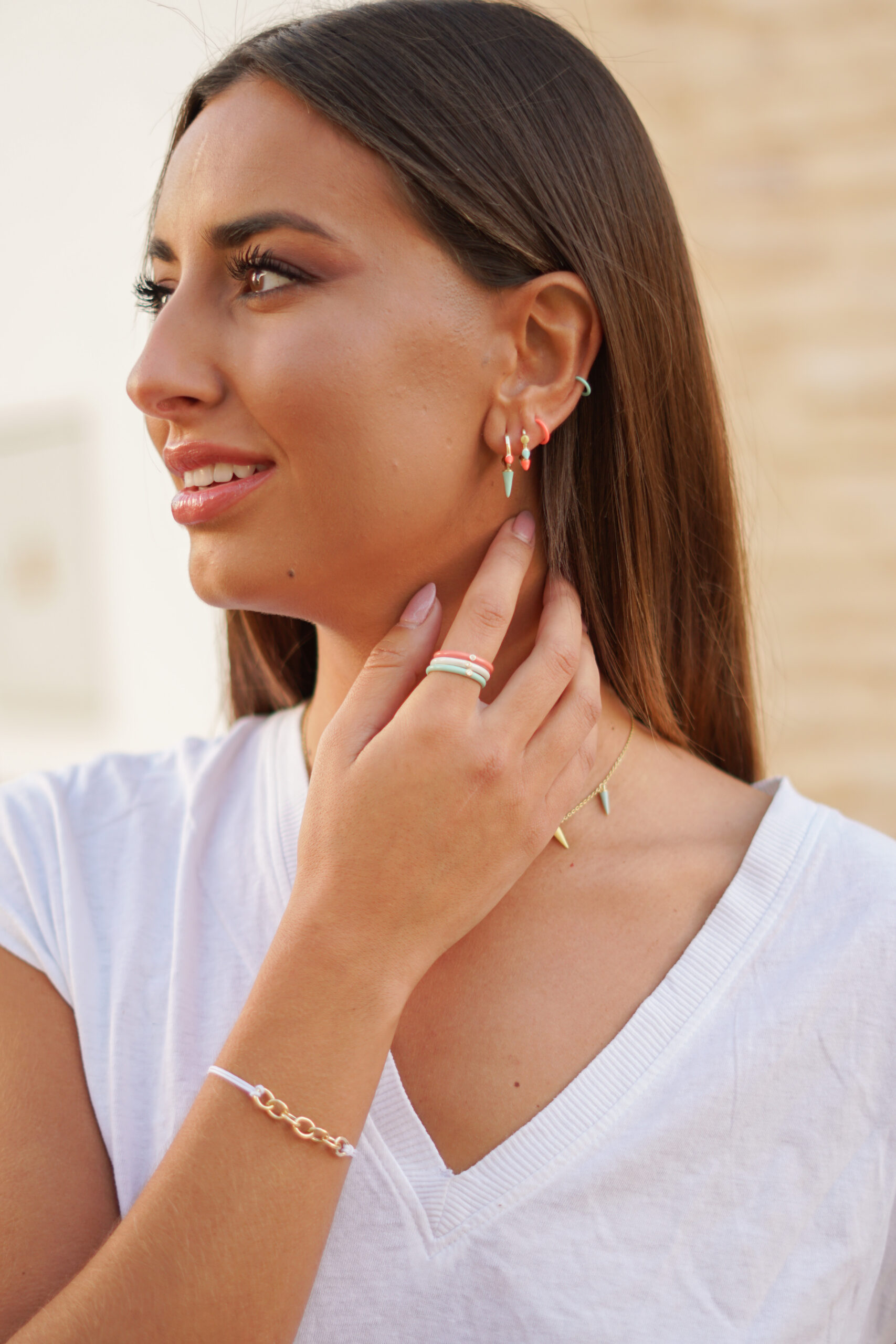 Anillo en plata de ley chapado en oro recubierto por esmalte de color coral y circonita central.