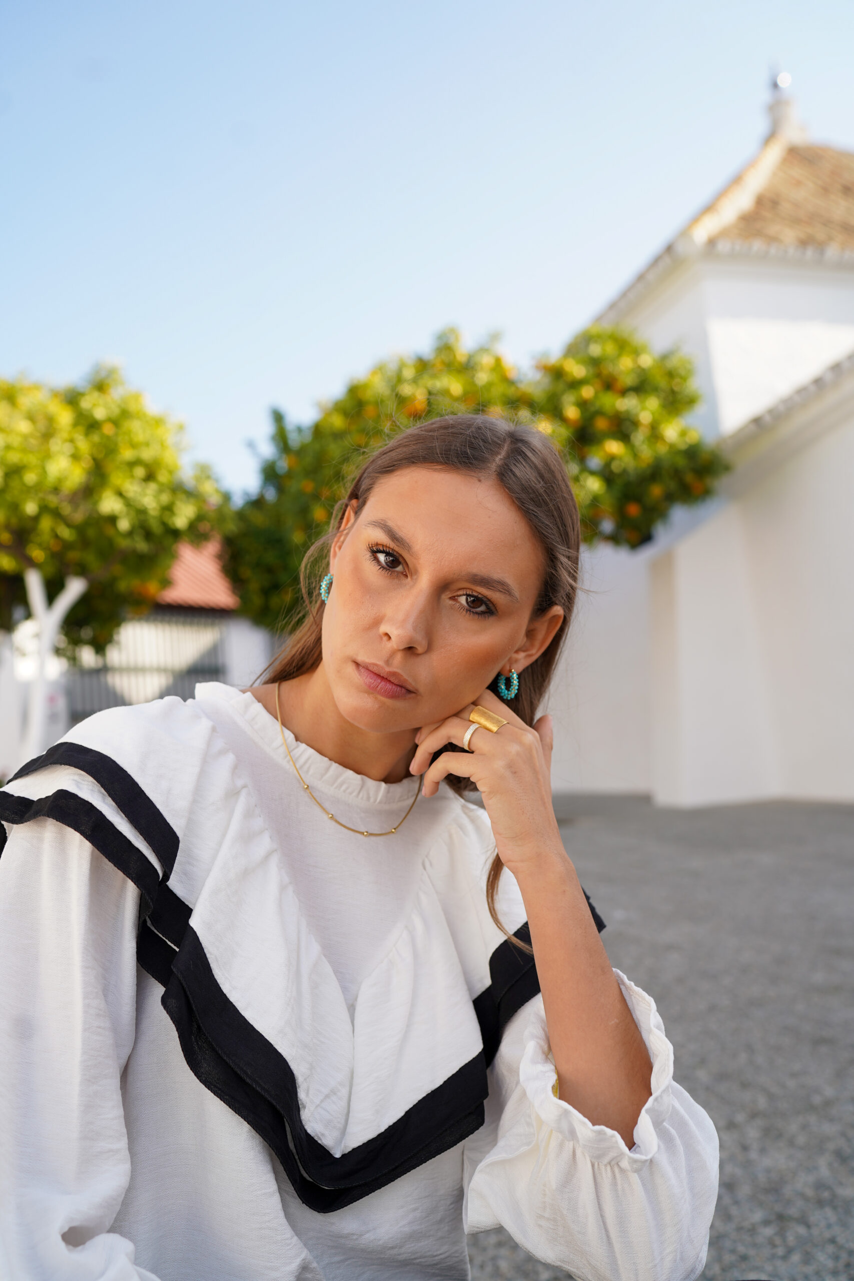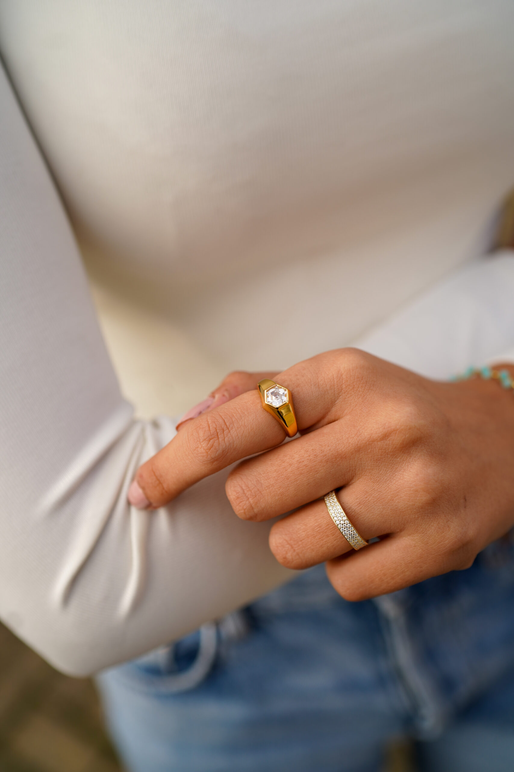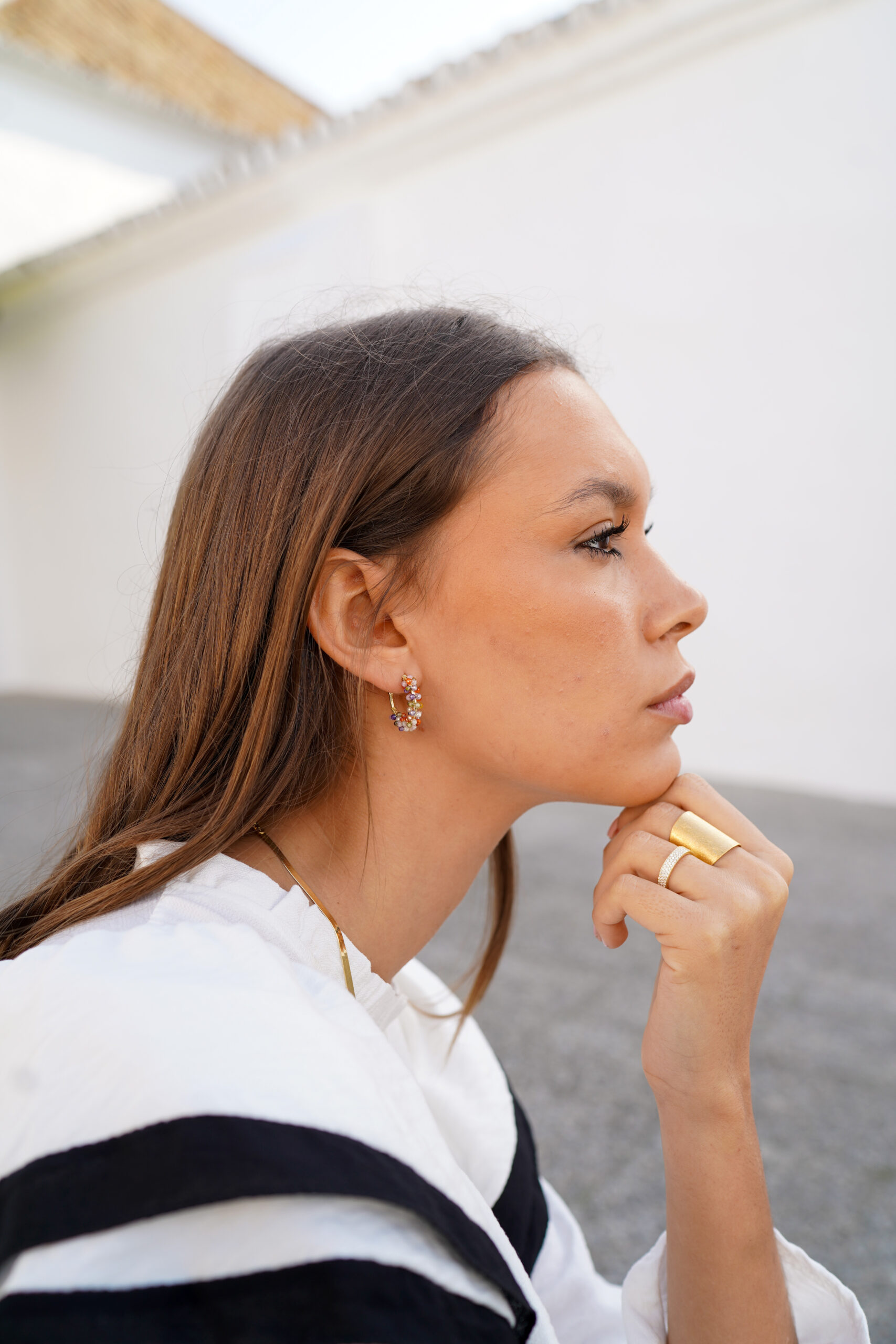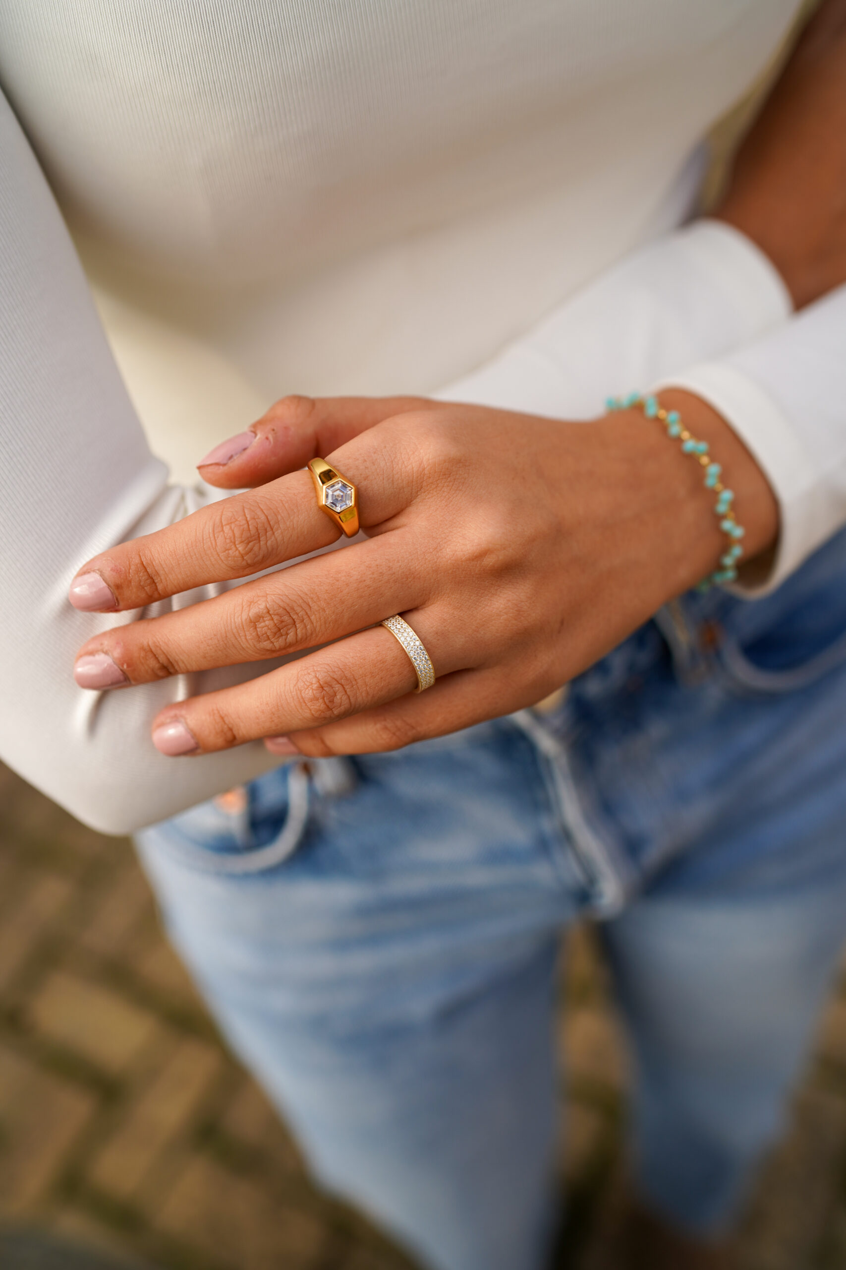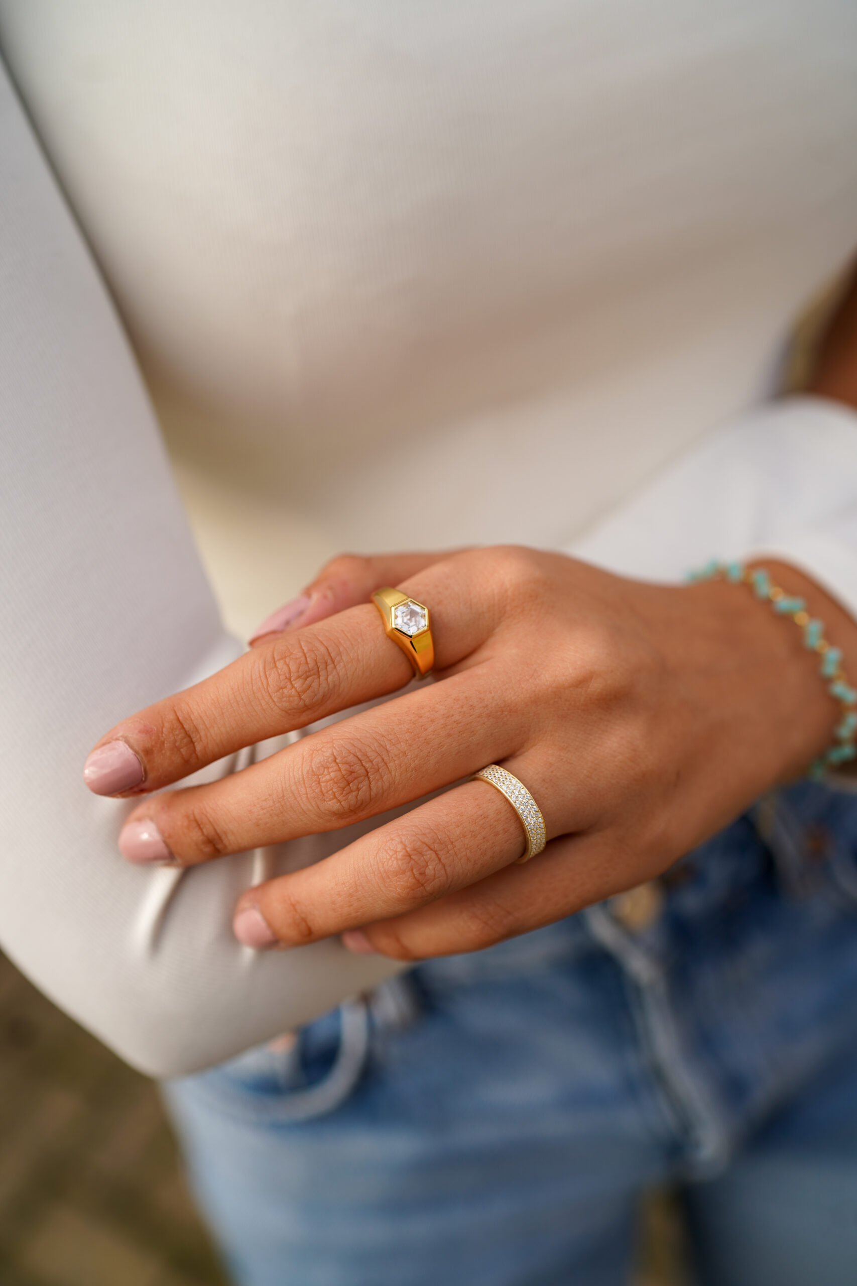 Anillo tipo alianza en plata de ley chapada en oro, diseñado para destacar por su elegancia y sofisticación. La pieza está decorada con tres filas de circonitas blancas engastadas en pavé, que aportan un brillo excepcional y un acabado refinado. Este diseño clásico y atemporal es perfecto para ocasiones especiales o para añadir un toque de distinción al día a día.