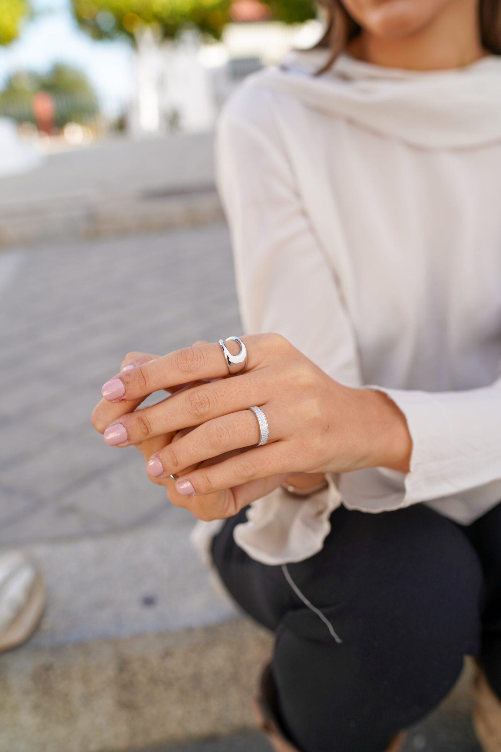 Anillo tipo alianza en plata de ley, diseñado para destacar por su elegancia y sofisticación. La pieza está decorada con tres filas de circonitas blancas engastadas en pavé, que aportan un brillo excepcional y un acabado refinado. Este diseño clásico y atemporal es perfecto para ocasiones especiales o para añadir un toque de distinción al día a día.