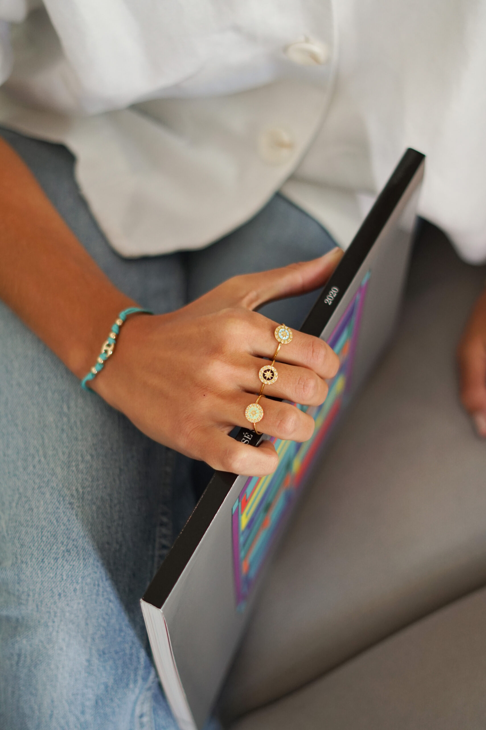 Anillo en plata de ley chapado en oro con forma de aro liso y roseta central de esmalte celeste y circonita dibujando la rosa de los vientos.