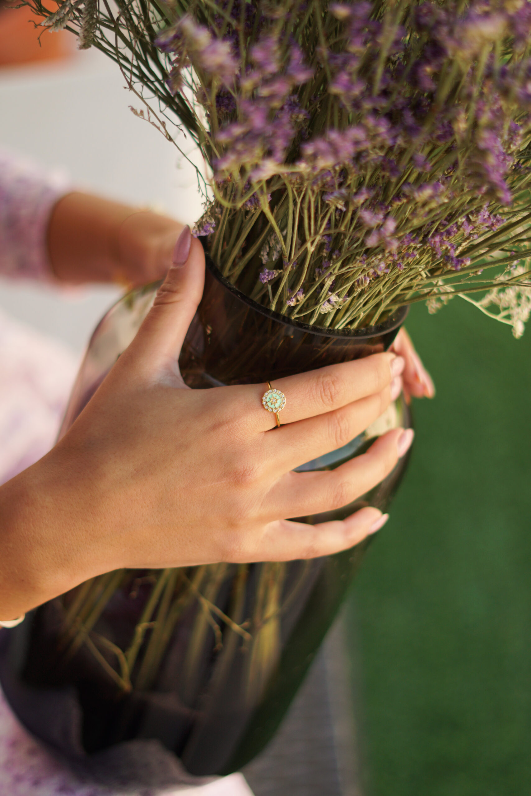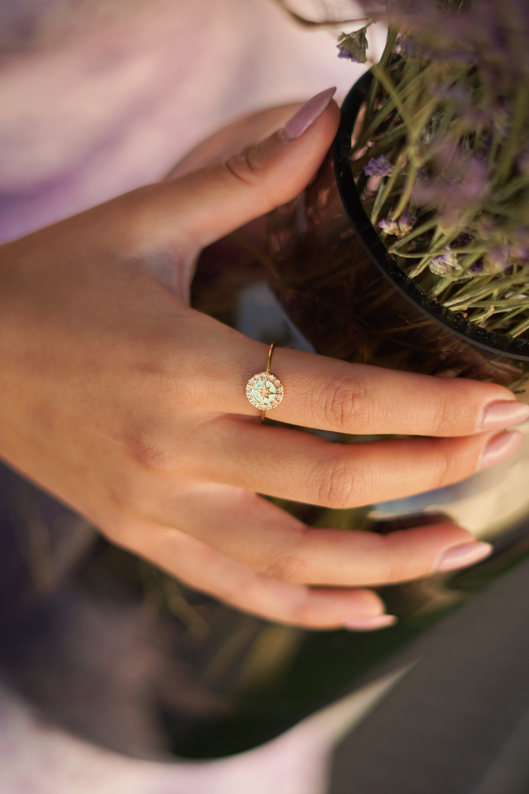 Anillo en plata de ley chapado en oro con forma de aro liso y roseta central de esmalte verde y circonita dibujando la rosa de los vientos.