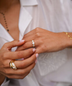 Anillo de plata de ley chapado en oro con un diseño clásico de tres piedras que irradia luz y elegancia. Sus moissanitas centrales, talladas de forma brillante, crean un destello intenso y puro que transforma esta pieza en un símbolo de armonía y sofisticación. Una joya equilibrada, atemporal y con presencia propia.