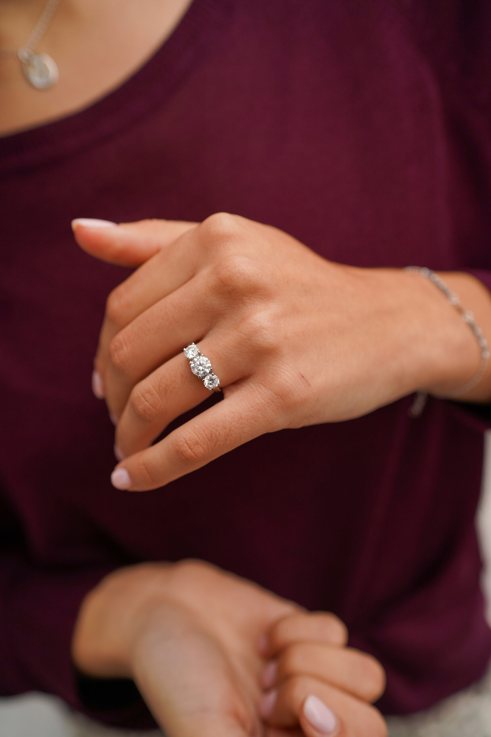 Anillo de plata de ley con un diseño clásico de tres piedras que irradia luz y elegancia. Sus moissanitas centrales, talladas de forma brillante, crean un destello intenso y puro que transforma esta pieza en un símbolo de armonía y sofisticación. Una joya equilibrada, atemporal y con presencia propia.