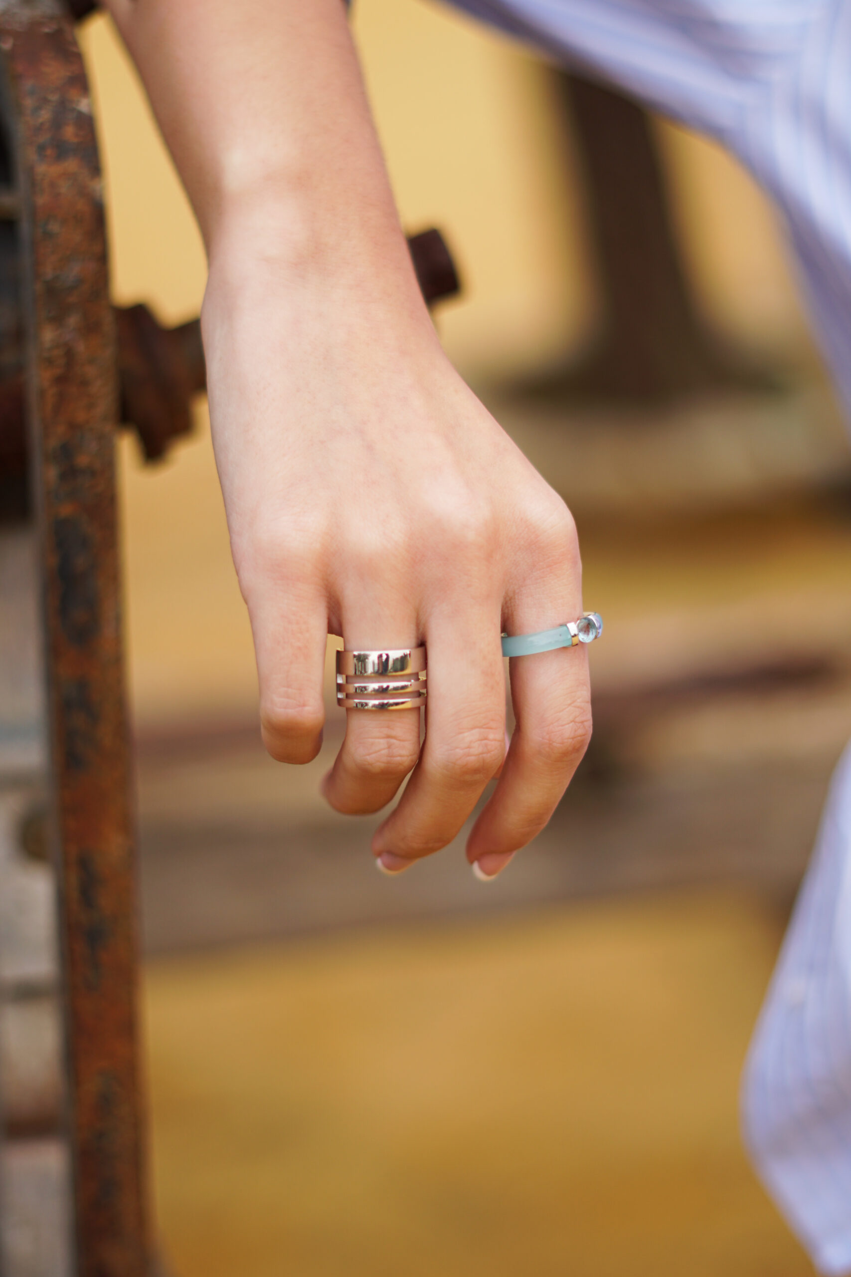 Anillo en plata de ley rosa y resina color celeste con garra central con circonita azul.