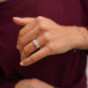 Anillo de plata de ley chapada en oro con tres circonitas color agua marina que forman una composición alargada, elegante y luminosa. La piedra central, de corte oval, se acompaña de dos circonitas laterales en talla pera, creando un equilibrio perfecto entre delicadeza y carácter.