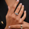 Anillo de plata de ley chapada en oro con tres circonitas color amatista que forman una composición alargada, elegante y luminosa. La piedra central, de corte oval, se acompaña de dos circonitas laterales en talla pera, creando un equilibrio perfecto entre delicadeza y carácter.