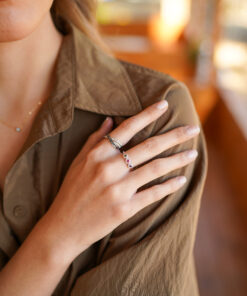Anillo en plata de ley con tres círculos de circonitas y piedra de color central.