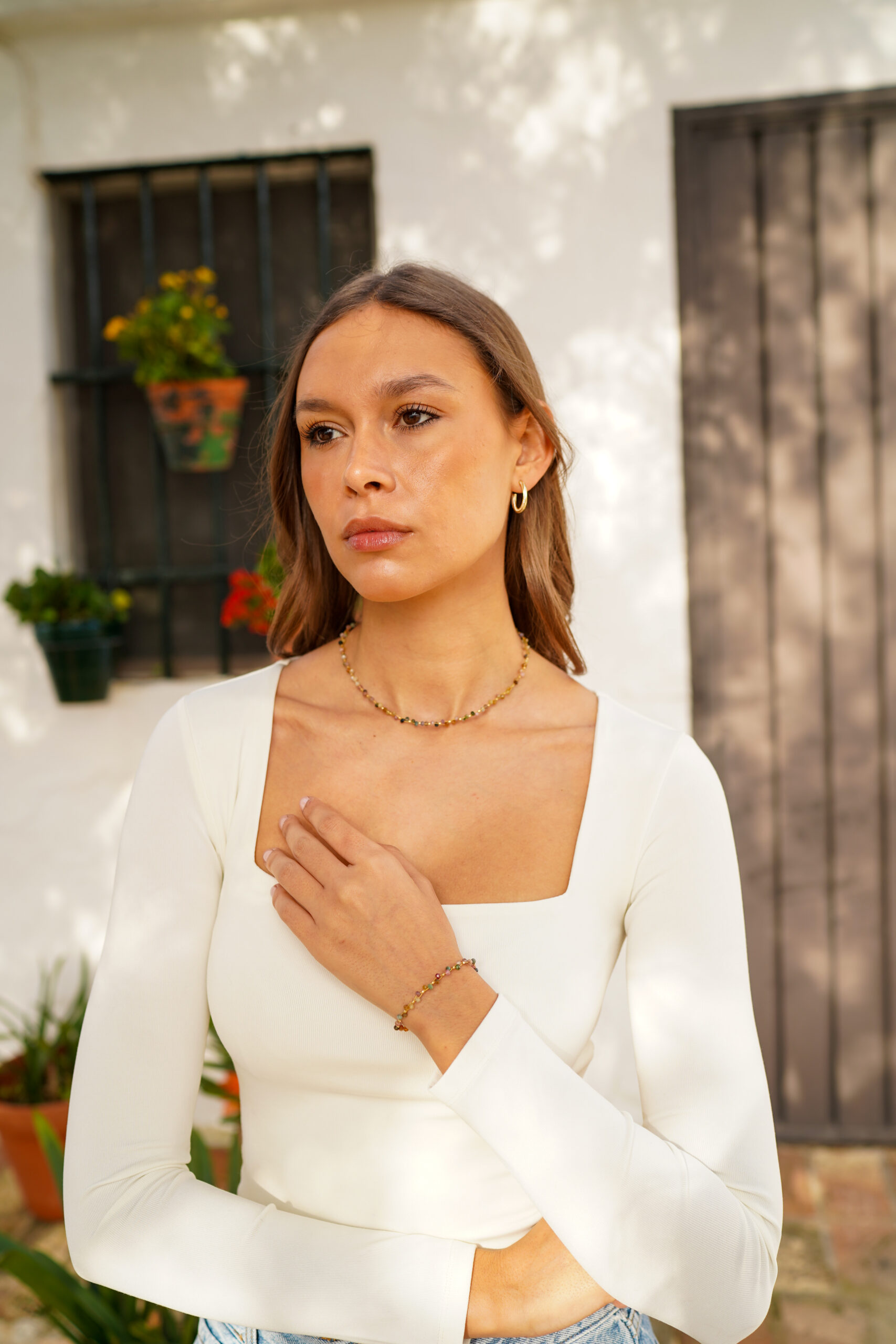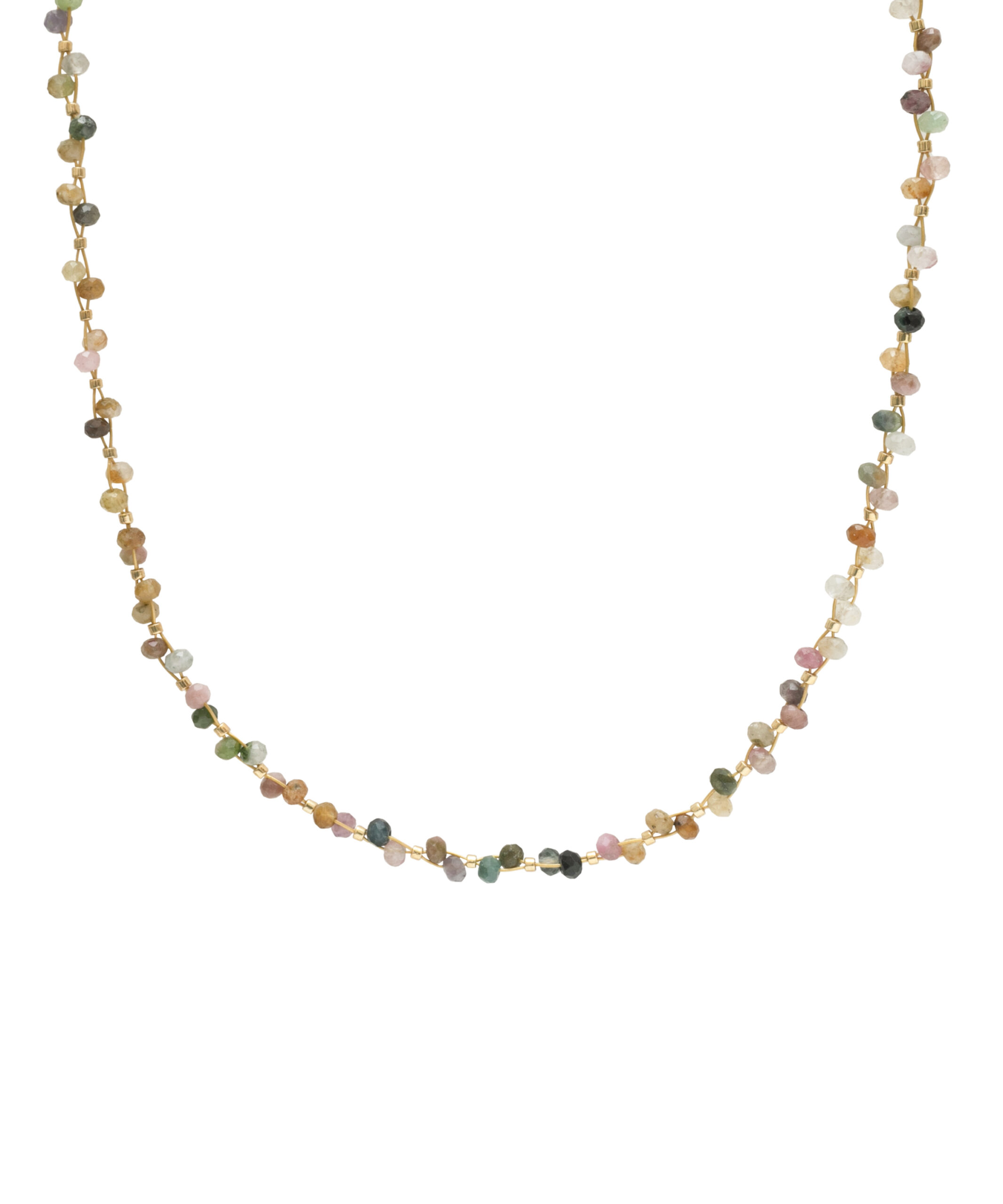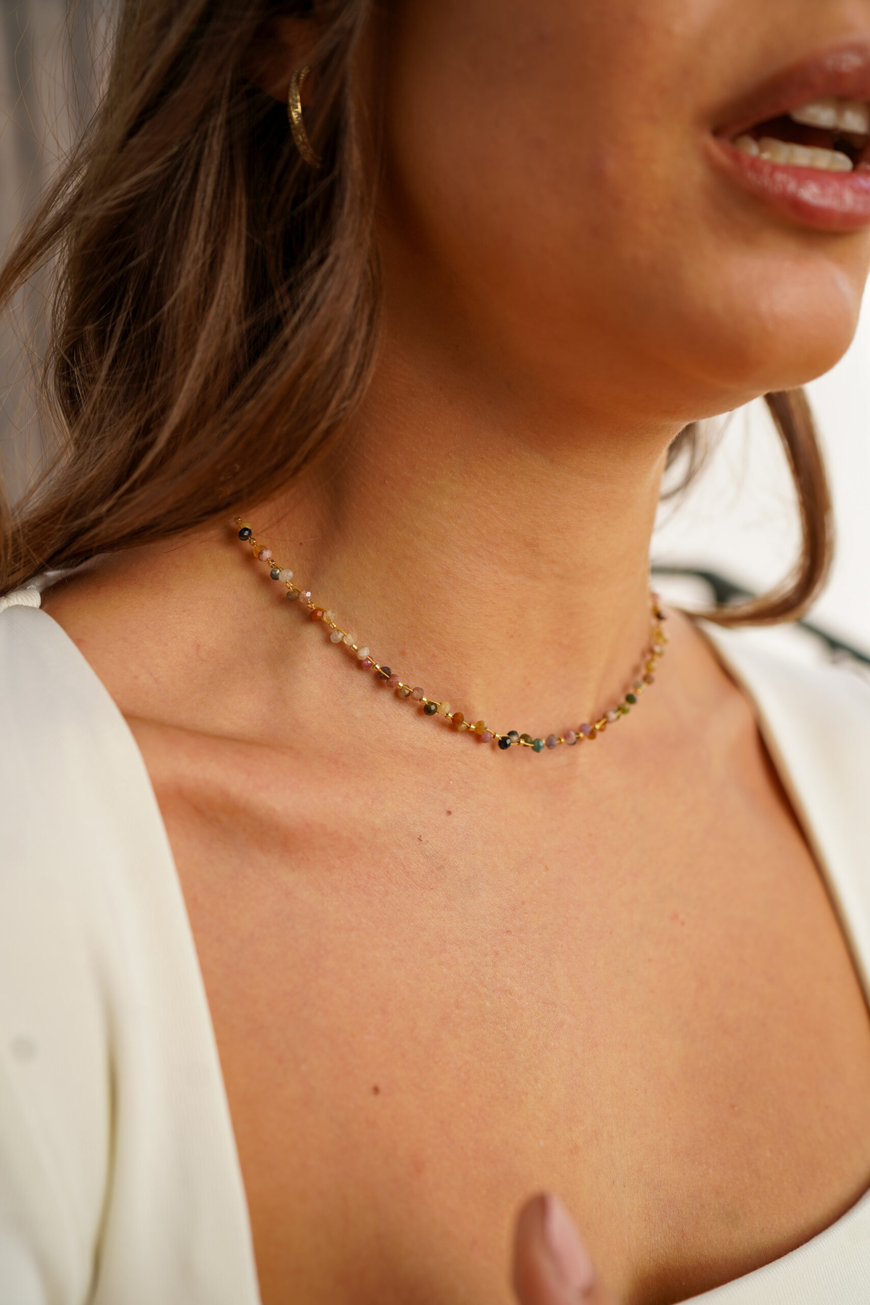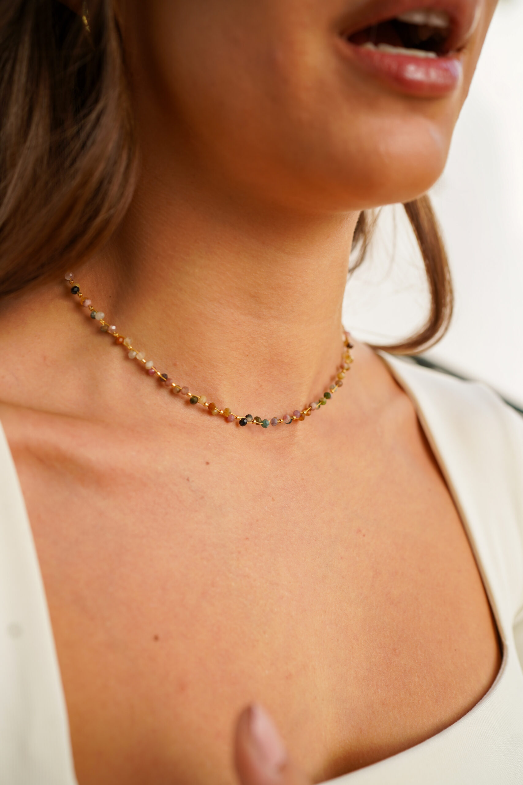 Collar en plata de ley chapado en oro con un trenzado de piedras turmalina en todo su recorrido.