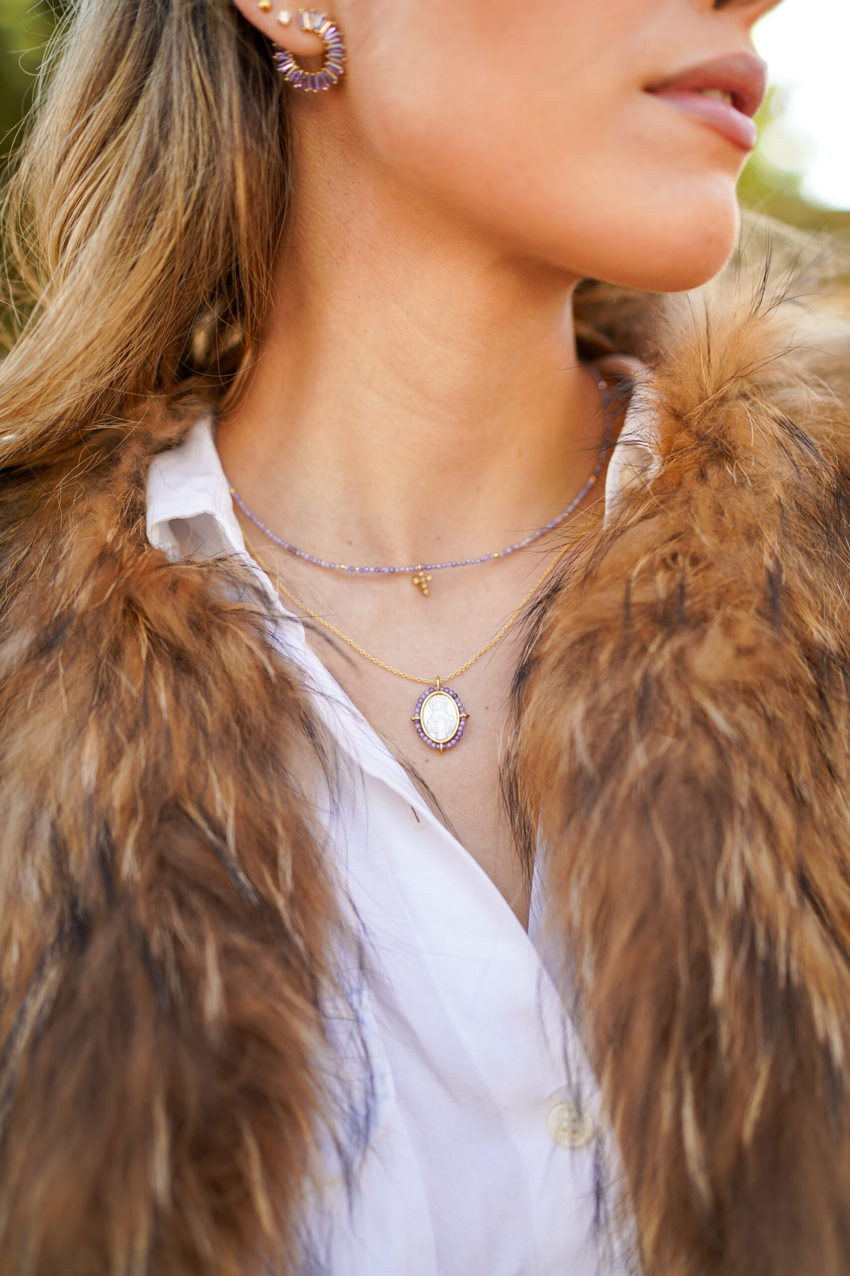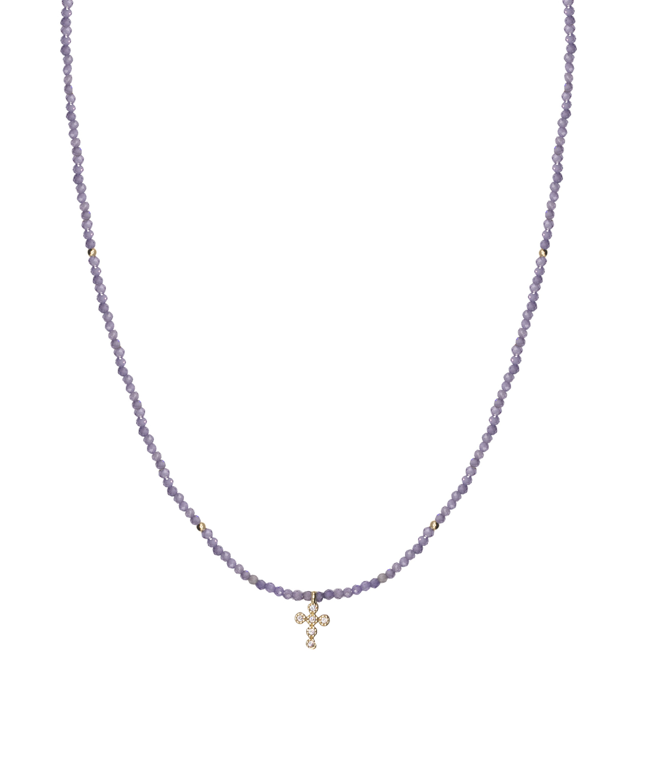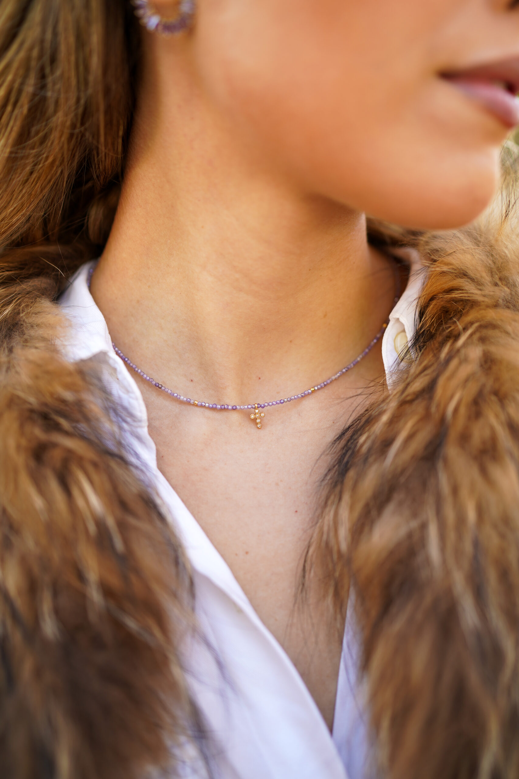Collar de amatistas naturales en plata de ley chapado en oro con colgante en forma de cruz compuesta por circonitas.