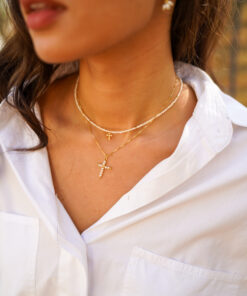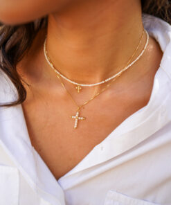 Collar de perlas naturales en plata de ley chapado en oro con colgante en forma de cruz compuesta por circonitas.