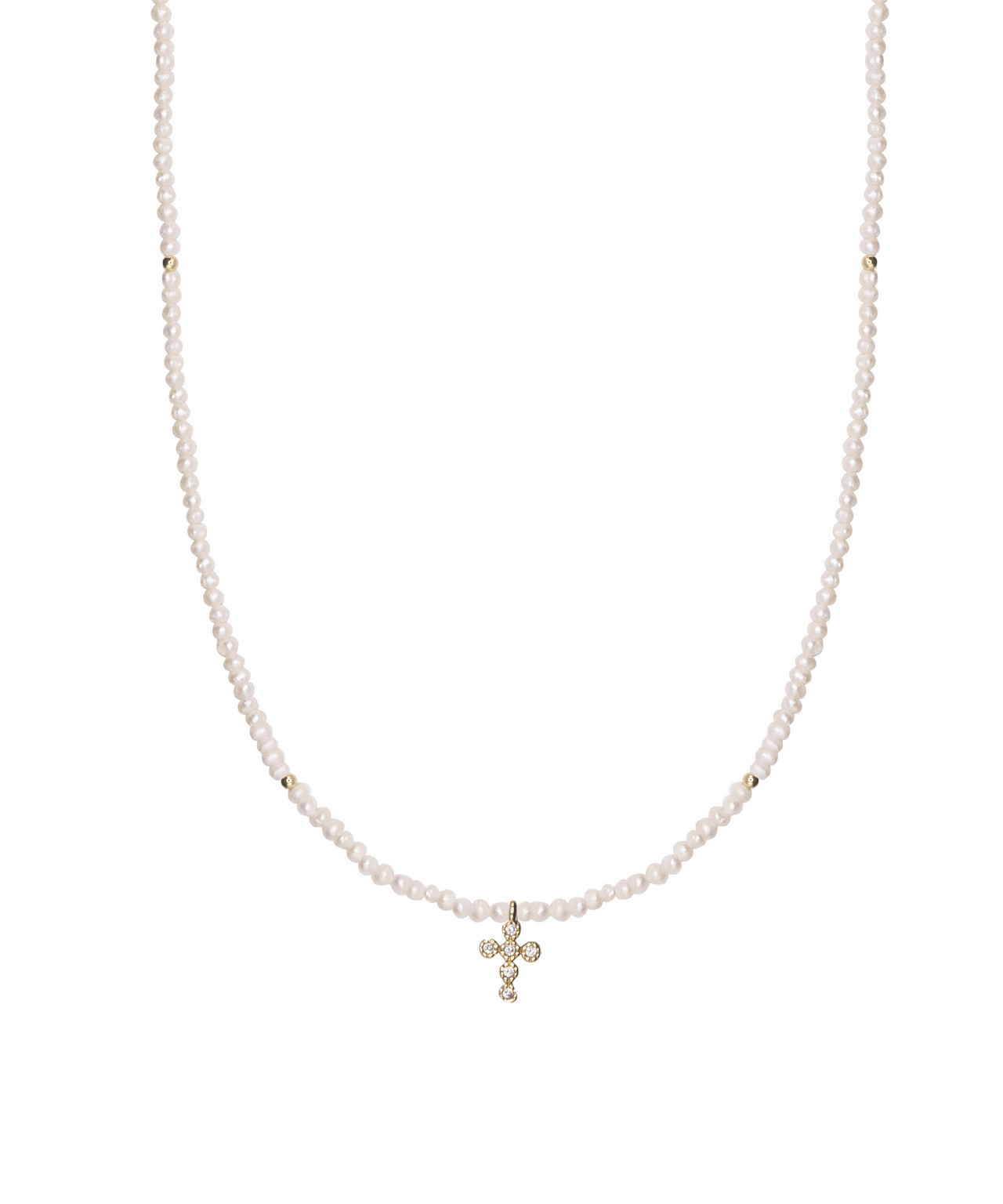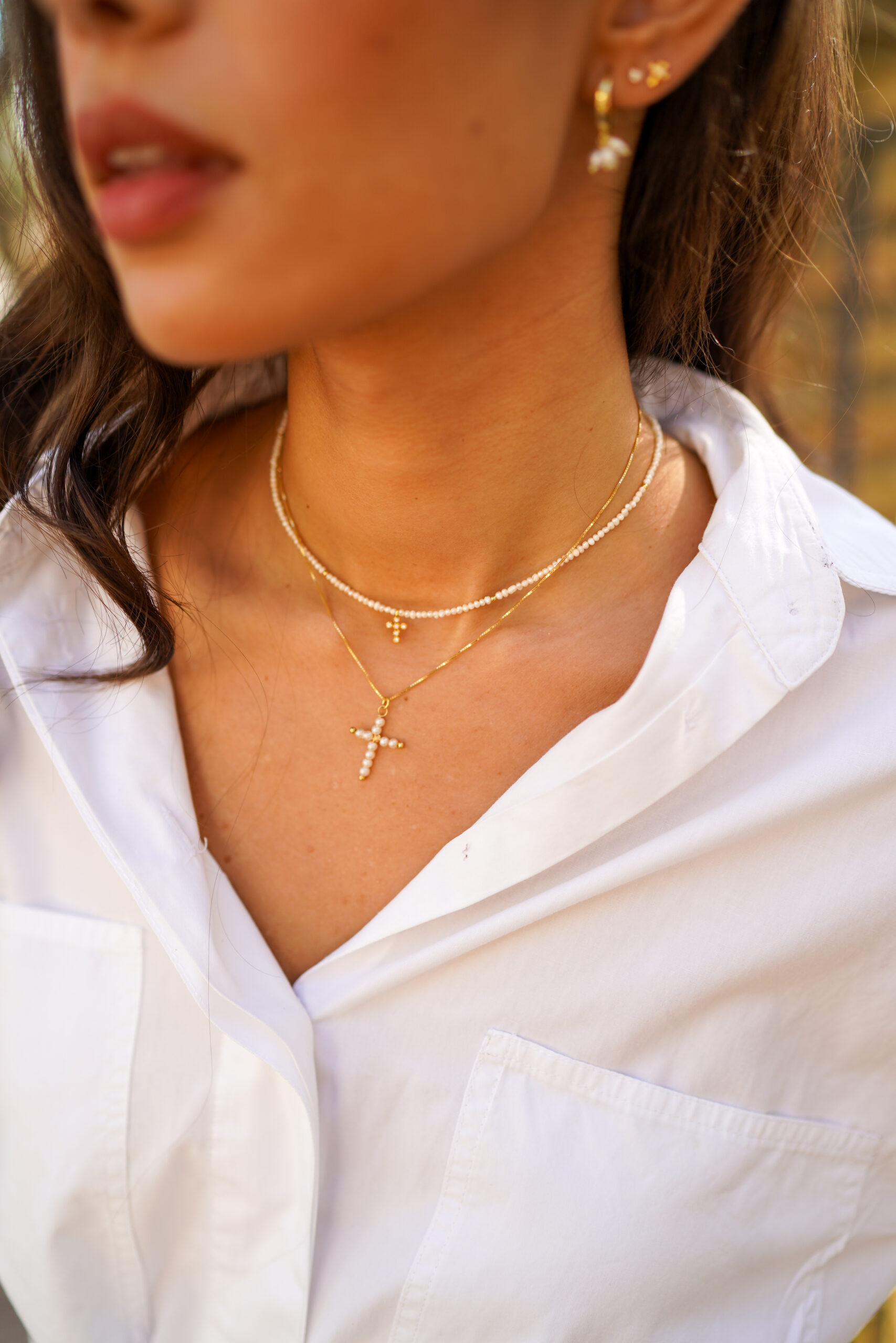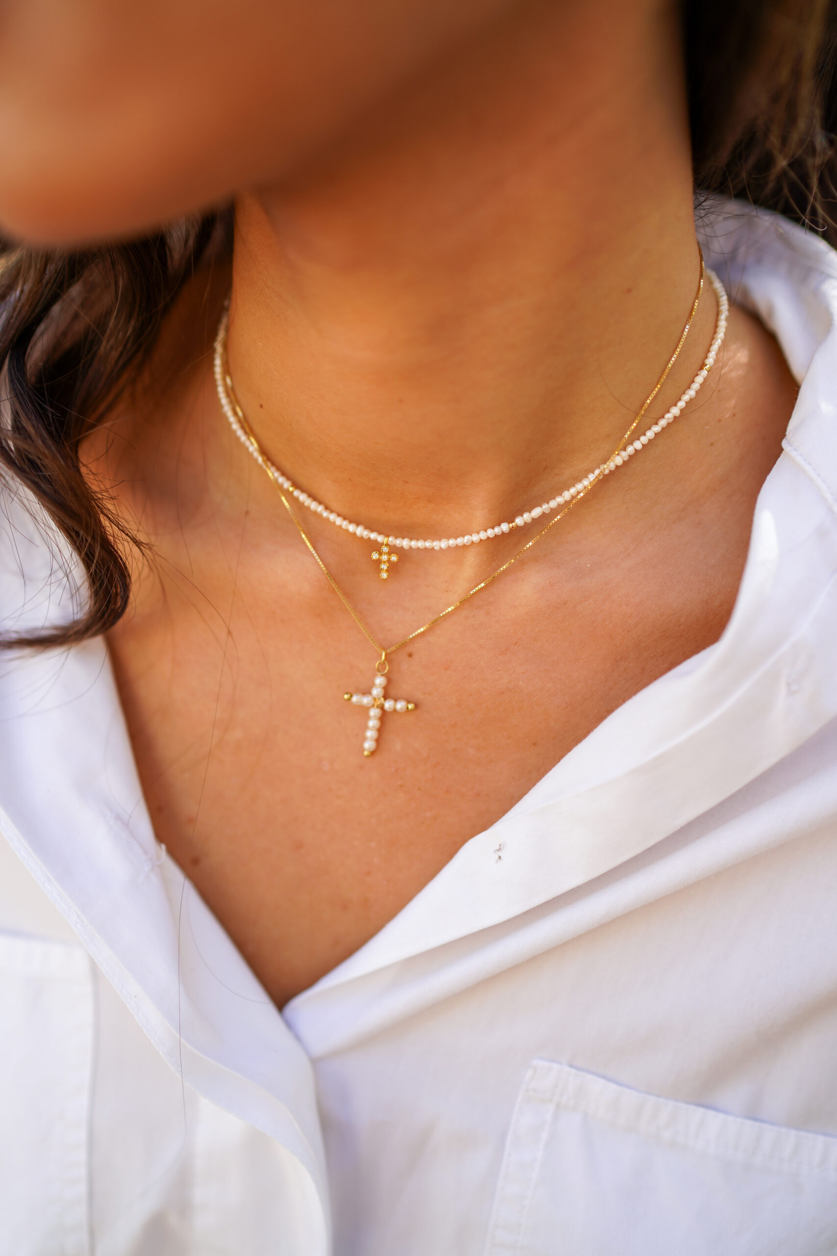 Collar de perlas naturales en plata de ley chapado en oro con colgante en forma de cruz compuesta por circonitas.