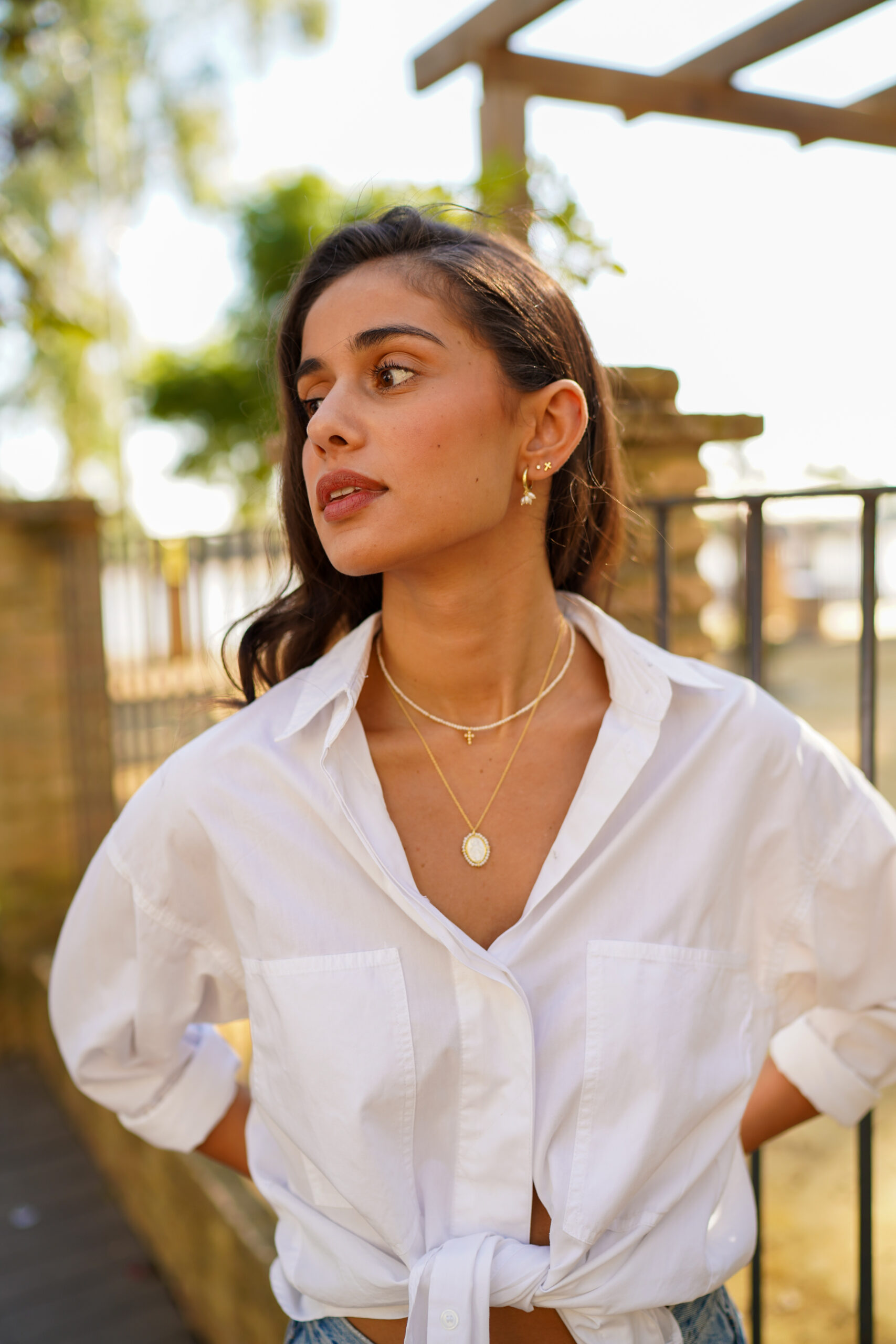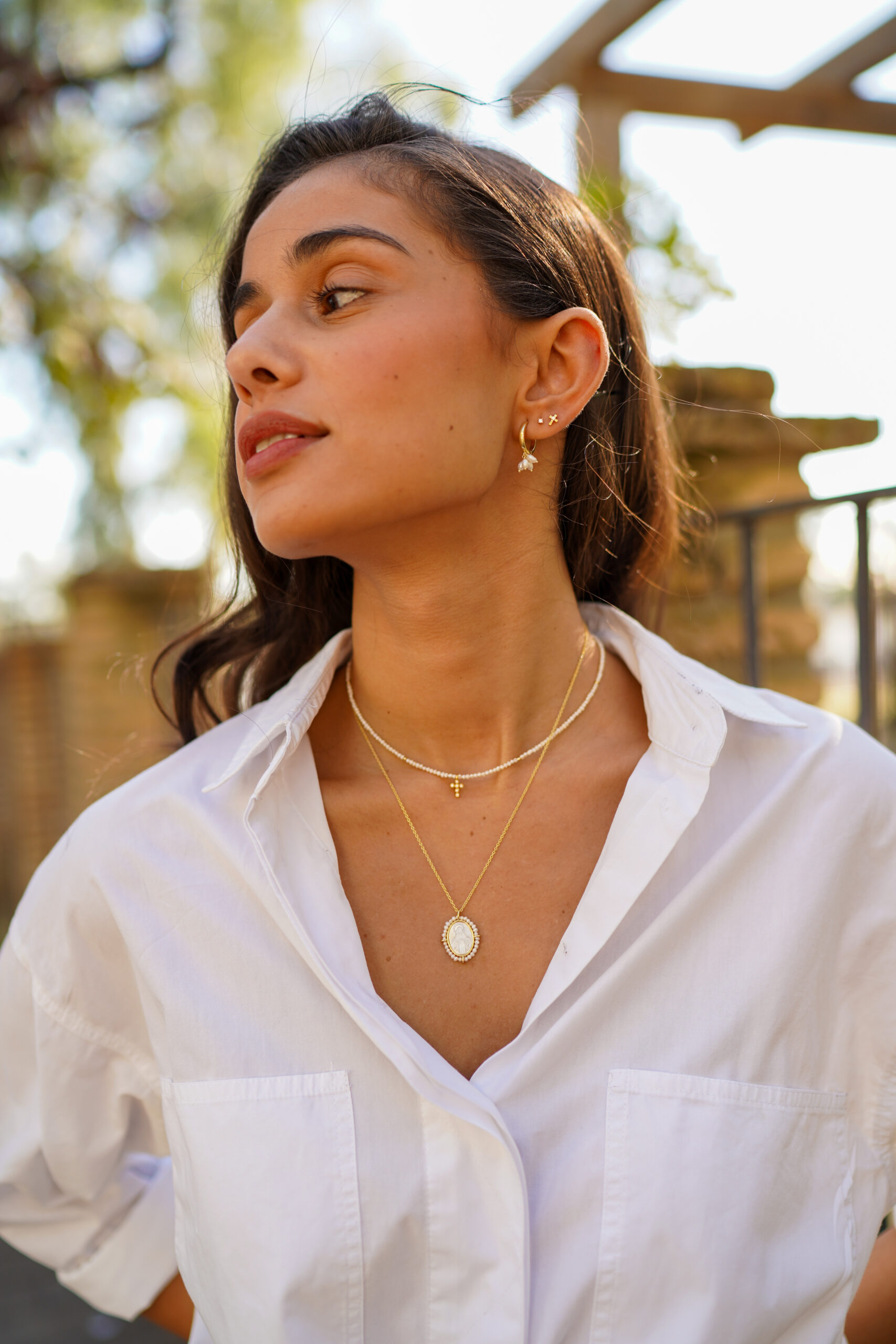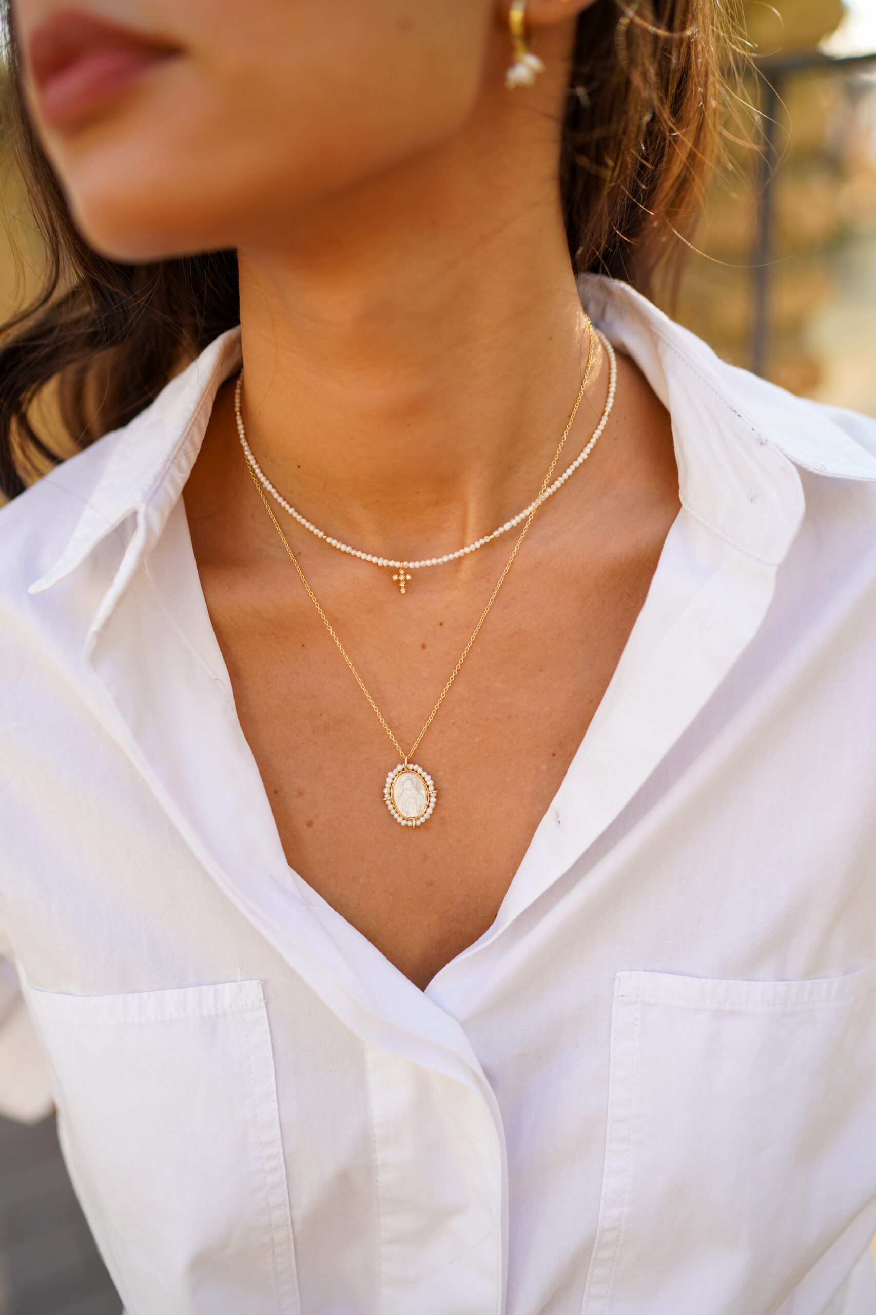 Collar de perlas naturales en plata de ley chapado en oro con colgante en forma de cruz compuesta por circonitas.