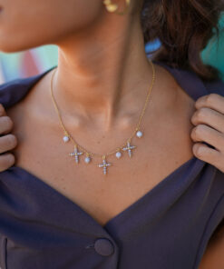 Collar en plata de ley chapado en oro con cuatro bolas y tres cruces de agua marina natural colgando.