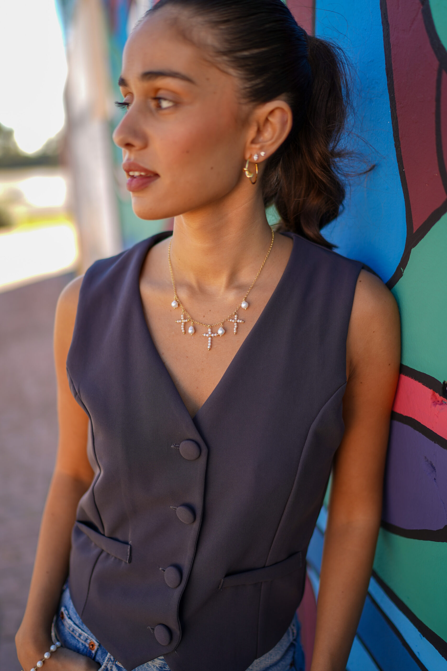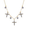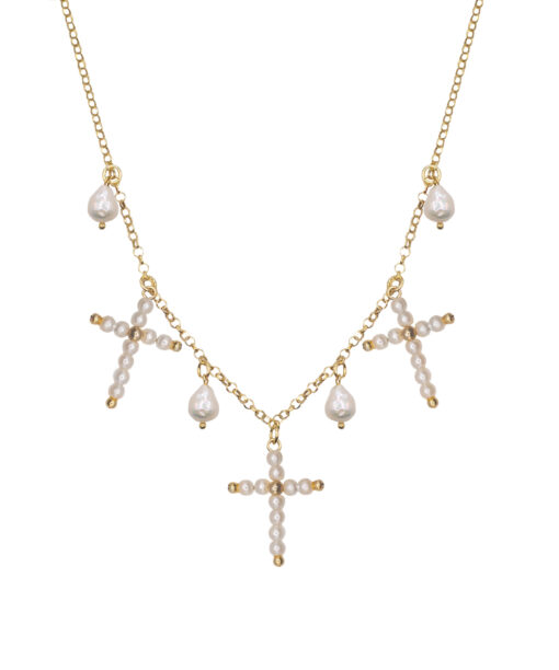 Collar en plata de ley chapado en oro con cuatro perlas naturales y tres cruces de perlas naturales colgando.