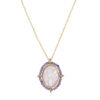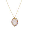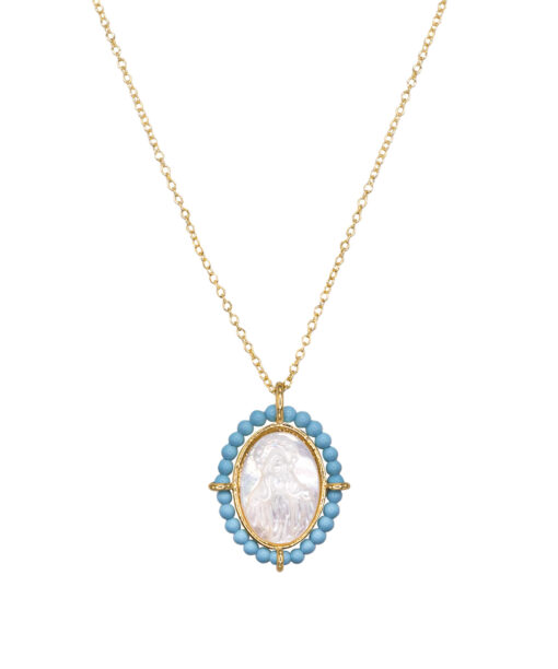 Collar en plata de ley chapado en oro con colgante ovalado hecho de madreperla tallada en el que se representa a la Virgen Milagrosa y envuelto a su vez por un aro de turquesas naturales.