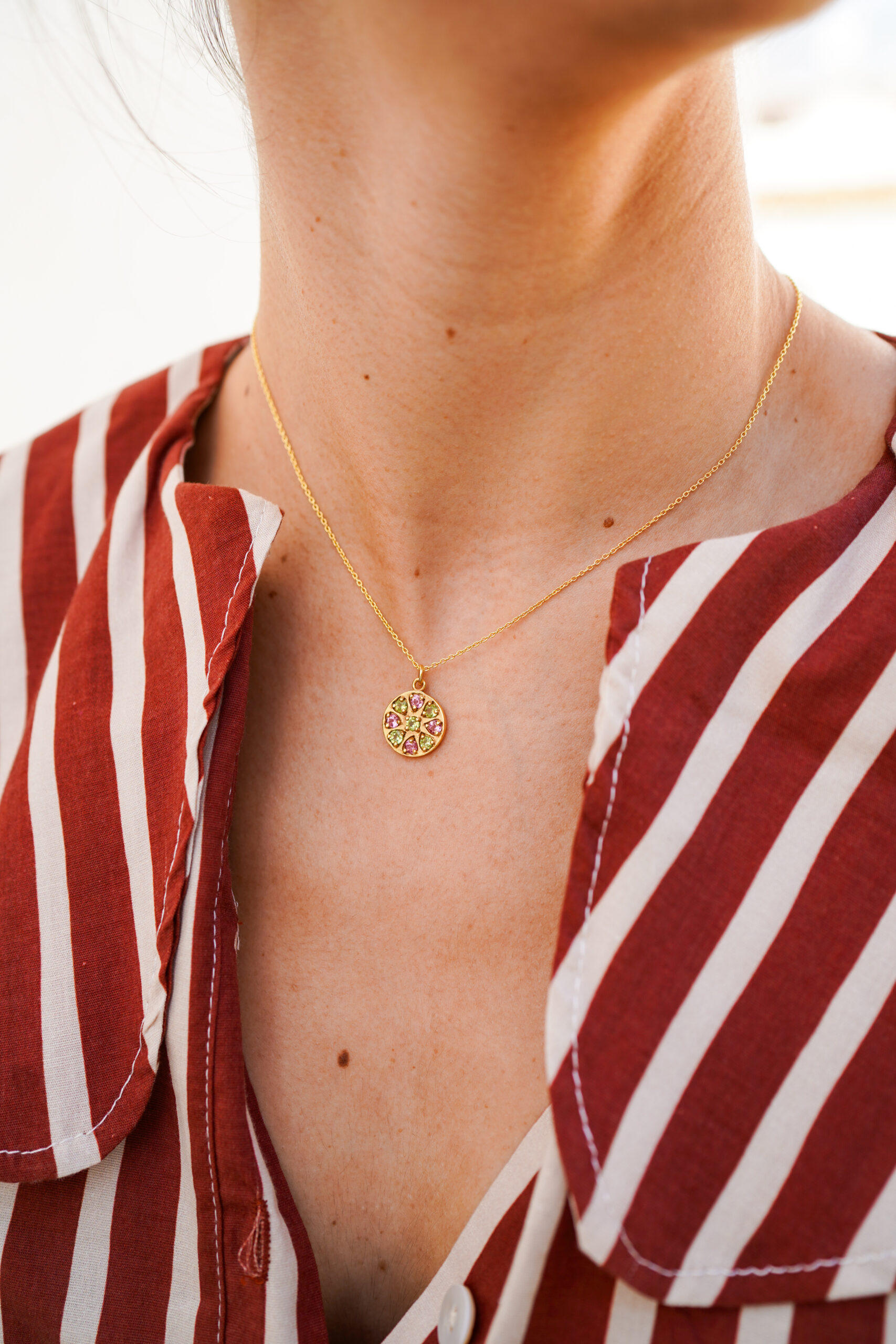 Collar en plata de ley chapado en oro con colgante en forma circular alternando circonitas de color rosa y verde manzana a modo de rosetón.