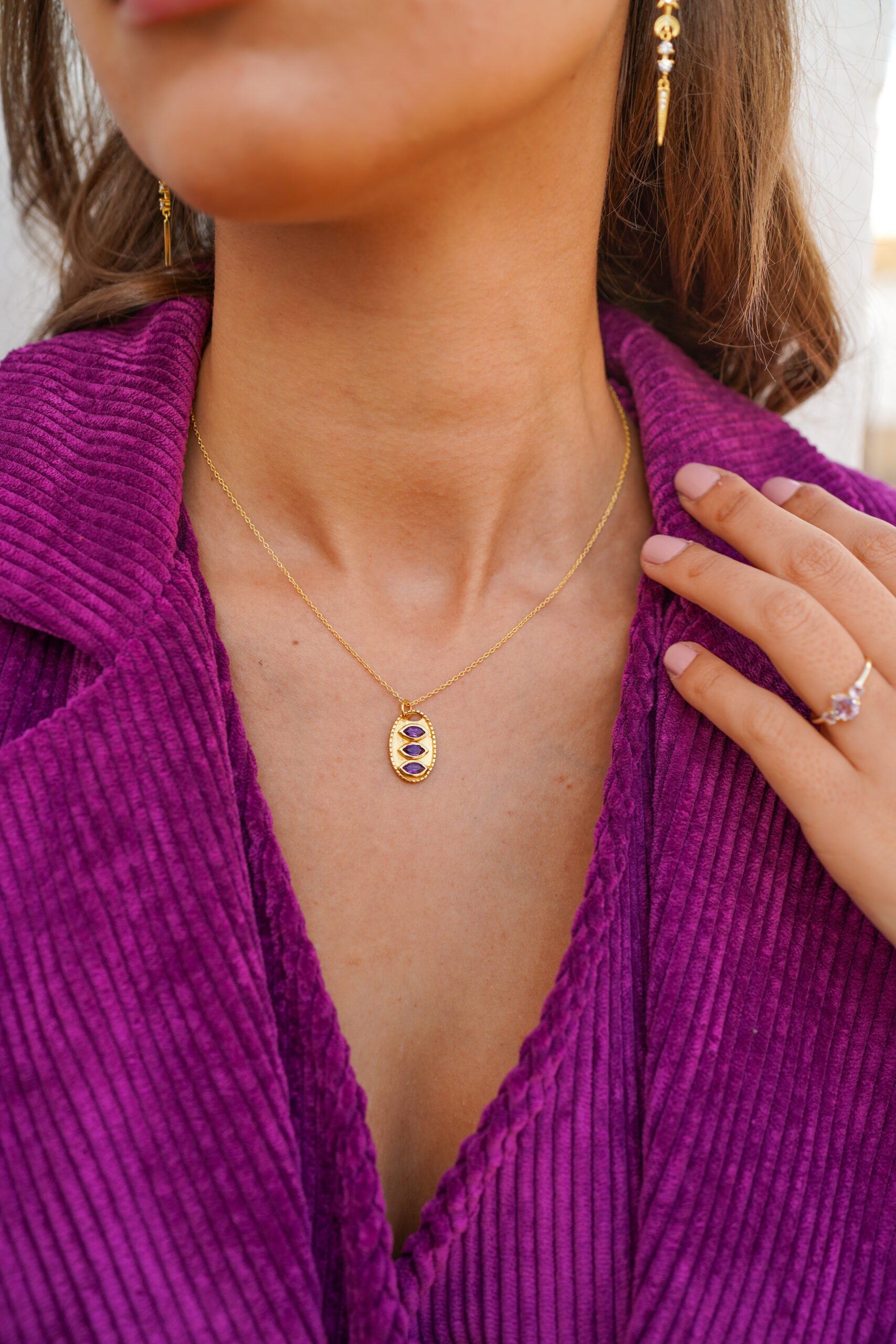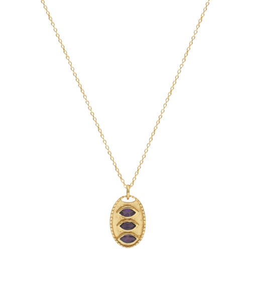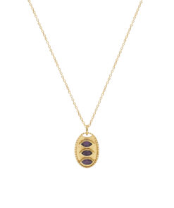 Collar en plata de ley chapado en oro con colgante en forma ovalada con un trío de piedras amatistas.