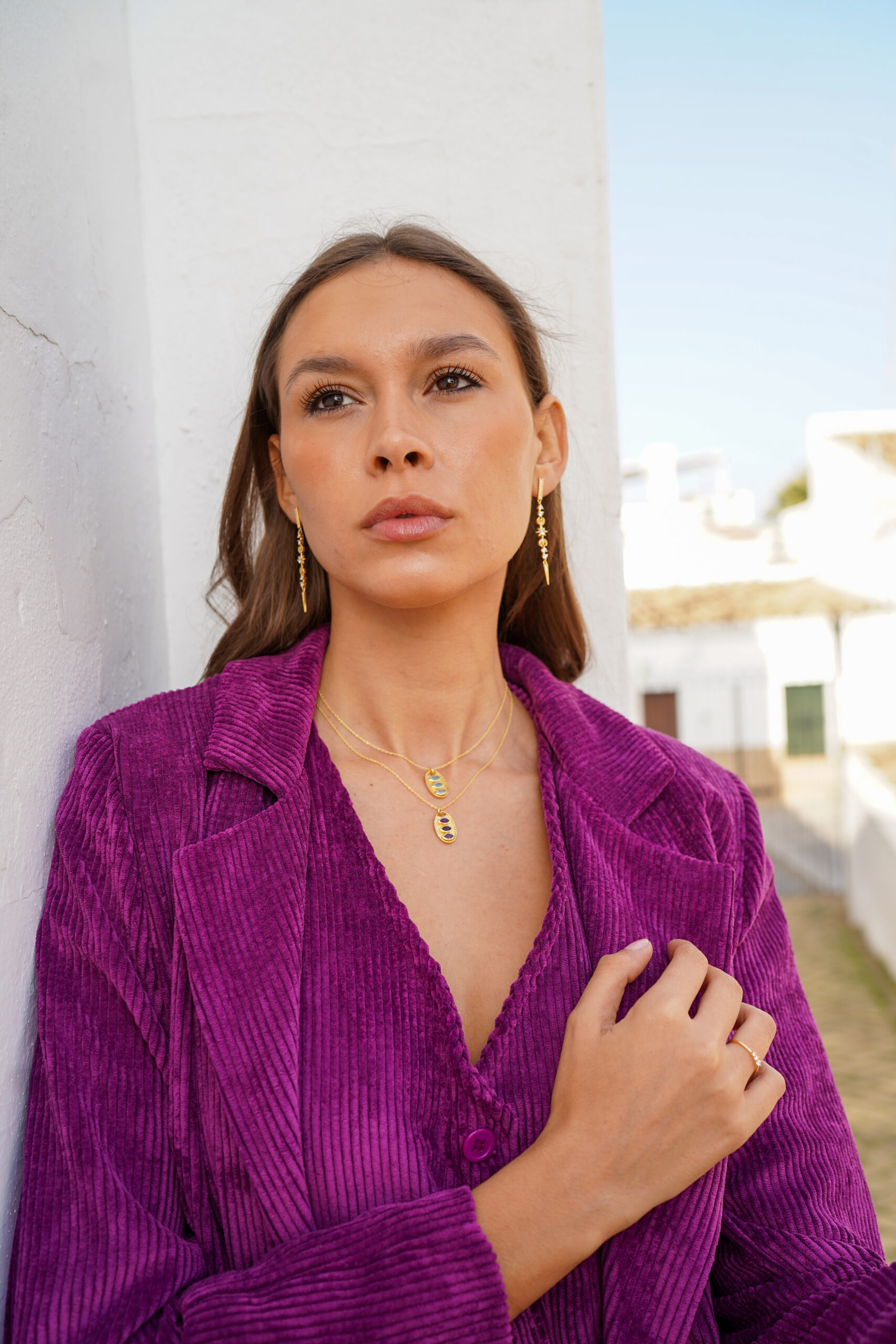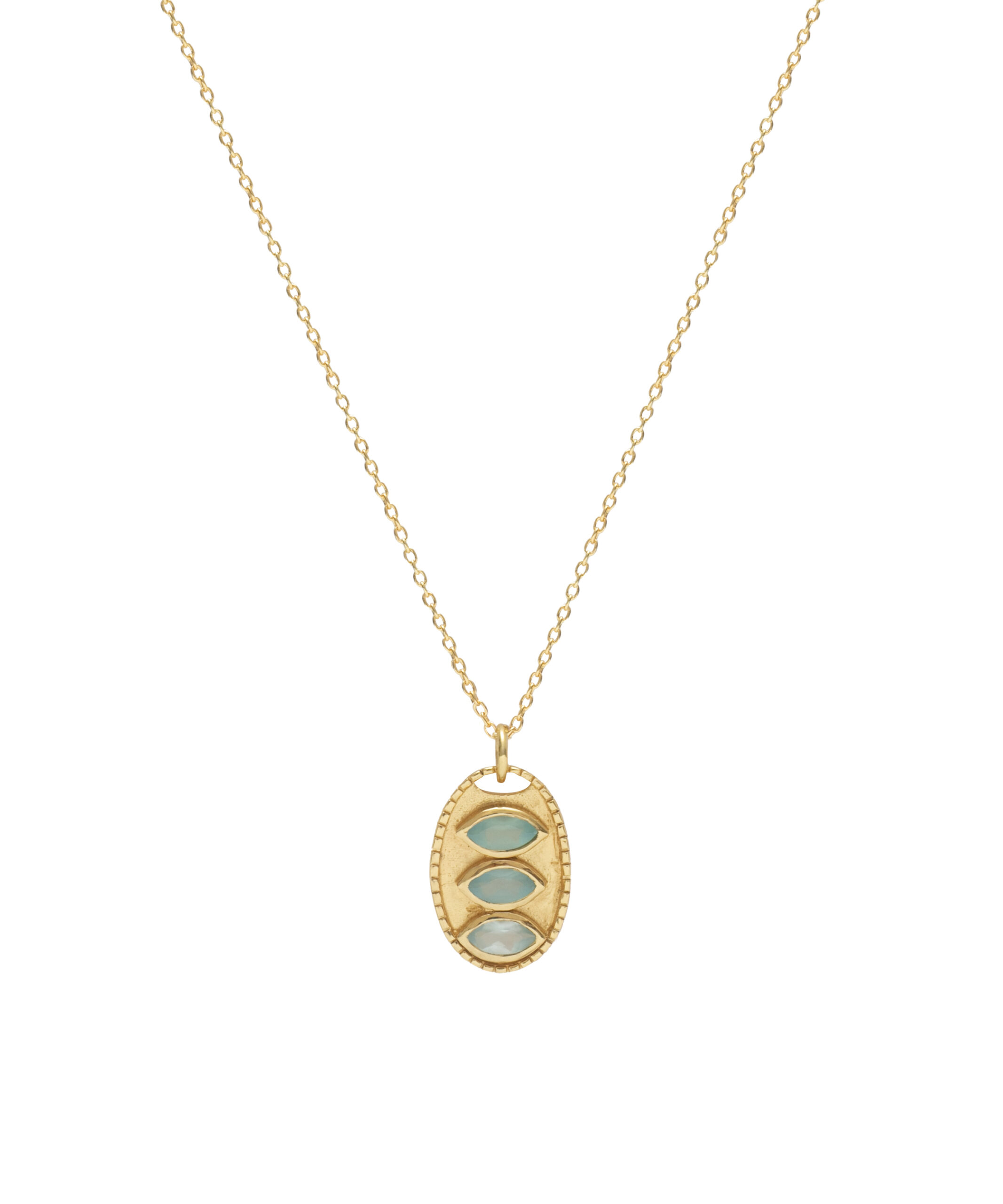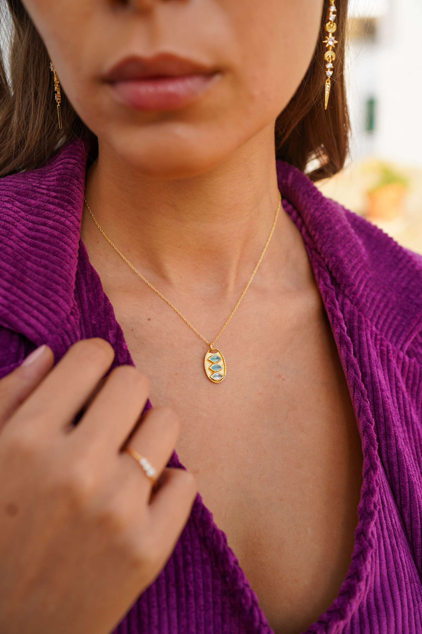 Collar en plata de ley chapado en oro con colgante en forma ovalada con un trío de piedras calcedonia.