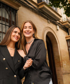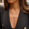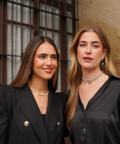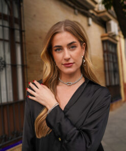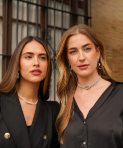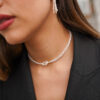 Collar de plata de ley chapada en oro, formado por dos finas hileras de pequeñas perlas grises cultivadas que se encuentran en un delicado nudo central. Una pieza suave, luminosa y muy femenina, ideal para elevar cualquier look con un toque clásico y atemporal.