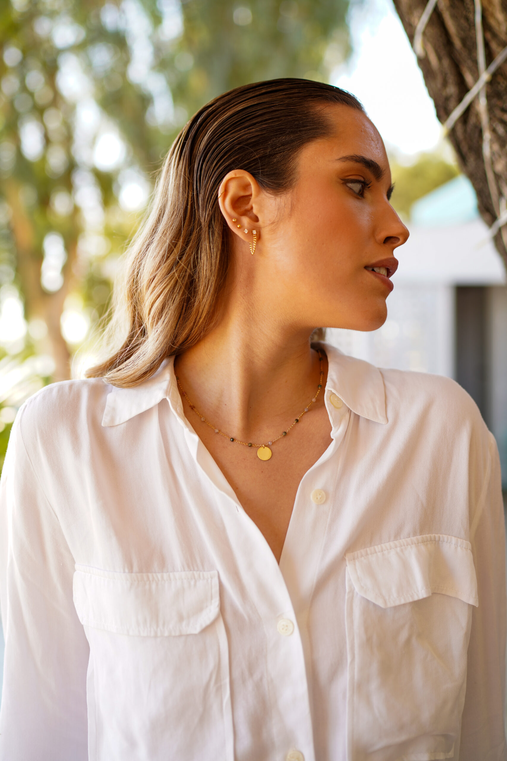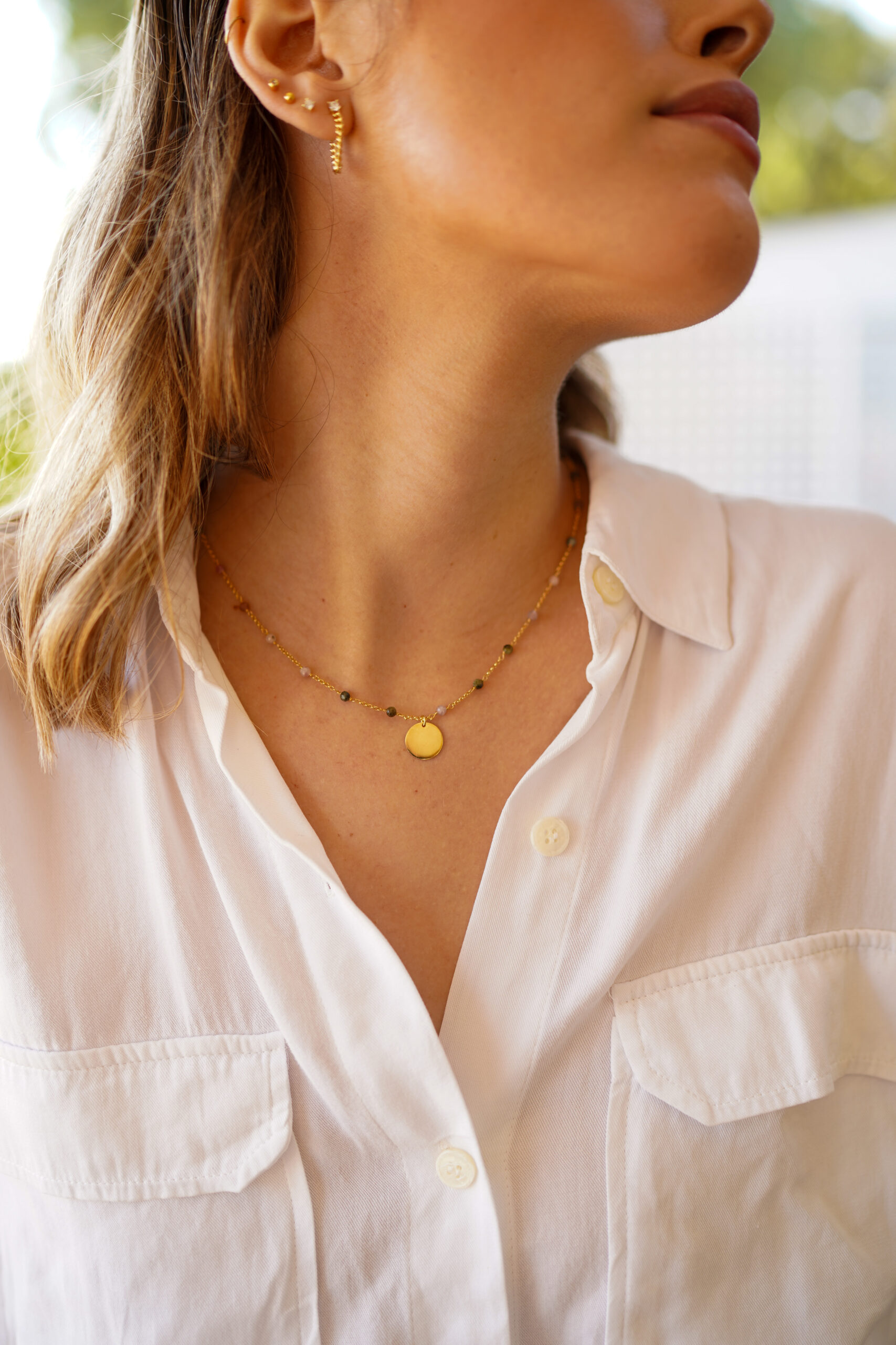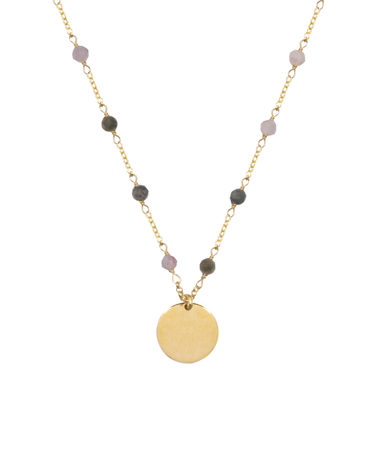 Collar de turmalinas naturales en plata de ley chapado en oro con colgante de forma circular liso.