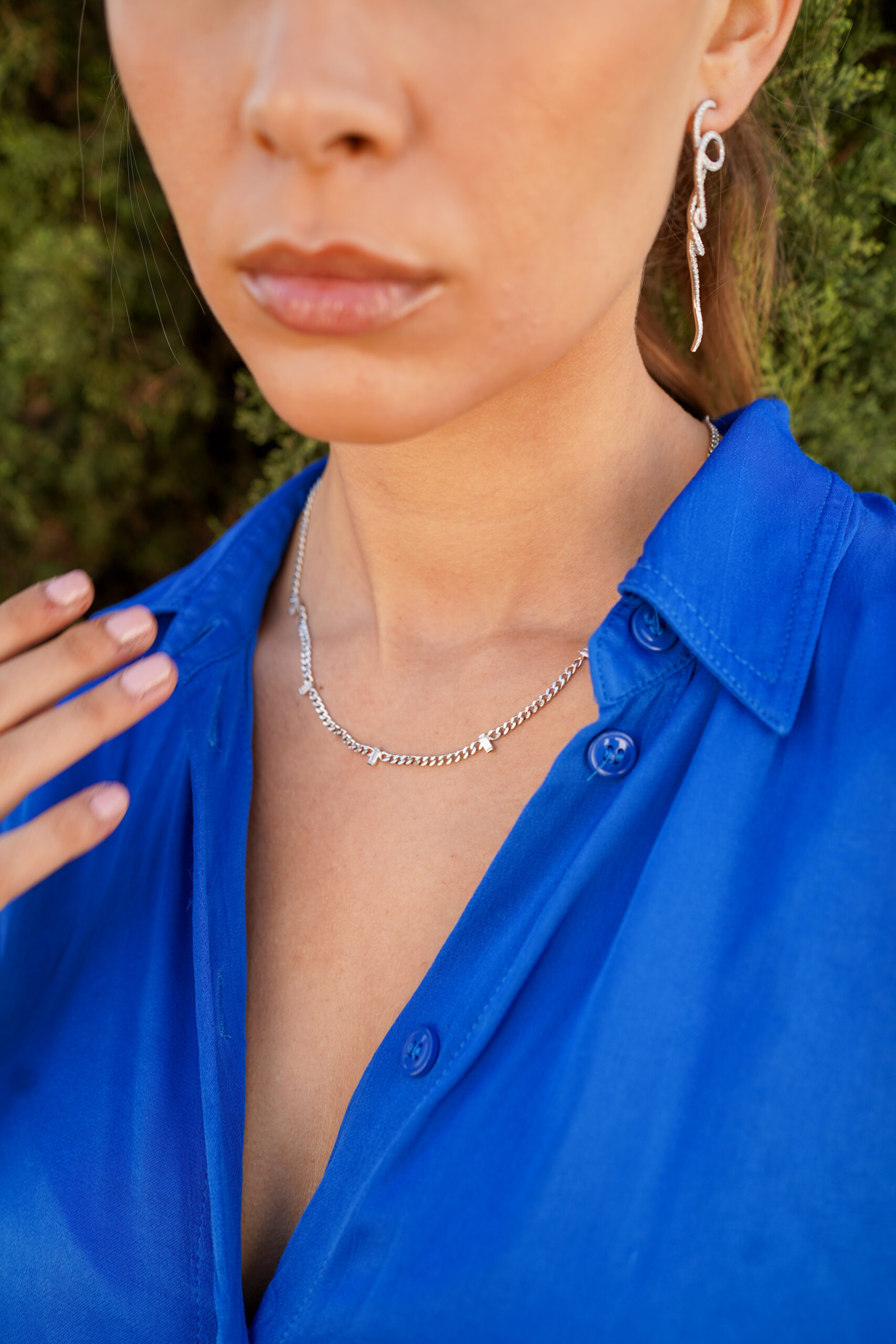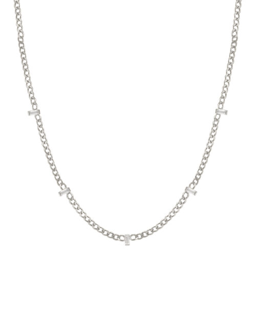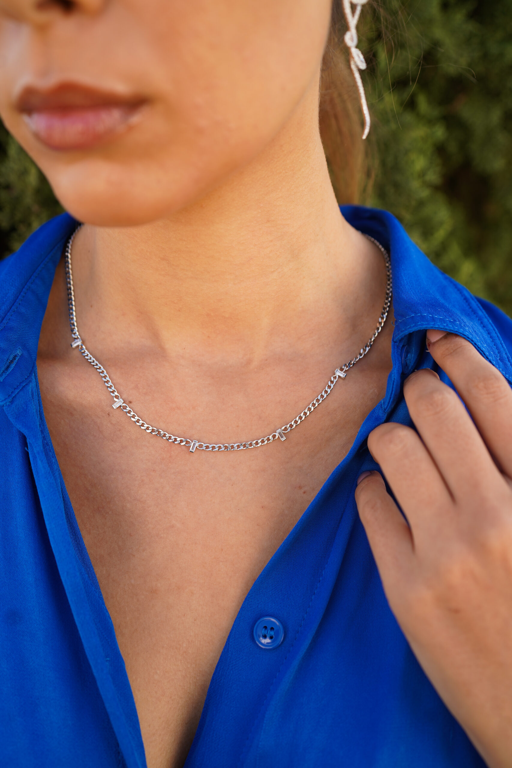 Collar en plata de ley con cinco circonitas talla baguette separadas por tramos de cadena tipo barbada.