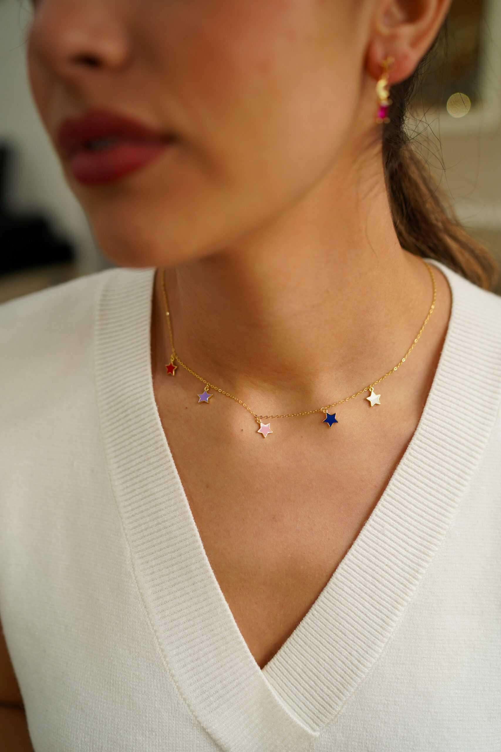 Collar en plata de ley chapado en oro, decorado con pequeñas estrellas esmaltadas en tonos vibrantes —rojo, azul marino, blanco, lila y rosa— que aportan alegría, movimiento y un toque divertido al look. Su cadena fina y ligera resalta la caída de cada charm, creando una pieza versátil, juvenil y llena de luz.