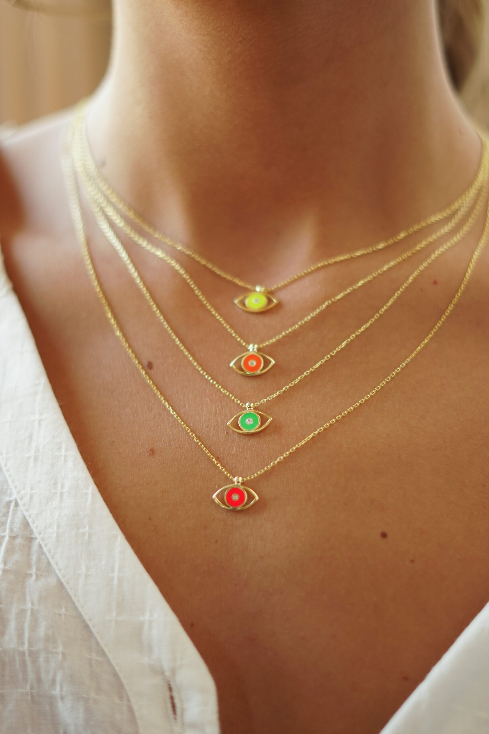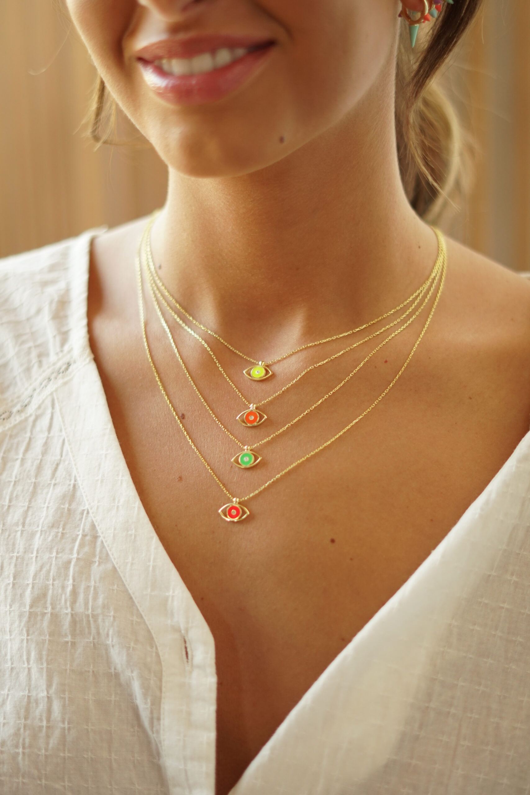 Collar en plata de ley chapado en oro con colgante de esmalte de color naranja flúor en forma de ojo.